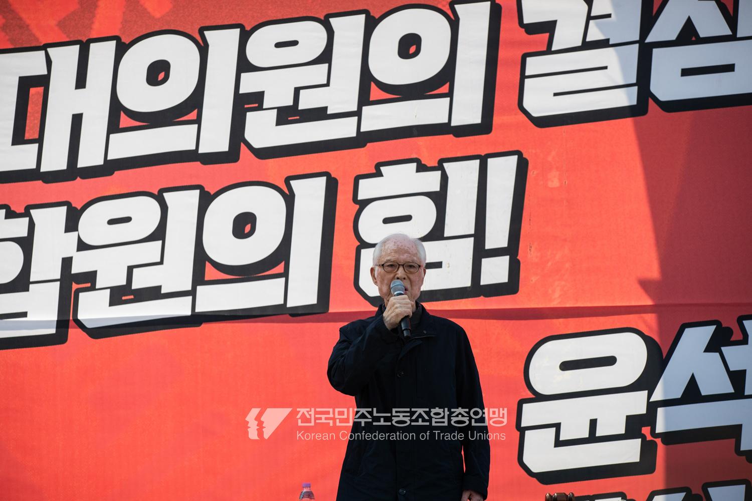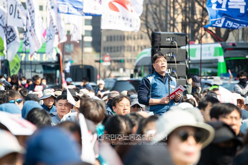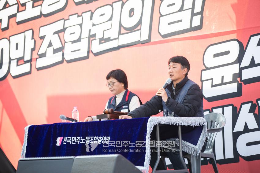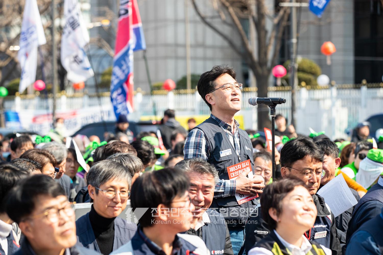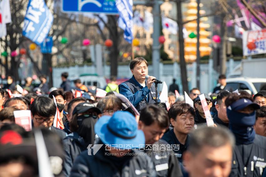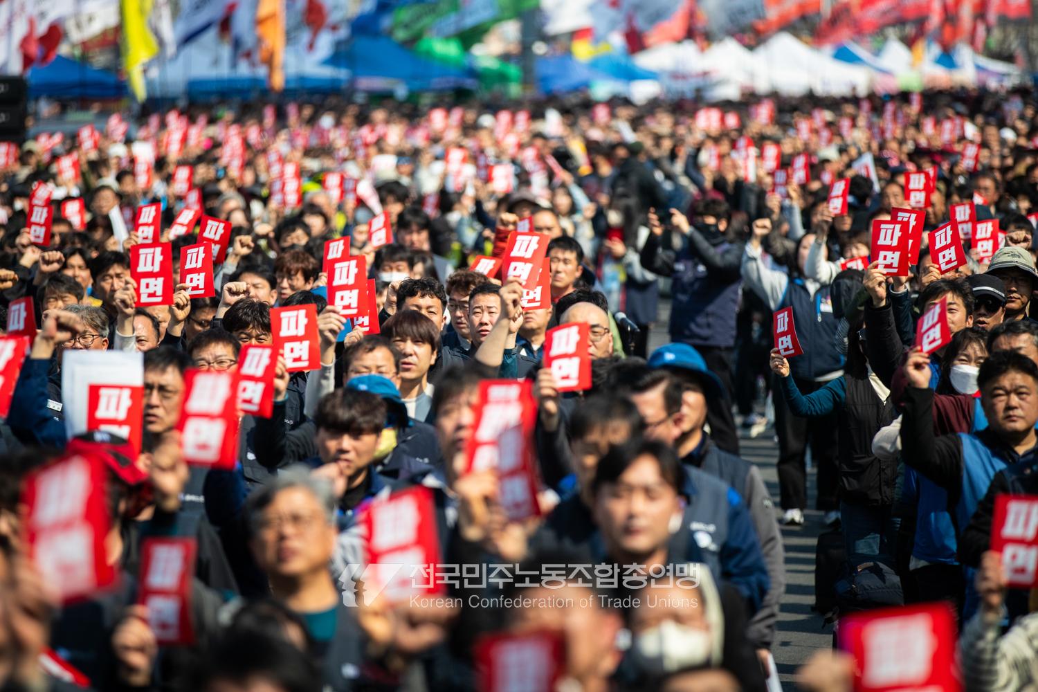 “기각이면 항쟁이다!” 민주노총 대의원들이 2025년 4월3일 오후 서울 광화문 서십자각 인근에서 제83차 임시 대의원대회를 열고 윤석열 탄핵 기각 시 즉각 투쟁에 돌입할 것을 결의했다. 헌법재판소의 8:0 전원일치 파면을 예상하면서도 상식을 뒤엎는 결정이 나오면 민주노총 또한 즉각 거리에 나와 민주주의를 사수하겠다는 의지다. 광장 대의원대회 안건은 ’윤석열 파면 투쟁 결의 건’ 단일 안건으로, 수정을 거쳐 대의원 만장일치로 통과했다. 탄핵 기각 시 즉각 전조직 총파업 투쟁에 돌입하고 탄핵 인용 시 5일 민주노총 조합원들은 각 지역에서 윤석열 파면 승리대회를 열기로 했다. 광장 대의원대회는 민주노총 산별노조 대표자들 모두의 결의 발언을 마지막으로 마무리됐다.
