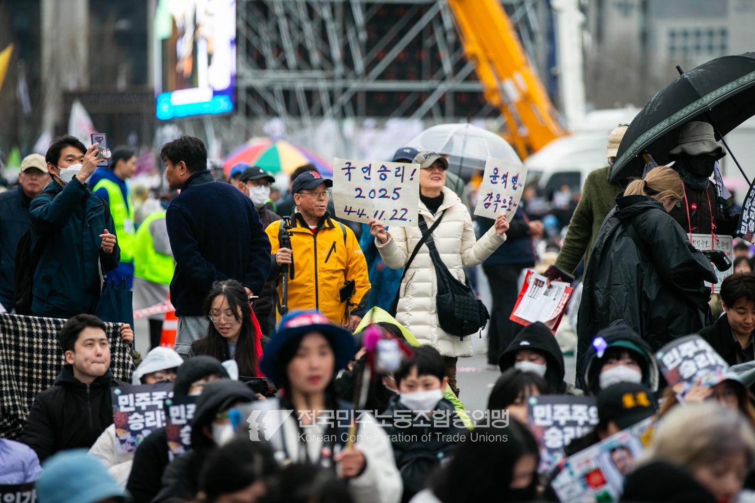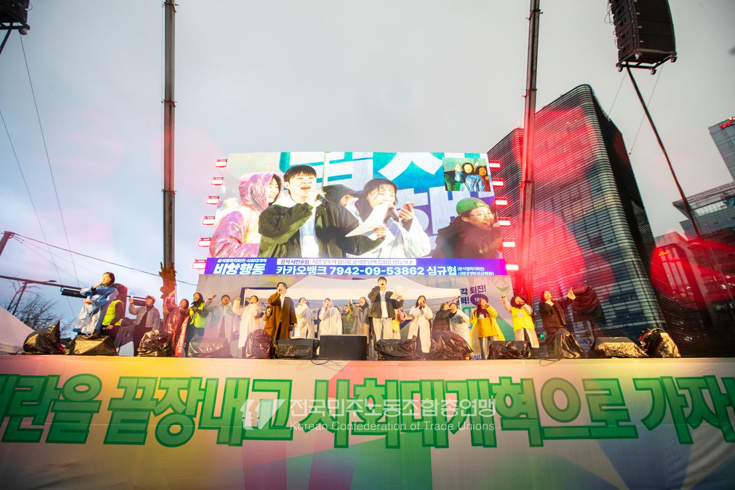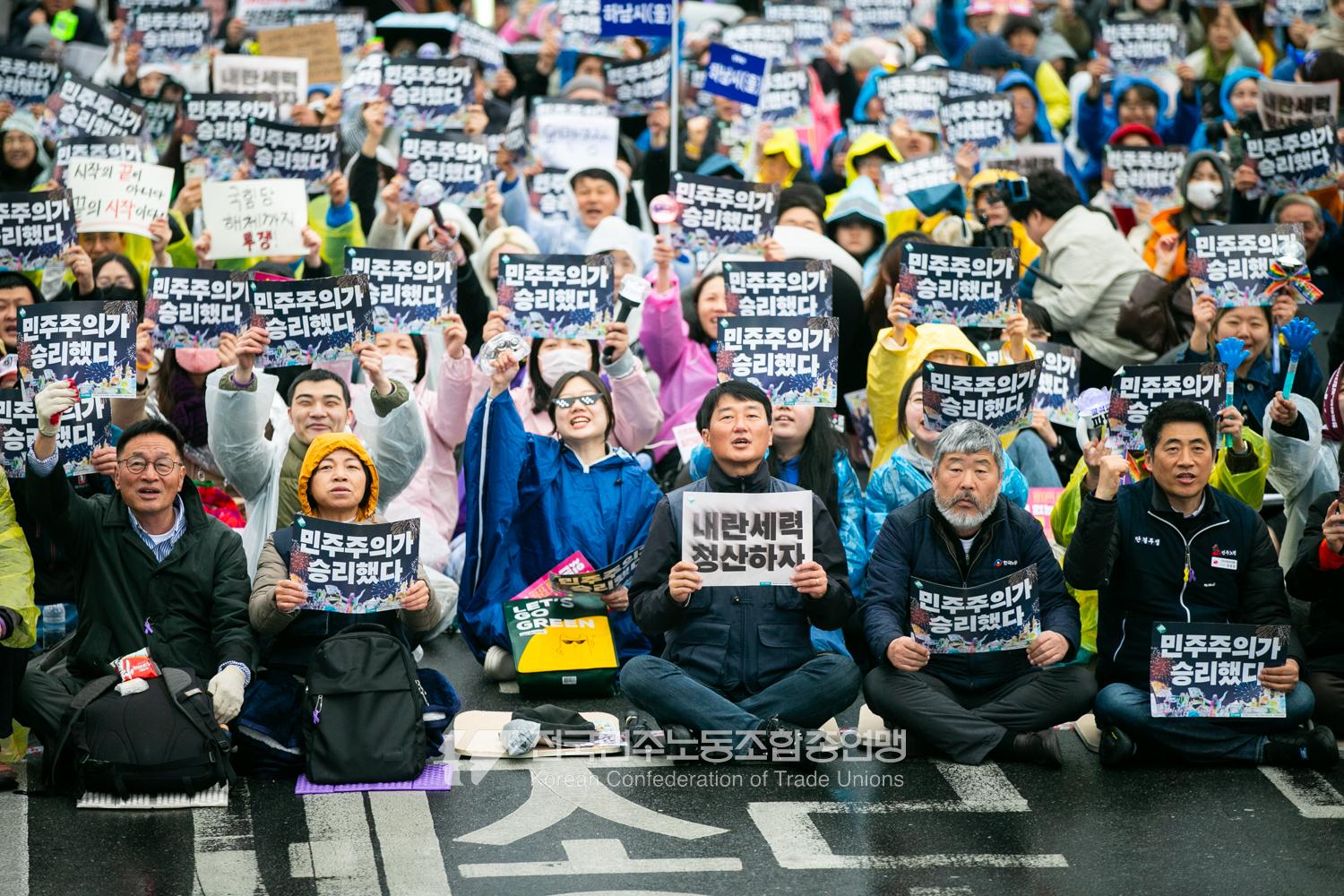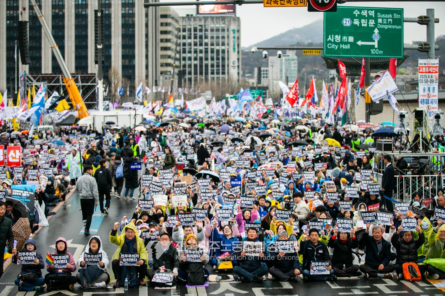 윤석열즉각퇴진・사회대개혁 비상행동은 윤석열이 파면된 다음날 제18차 범시민대행진을 서울 광화문 동십자각에서 열었다. 123일 동안 거짓과 폭력, 혐오에 맞선 진실과 연대, 빛의 혁명이 승리를 만들어냈다. 민주노총도 범시민대행진에 함께하며 “파면은 끝이 아니라 새로운 시작이다. 내란세력 청산과 새로운 사회를 향해 함께 나아가자”라고 결의를 다졌다. 2024년 12월3일 윤석열 비상계엄으로부터 123일이 지난 2025년 4월4일 시민들은 대통령 윤석열을 파면했다. 비상계엄 이튿날 오전 윤석열 퇴진으로 국민주권을 실현하고자 전면적 저항운동을 선포한 비상행동 또한 이날 범시민대행진까지 123일간 투쟁하며 민주주의의 승리를 가져왔다.