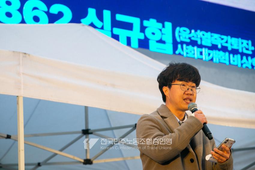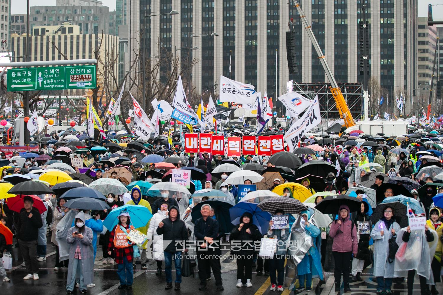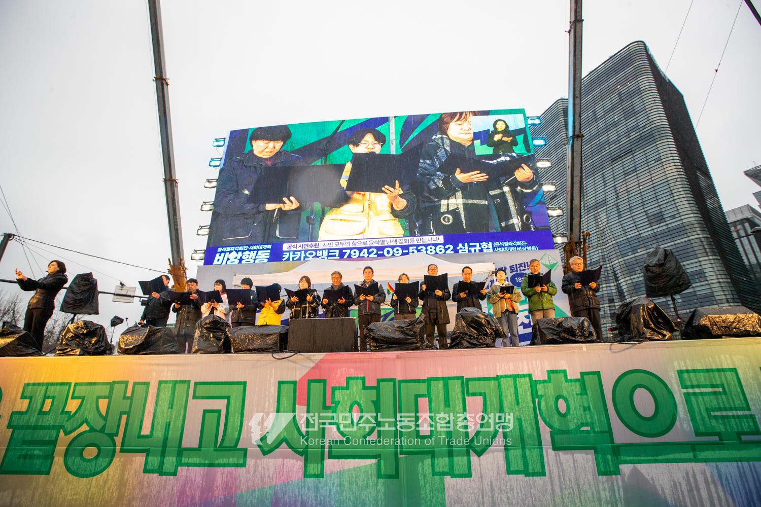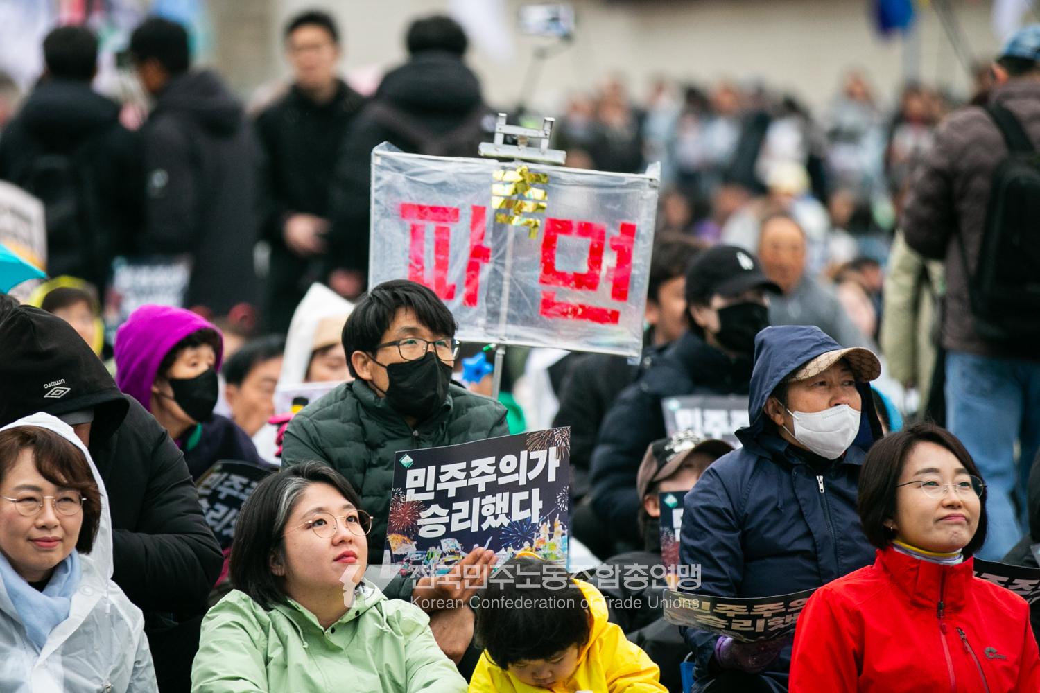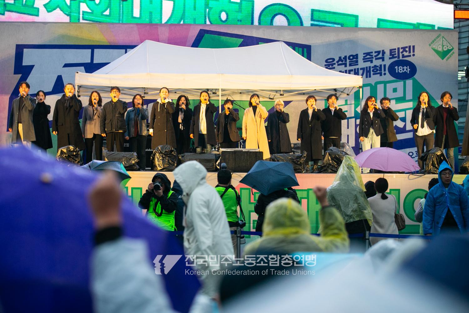 윤석열즉각퇴진・사회대개혁 비상행동은 윤석열이 파면된 다음날 제18차 범시민대행진을 서울 광화문 동십자각에서 열었다. 123일 동안 거짓과 폭력, 혐오에 맞선 진실과 연대, 빛의 혁명이 승리를 만들어냈다. 민주노총도 범시민대행진에 함께하며 “파면은 끝이 아니라 새로운 시작이다. 내란세력 청산과 새로운 사회를 향해 함께 나아가자”라고 결의를 다졌다. 2024년 12월3일 윤석열 비상계엄으로부터 123일이 지난 2025년 4월4일 시민들은 대통령 윤석열을 파면했다. 비상계엄 이튿날 오전 윤석열 퇴진으로 국민주권을 실현하고자 전면적 저항운동을 선포한 비상행동 또한 이날 범시민대행진까지 123일간 투쟁하며 민주주의의 승리를 가져왔다.