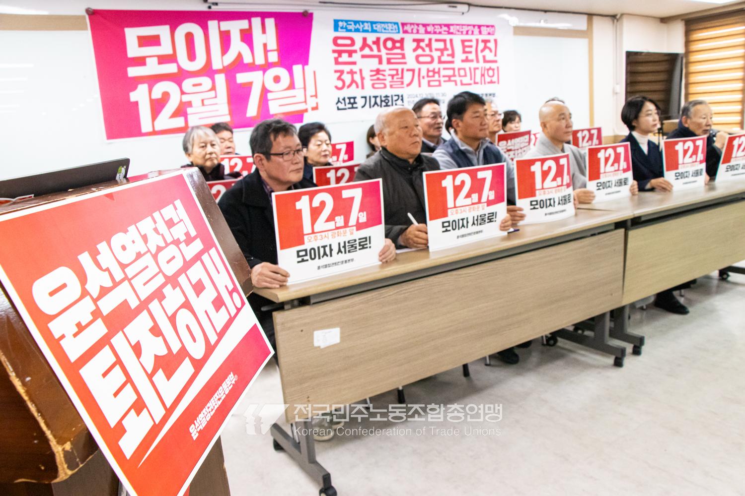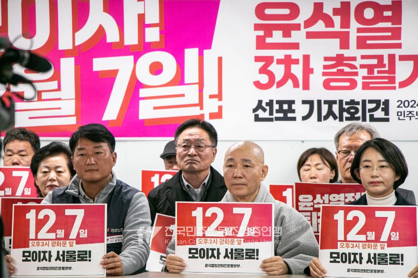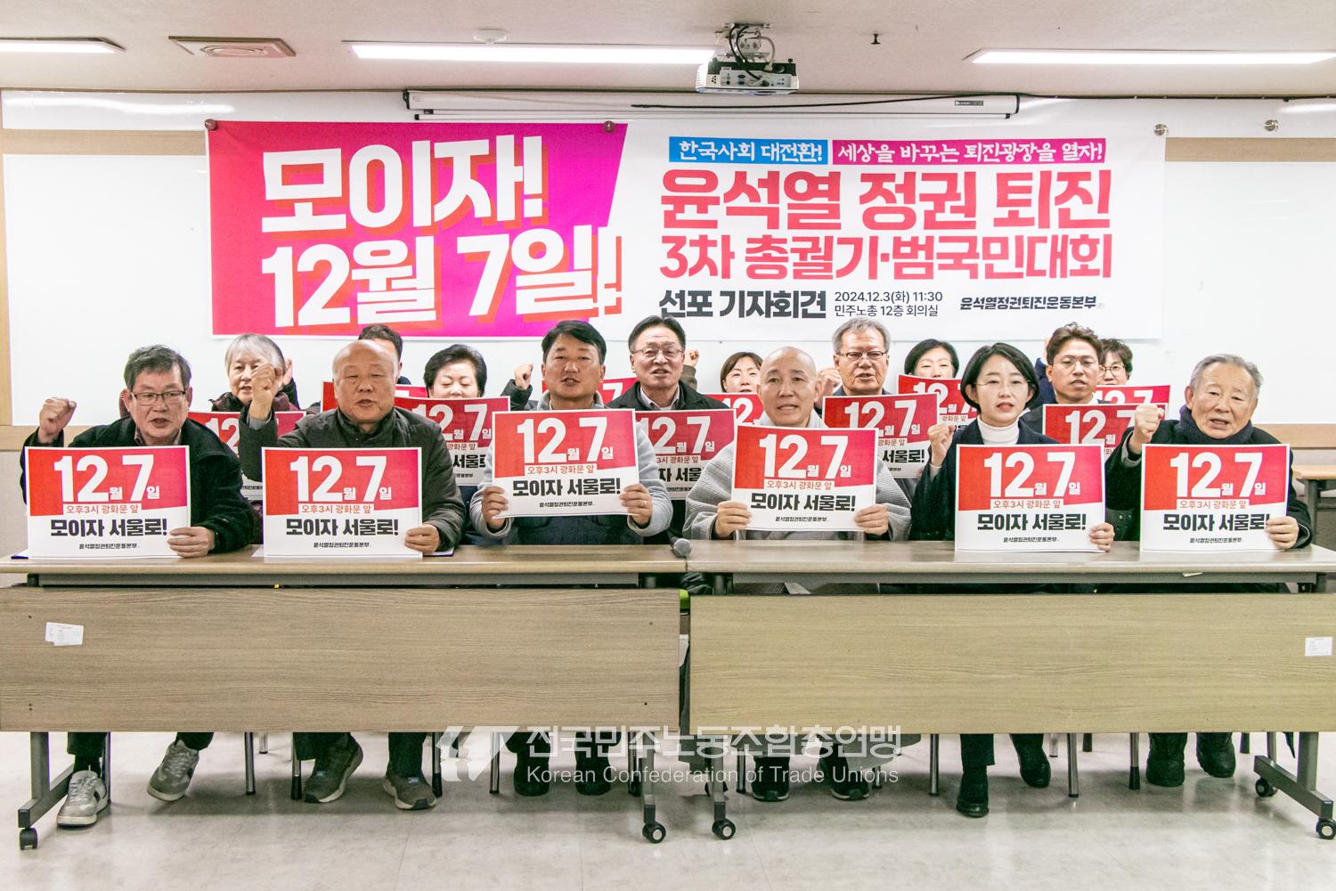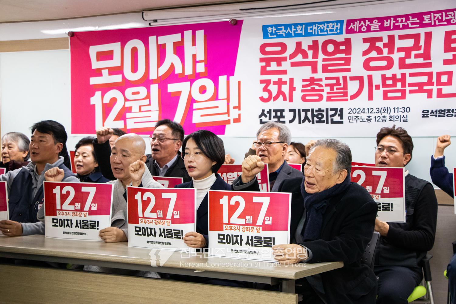 민주노총과 윤석열정권퇴진운동본부가 2024년 12월3일 오전 민주노총에서 기자회견을 열고 윤석열정권 파면을 선언했다. 이들은 각계각층에서 들불처럼 번지는 윤석열퇴진 촛불을 모아 12월7일 서울 광화문에서 한국사회 대전환을 위한 윤석열정권 퇴진광장을 열기로 했다. 앞선 11월9일과 20일에 이은 3차 총궐기 범국민대회다.