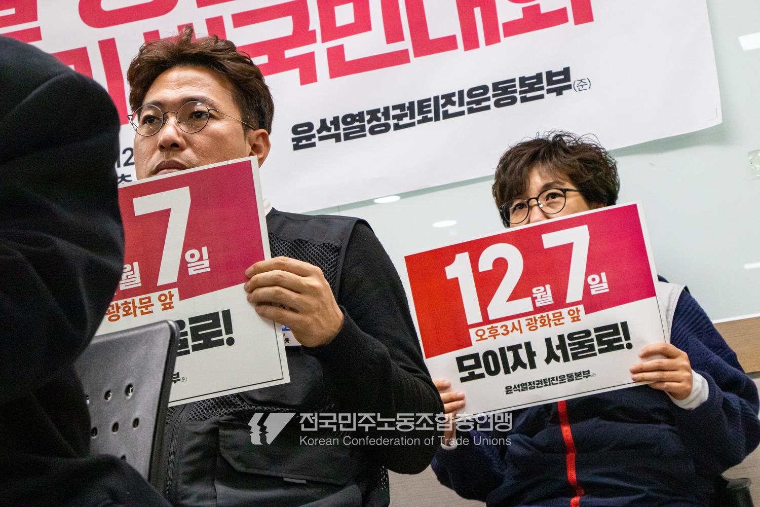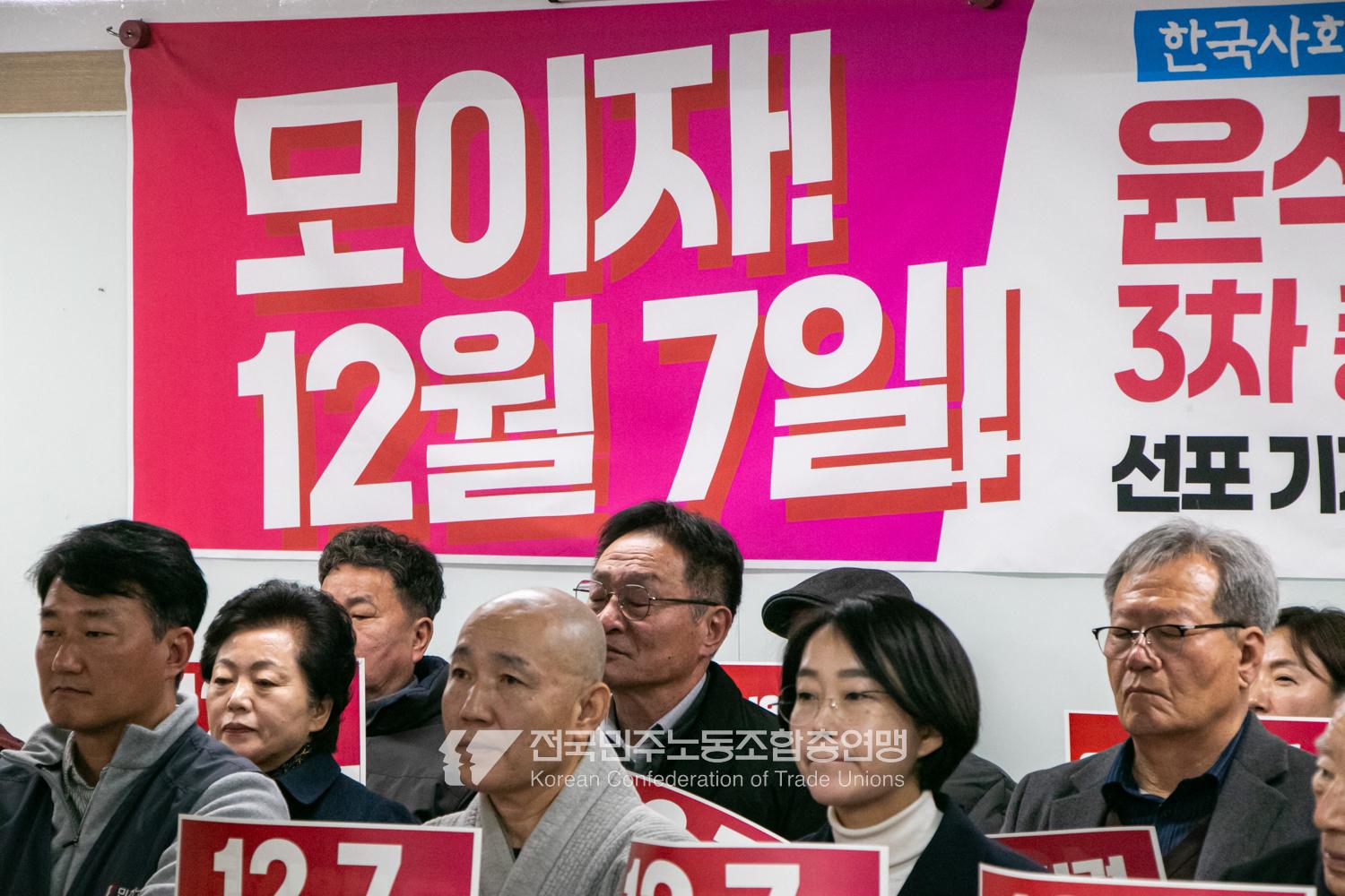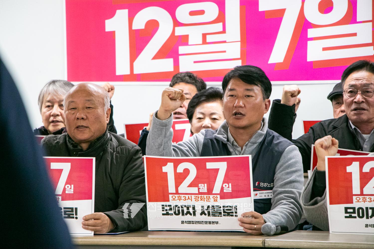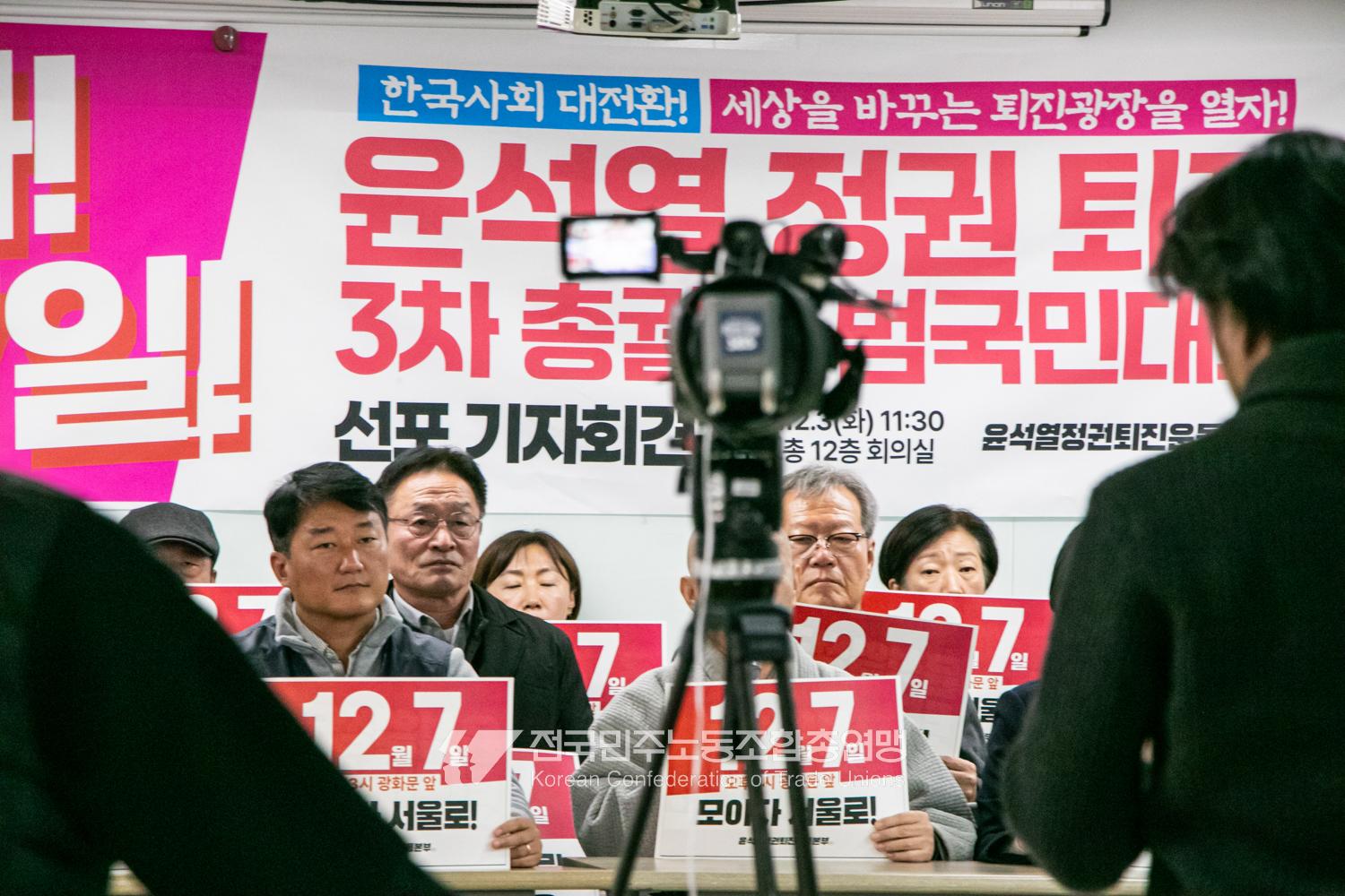 민주노총과 윤석열정권퇴진운동본부가 2024년 12월3일 오전 민주노총에서 기자회견을 열고 윤석열정권 파면을 선언했다. 이들은 각계각층에서 들불처럼 번지는 윤석열퇴진 촛불을 모아 12월7일 서울 광화문에서 한국사회 대전환을 위한 윤석열정권 퇴진광장을 열기로 했다. 앞선 11월9일과 20일에 이은 3차 총궐기 범국민대회다.