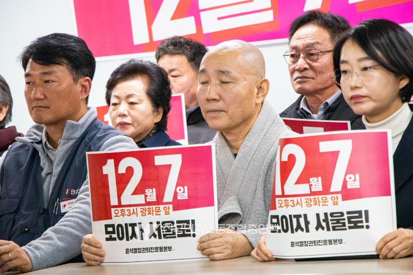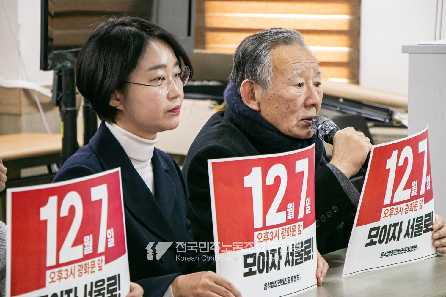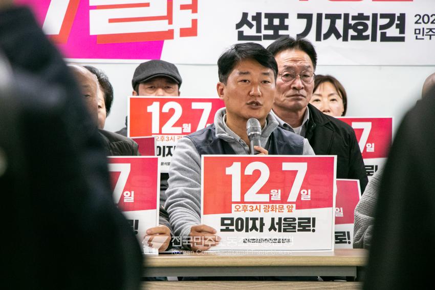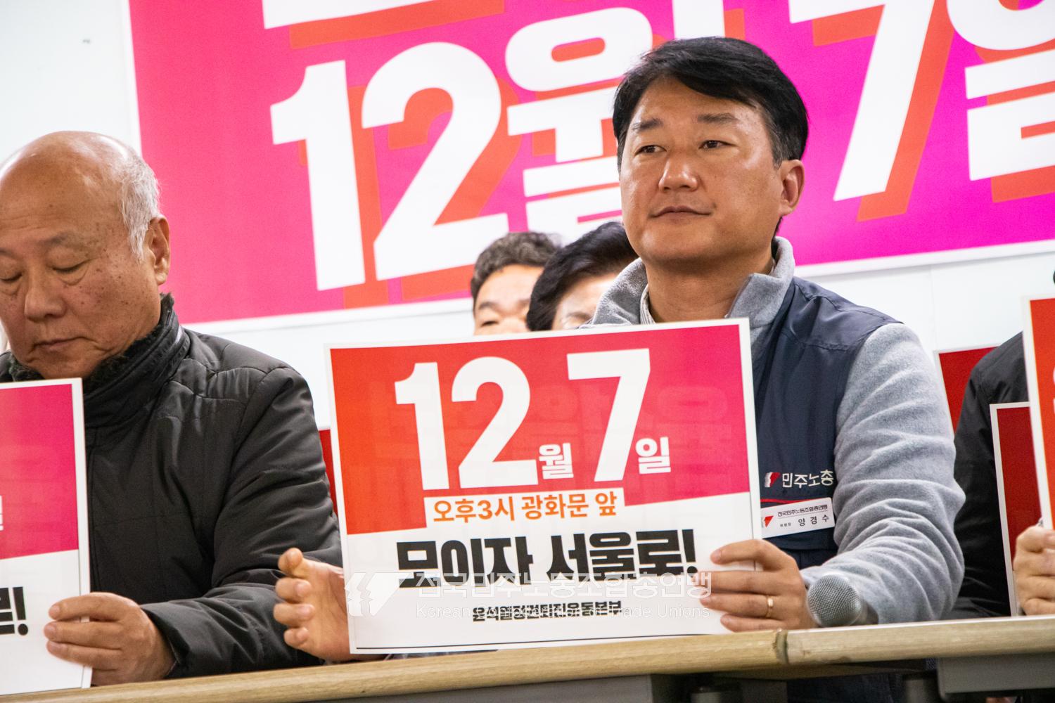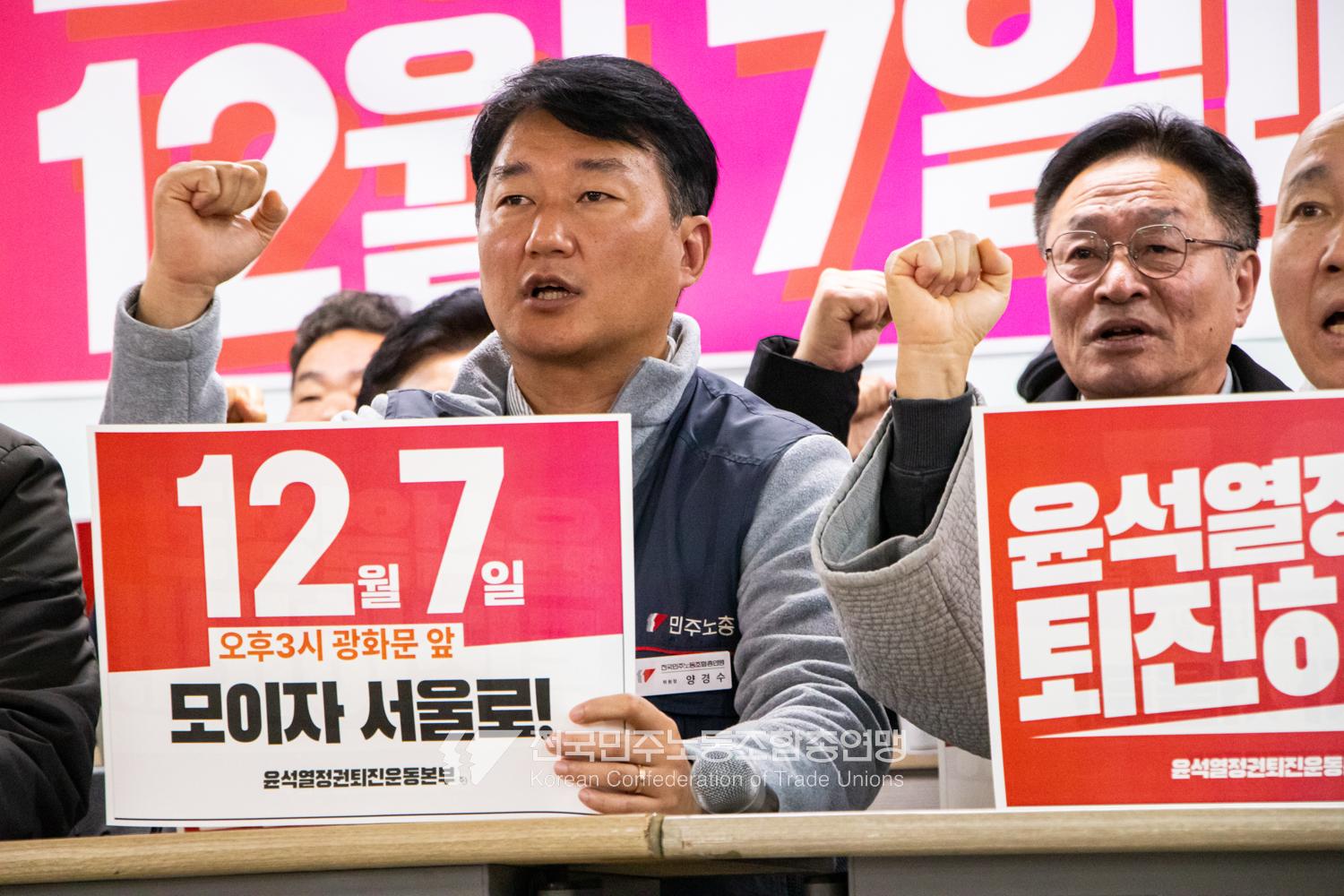 민주노총과 윤석열정권퇴진운동본부가 2024년 12월3일 오전 민주노총에서 기자회견을 열고 윤석열정권 파면을 선언했다. 이들은 각계각층에서 들불처럼 번지는 윤석열퇴진 촛불을 모아 12월7일 서울 광화문에서 한국사회 대전환을 위한 윤석열정권 퇴진광장을 열기로 했다. 앞선 11월9일과 20일에 이은 3차 총궐기 범국민대회다.
