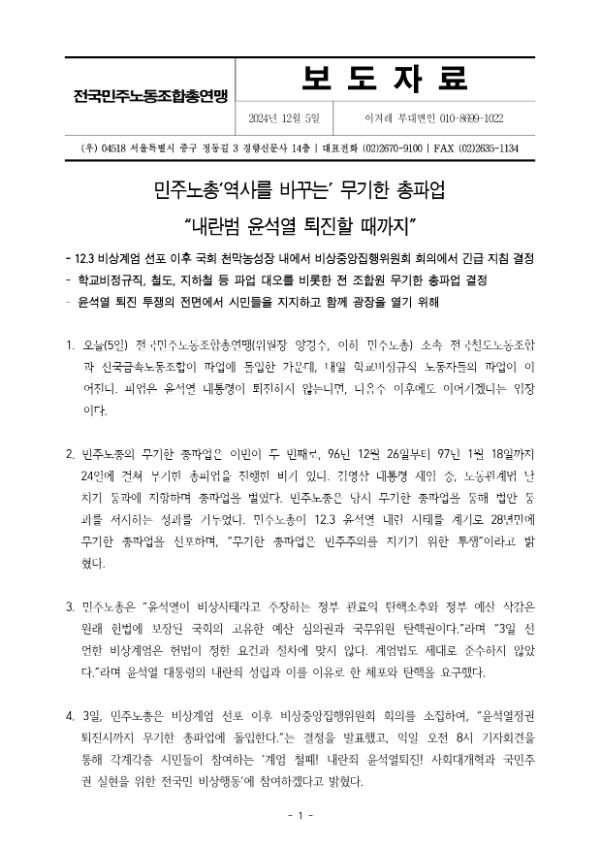 내란범 윤석열의 친위쿠데타 시도 이틀째인 2024년 12월5일 오후, 민주노총 조합원들이 서울역 인근에 모여 결의대회를 열고 도심을 행진하며 ‘민주주의 사수와 윤석열 탄핵, 체포’를 강하게 주장했다. 민주노총은 총파업이라는 가장 높은 수위의 방법으로 국가 질서를 문란케 한 내란범에 맞서 싸울 것을 결의했다.