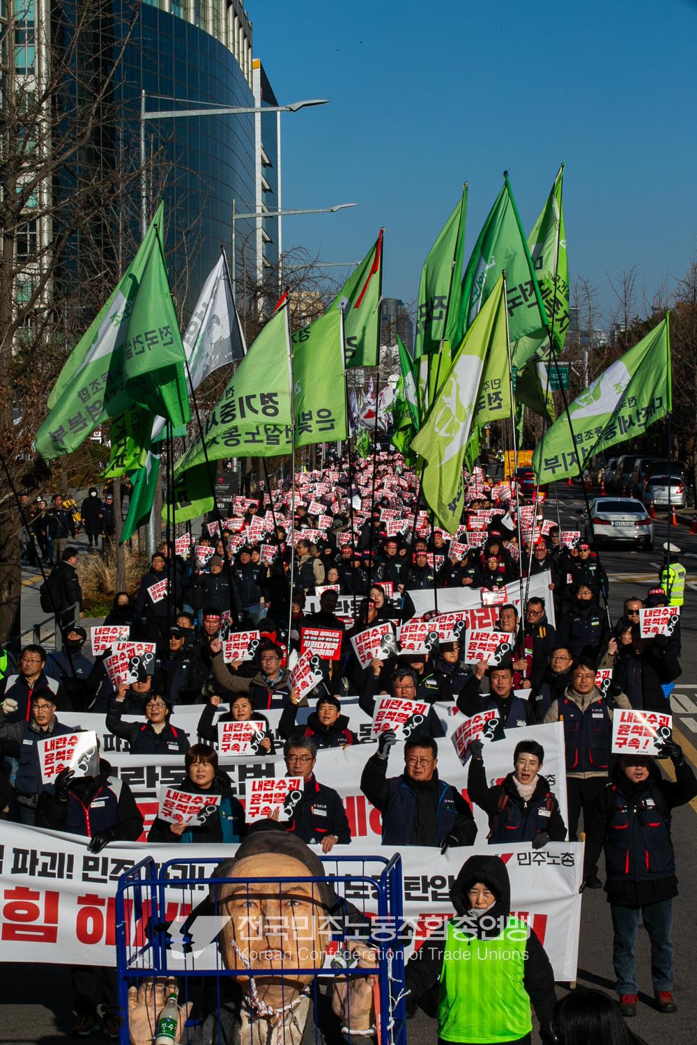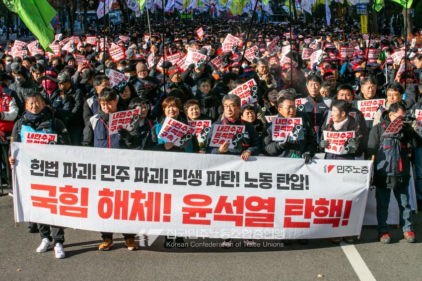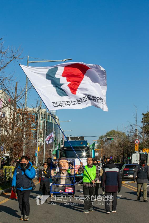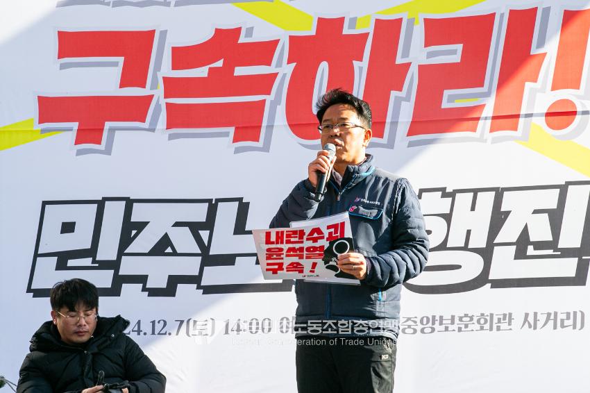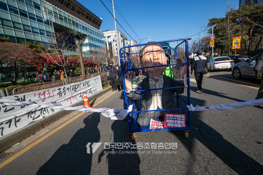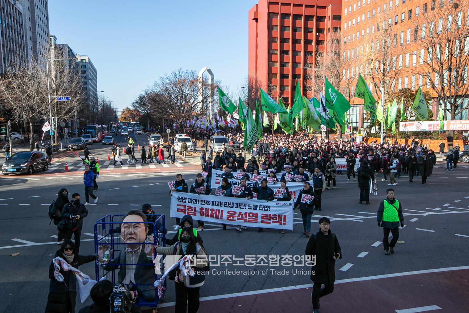 “내란 우두머리 윤석열의 만행에 종지부를 찍자!” 윤석열정권 2년 반의 비현실적인 현실을 끝낼 수 날이 밝았다. 민주노총은 2024년 12월7일 오후 4시 국회 앞 시민촛불에 앞서 민주노총 행진을 열었다. 여의도 복음로를 출발, 여의공원로를 거쳐 국회의사당으로 이동하는 맨 앞에는 감옥에 있는 윤석열 조형물을 배치했다. 조형물임에도 시민들의 반응은 마치 실제 인물에게 하듯 분노를 표현했다. 이날 민주노총은 전 조합원 총력 집중을 참가 방침으로 내렸다.