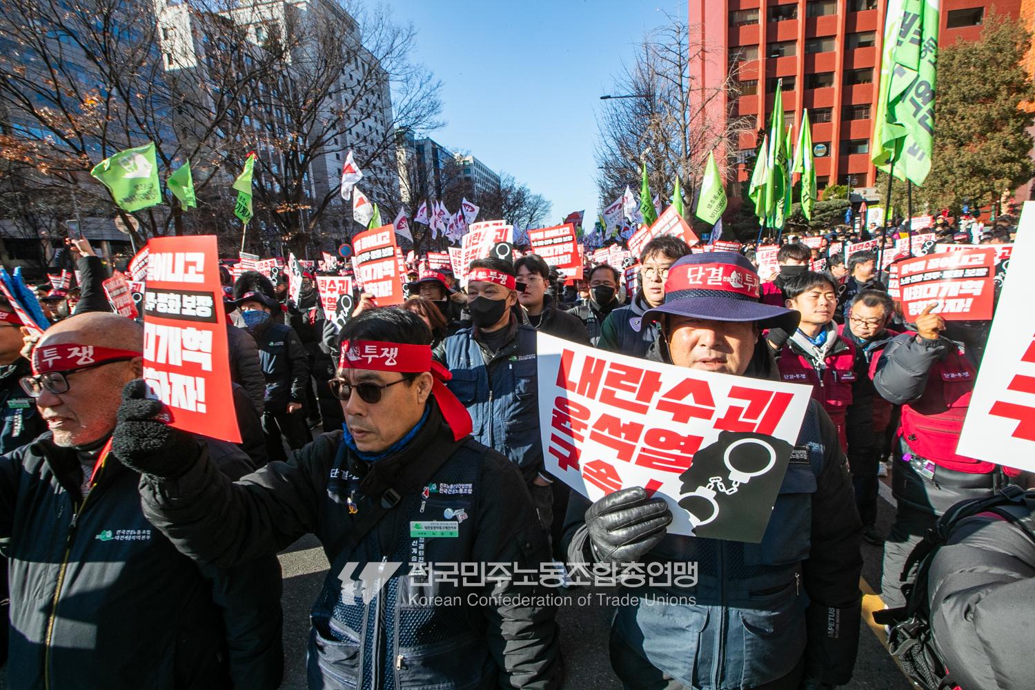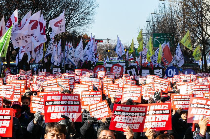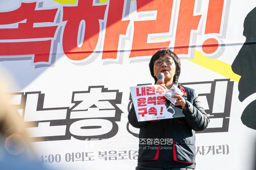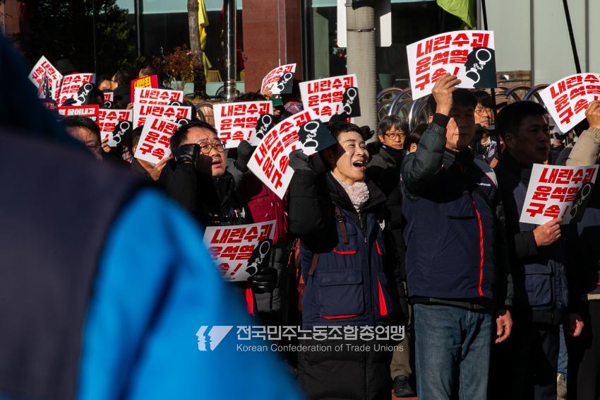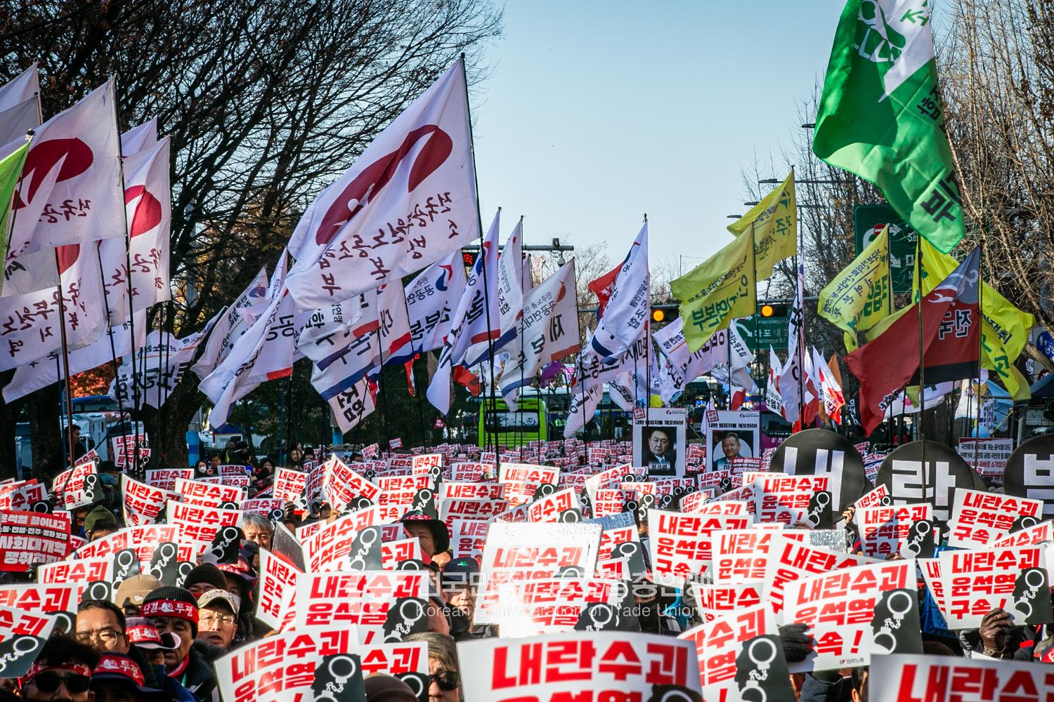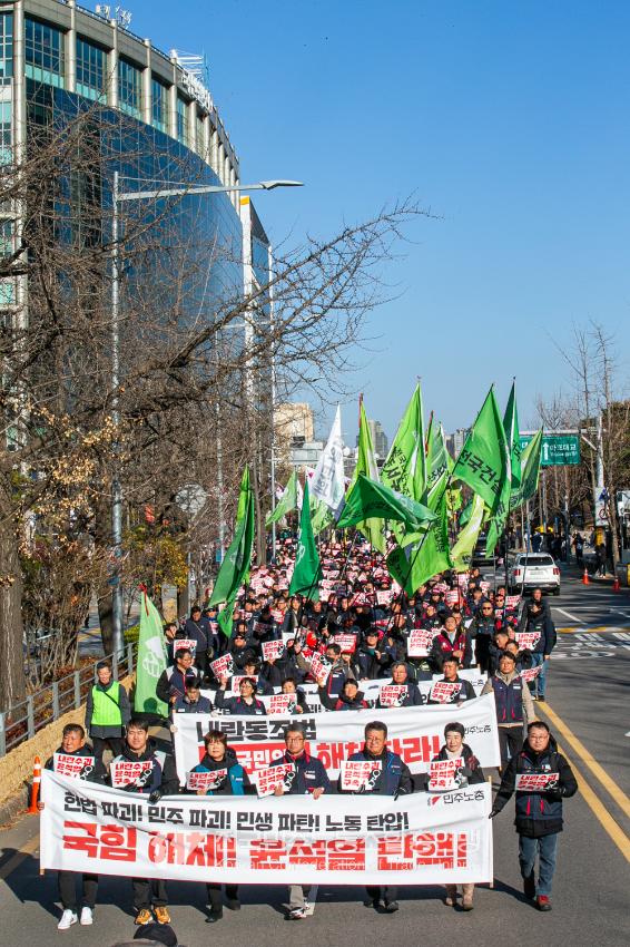 “내란 우두머리 윤석열의 만행에 종지부를 찍자!” 윤석열정권 2년 반의 비현실적인 현실을 끝낼 수 날이 밝았다. 민주노총은 2024년 12월7일 오후 4시 국회 앞 시민촛불에 앞서 민주노총 행진을 열었다. 여의도 복음로를 출발, 여의공원로를 거쳐 국회의사당으로 이동하는 맨 앞에는 감옥에 있는 윤석열 조형물을 배치했다. 조형물임에도 시민들의 반응은 마치 실제 인물에게 하듯 분노를 표현했다. 이날 민주노총은 전 조합원 총력 집중을 참가 방침으로 내렸다.
