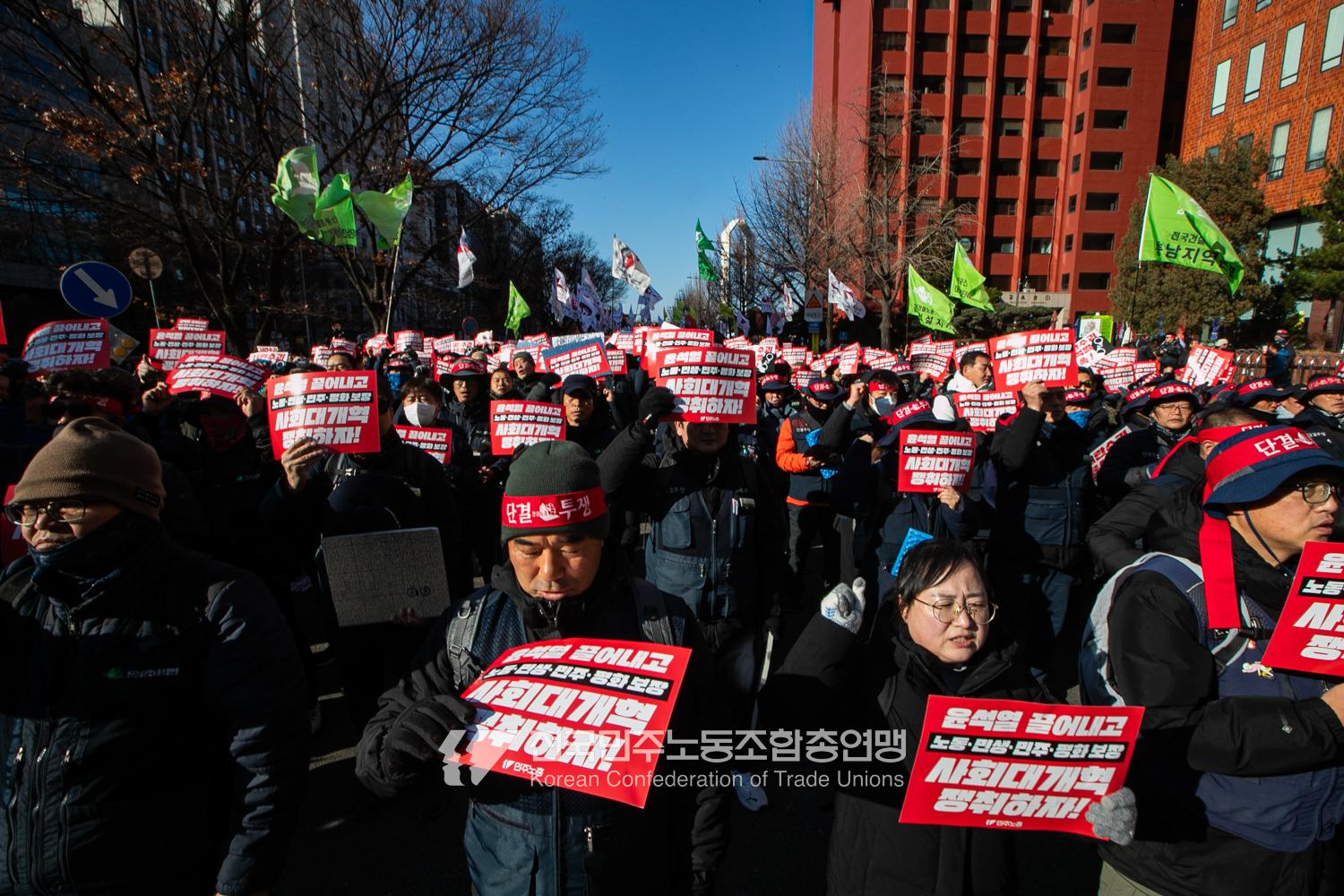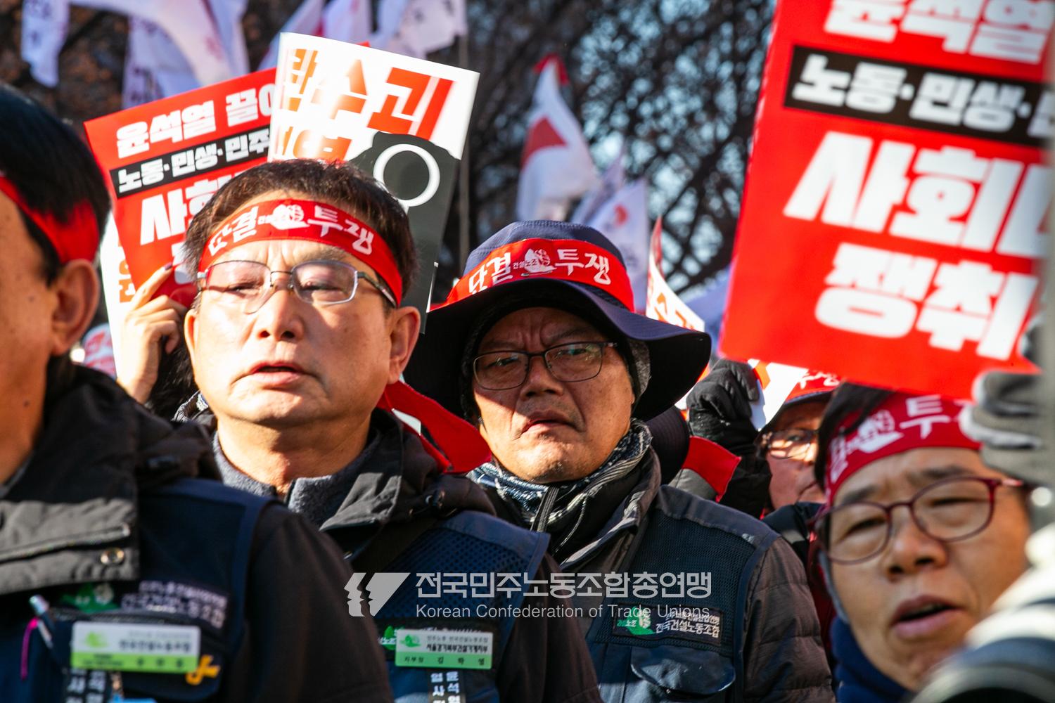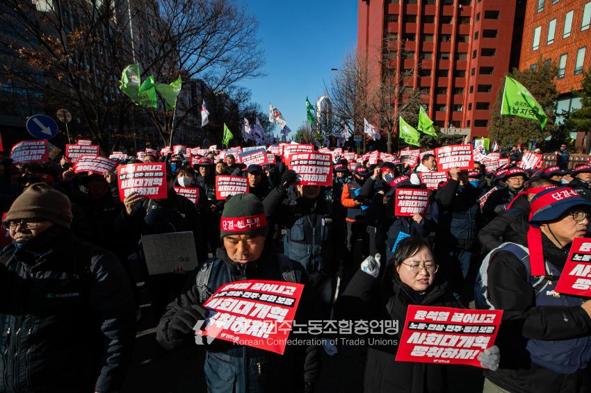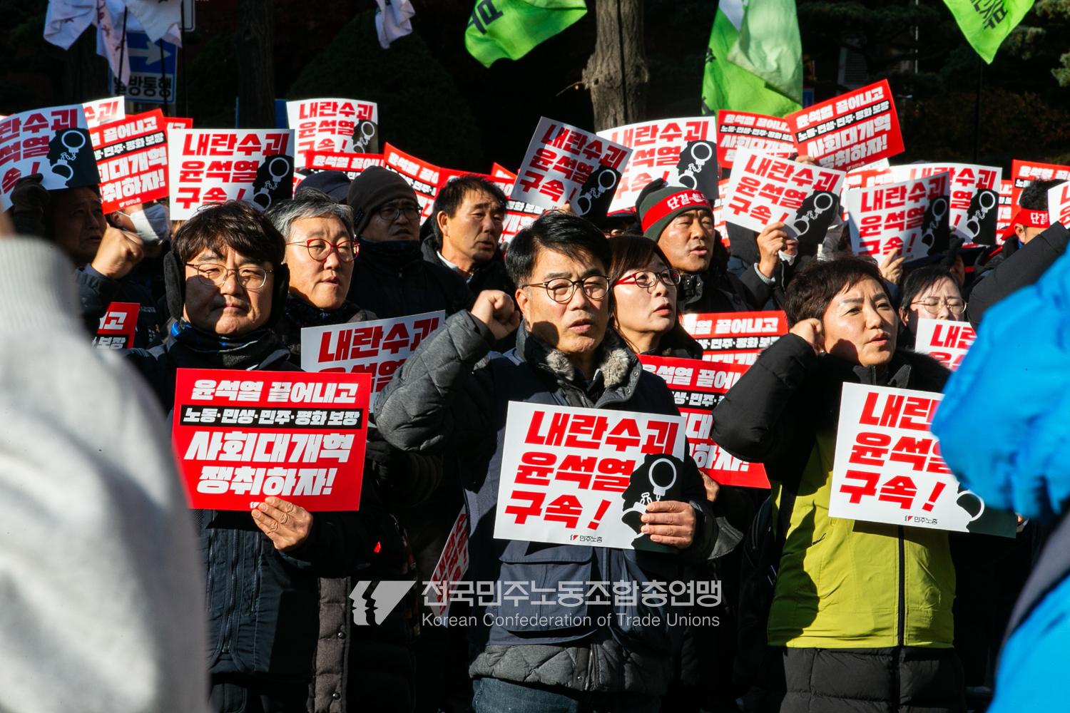 “내란 우두머리 윤석열의 만행에 종지부를 찍자!” 윤석열정권 2년 반의 비현실적인 현실을 끝낼 수 날이 밝았다. 민주노총은 2024년 12월7일 오후 4시 국회 앞 시민촛불에 앞서 민주노총 행진을 열었다. 여의도 복음로를 출발, 여의공원로를 거쳐 국회의사당으로 이동하는 맨 앞에는 감옥에 있는 윤석열 조형물을 배치했다. 조형물임에도 시민들의 반응은 마치 실제 인물에게 하듯 분노를 표현했다. 이날 민주노총은 전 조합원 총력 집중을 참가 방침으로 내렸다.