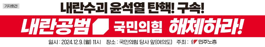민주노총은 2024년 12월9일 오전 11시 여의도 국민의힘 당사앞에서 ‘내란수괴 윤석열 체포.구속! 내란공범 국민의힘 해체! 민주노총 기자회견’을 열었다. 민주노총은 탄핵되어야 마땅할 내란 우두머리 윤석열을 오히려 편들어 내란동조세력이 된 국민의힘을 강력하게 규탄했다. 또한 국민의힘이 윤석열을 신속하게 탄핵, 체포하는 데 동의하지 않는다면 12일부터 국민의힘 해체 투쟁에 나설 것을 경고했다.