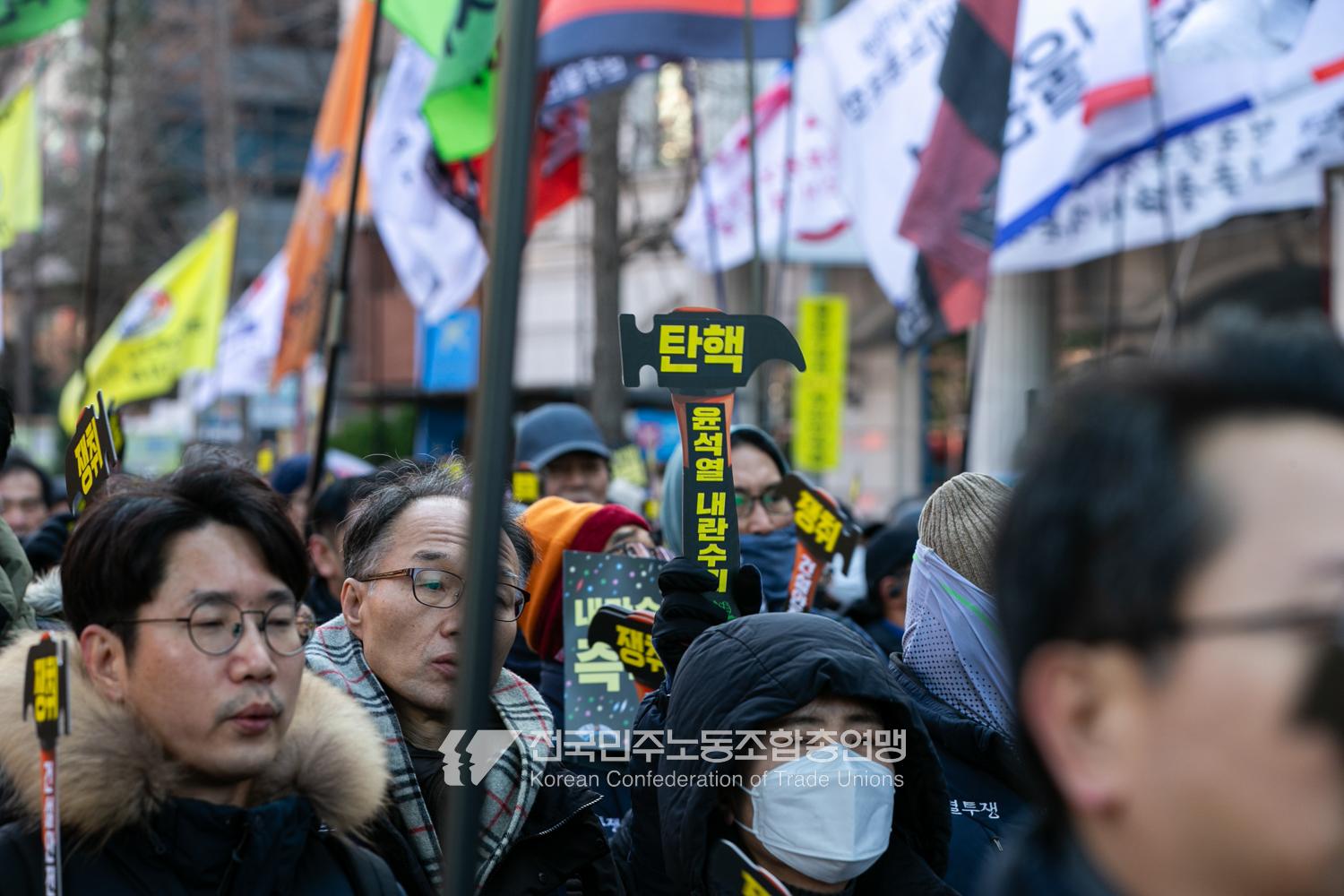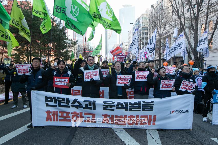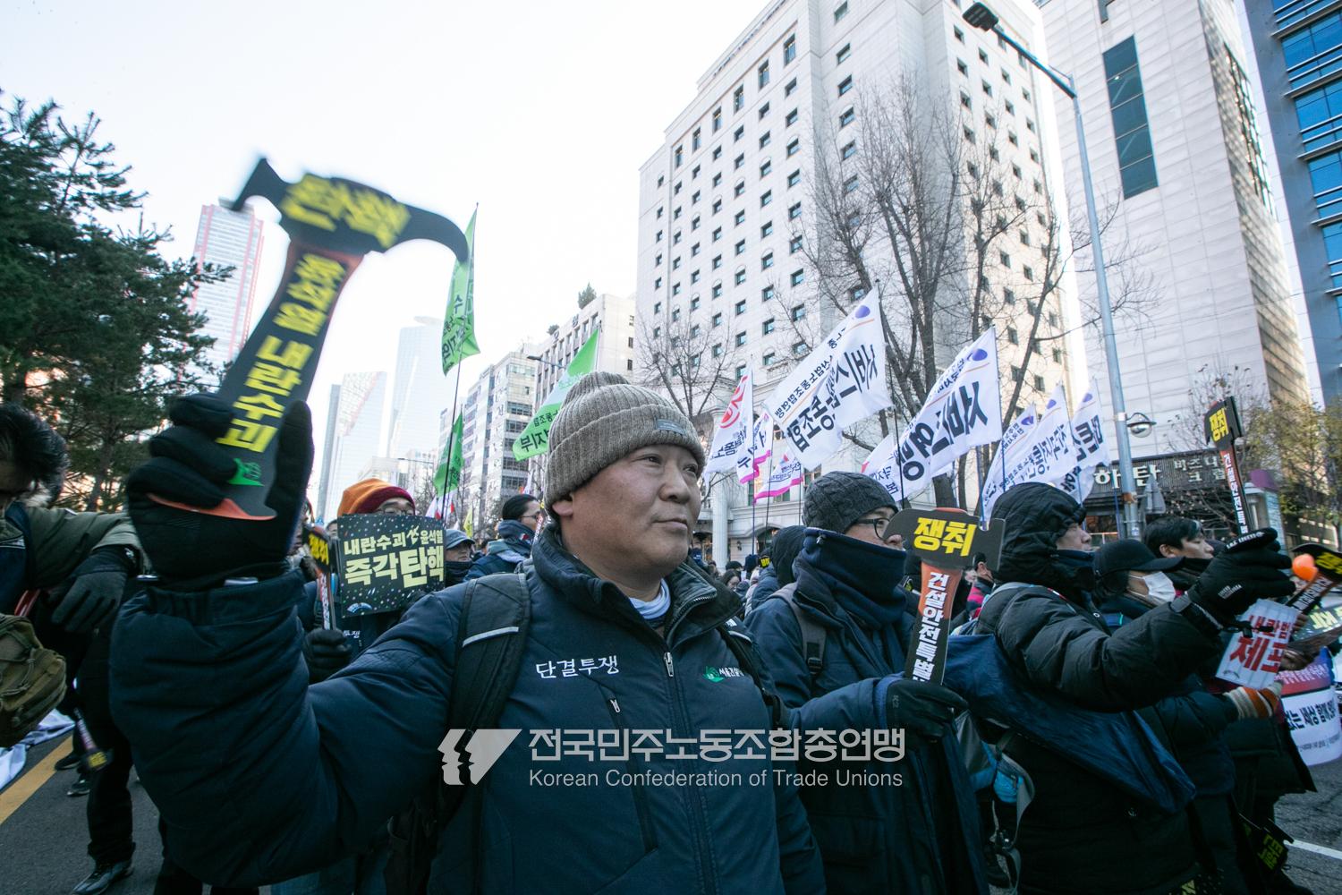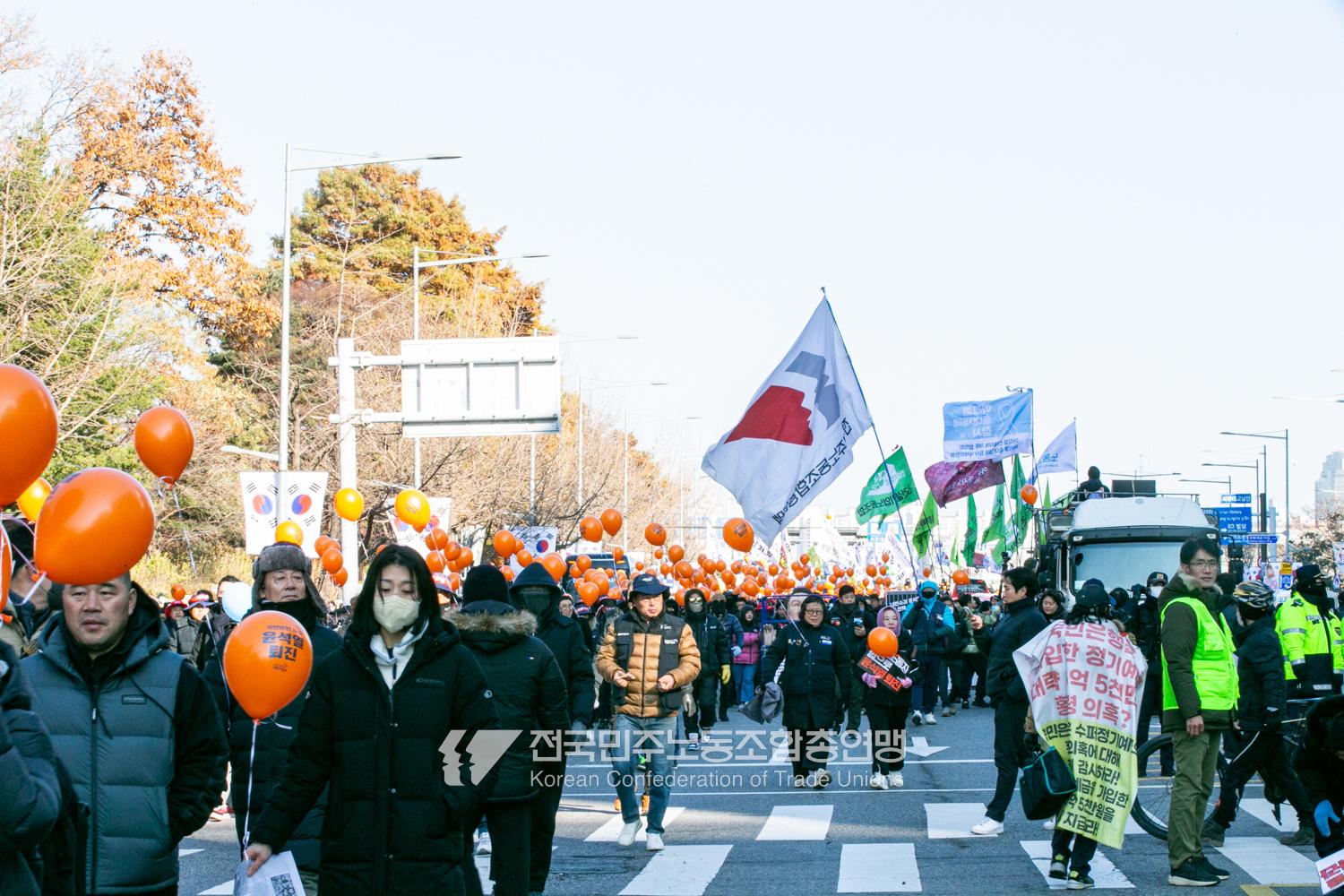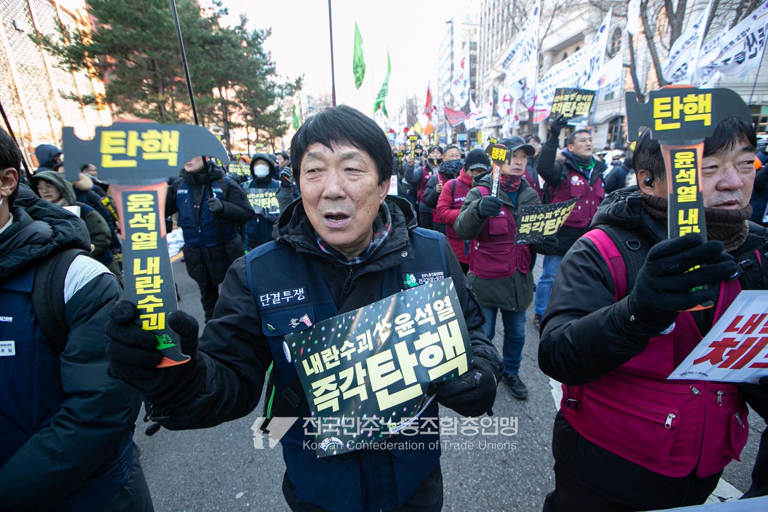 일주일만에 다시 대통령 윤석열에 대한 탄핵소추안이 본회의에 상정된 날, 민주노총은 범국민촛불대행진에 앞서 직접 길을 열며 여의도 국회 앞으로 행진했다. 민주노총은 지난 2년 반 동안 윤석열과 투쟁해왔던 과거를 떠올리며 ‘윤석열 탄핵’을 외쳤다. 200만 시민이 모인 범국민촛불대행진에서 민주노총 조합원들의 연대가 빛났다. 서비스연맹 학비노조는 시민들과 ‘탄핵어묵’을 나눴고 공공운수노조 라이더유니온지부는 ‘민주주의를 배달한다’며 노인과 환자, 어린이 등 움직임이 어려운 시민의 이동을 도왔다.