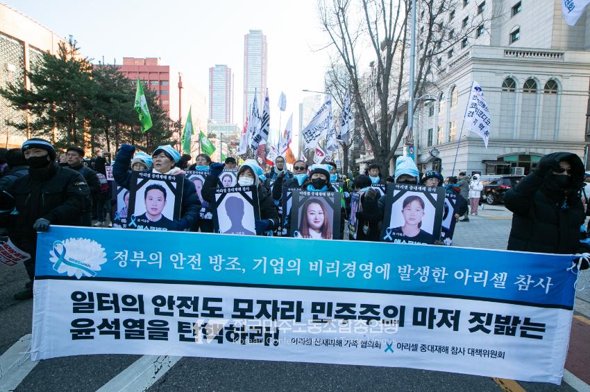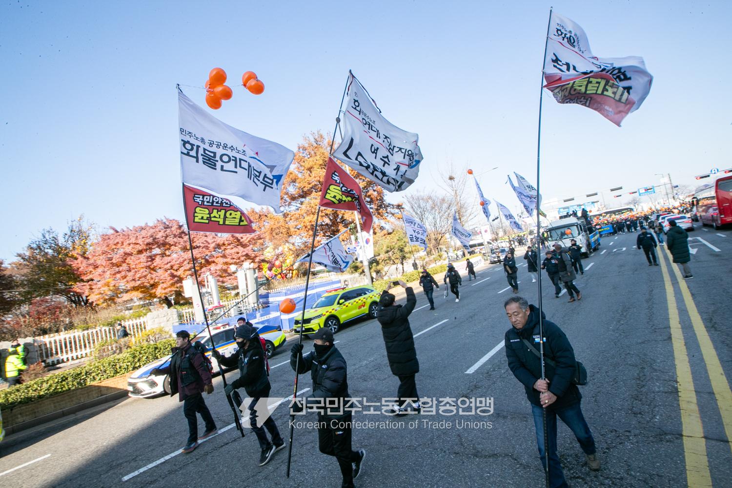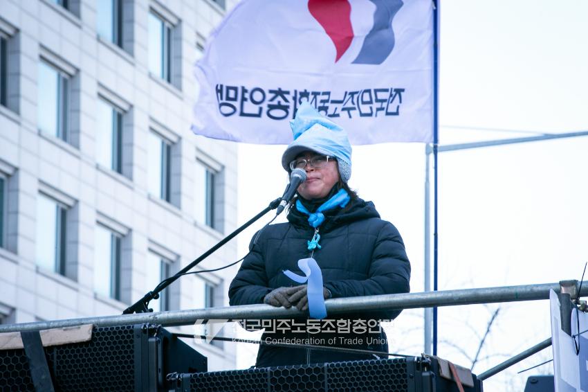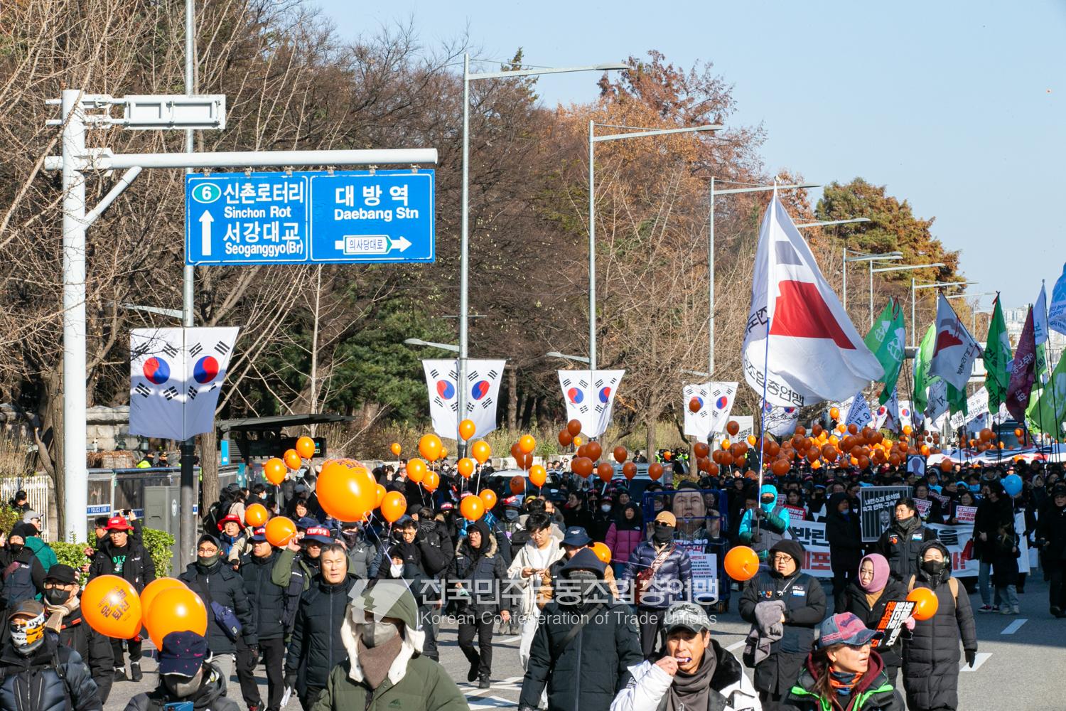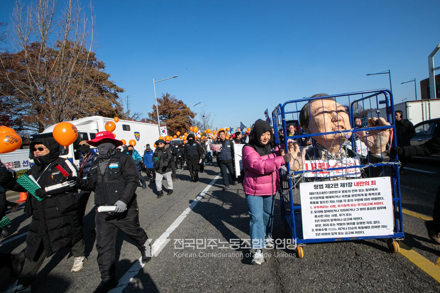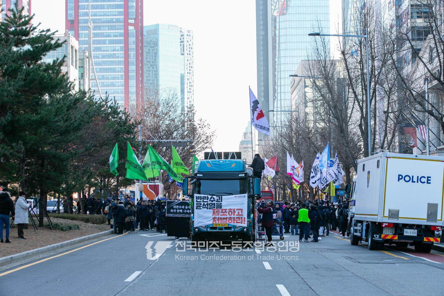 일주일만에 다시 대통령 윤석열에 대한 탄핵소추안이 본회의에 상정된 날, 민주노총은 범국민촛불대행진에 앞서 직접 길을 열며 여의도 국회 앞으로 행진했다. 민주노총은 지난 2년 반 동안 윤석열과 투쟁해왔던 과거를 떠올리며 ‘윤석열 탄핵’을 외쳤다. 200만 시민이 모인 범국민촛불대행진에서 민주노총 조합원들의 연대가 빛났다. 서비스연맹 학비노조는 시민들과 ‘탄핵어묵’을 나눴고 공공운수노조 라이더유니온지부는 ‘민주주의를 배달한다’며 노인과 환자, 어린이 등 움직임이 어려운 시민의 이동을 도왔다.