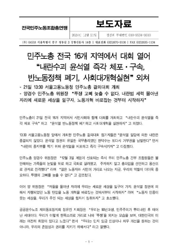 민주노총이 2024년 12월21일 전국 16개 지역에서 시민사회와 함께 결의대회를 열고 ‘내란수괴 윤석열 즉각 체포 구속’과 ‘윤석열 반노동정책 폐기, 사회대개혁 실현’을 촉구했다. 이들은 “윤석열 일당의 내란은 종결되지 않았다. 윤석열 정권의 유일한 국무총리였던 한덕수는 또다시 거부권을 남발한다”면서 “내란의 종지부를 찍기 위해 윤석열을 체포하고 즉각 구속시키자”고 다짐했다. 대회에 참가한 조합원들은 서울지방고용노동청에서 종각역을 거쳐 경복궁까지 행진한 뒤 오후 5시 열린 윤석열 즉각 체포·퇴진! 사회대개혁! 범시민대행진에 합류했다.