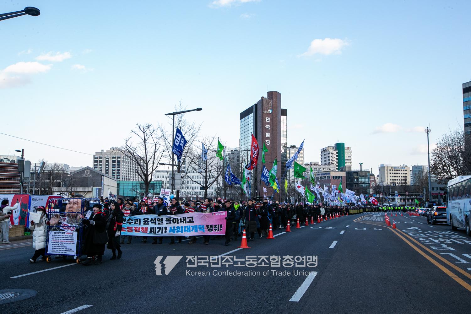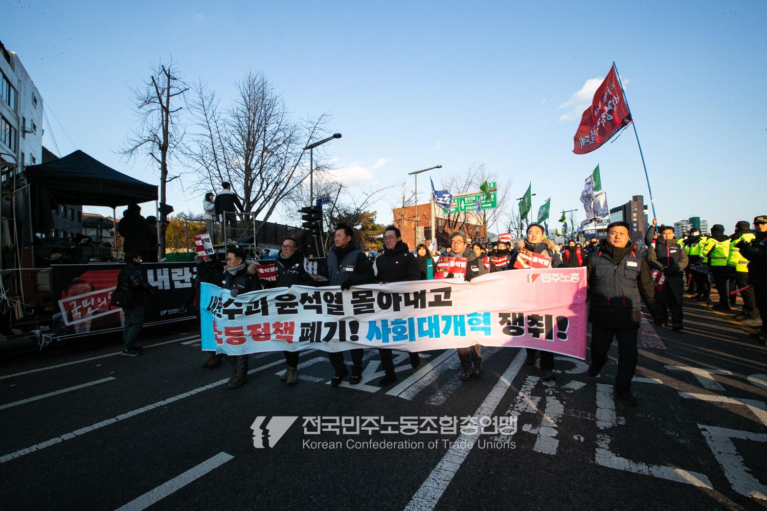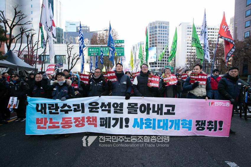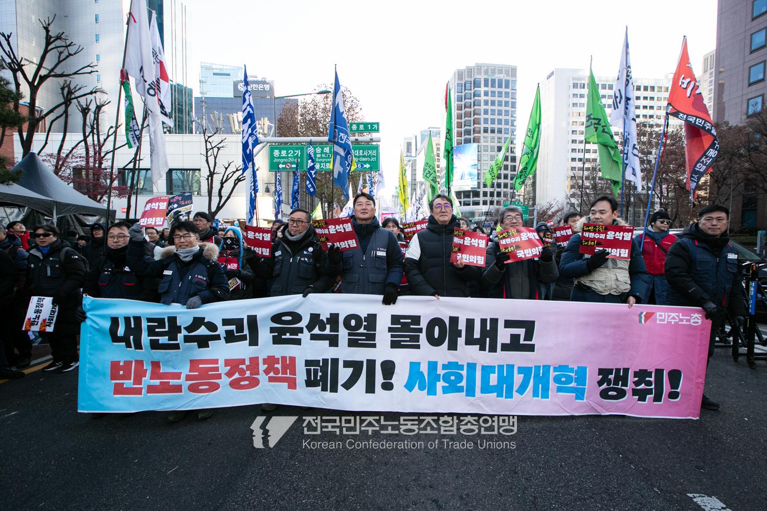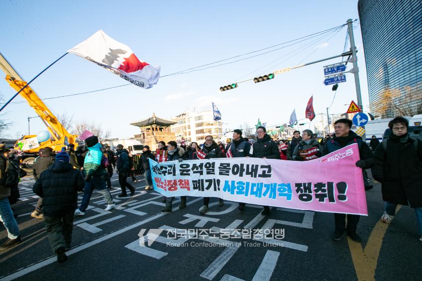 2024년 마지막 토요일에도 민주노총 행진은 멈추지 않았다. 민주노총은 12월28일 내란범 윤석열 탄핵, 헌법재판소의 신속한 판결 촉구, 사회대개혁 쟁취를 위한 행진을 4차 범시민대행진에 앞서 종로 보신각에서 시작했다. 민주노총은 윤석열 탄핵을 넘어 탄핵 이후 만들어 갈 사회대개혁을 시민들과 함께 구호로 외쳤다.