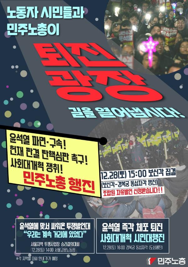 2024년 마지막 토요일에도 민주노총 행진은 멈추지 않았다. 민주노총은 12월28일 내란범 윤석열 탄핵, 헌법재판소의 신속한 판결 촉구, 사회대개혁 쟁취를 위한 행진을 4차 범시민대행진에 앞서 종로 보신각에서 시작했다. 민주노총은 윤석열 탄핵을 넘어 탄핵 이후 만들어 갈 사회대개혁을 시민들과 함께 구호로 외쳤다.