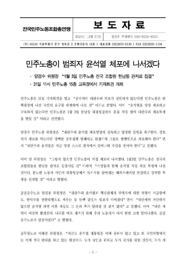 “범죄자 윤석열 체포에 나서겠다!” 2025년 마지막 날, 한남동 관저에서 농성 중인 윤석열 체포를 위해 민주노총이 칼을 빼들었다. 공수처의 윤석열 체포 및 구속 집행에 뜸을 들이자 민주노총이 직접 한남동 대통령 공간 문을 열겠다는 선포였다. 민주노총은 2024년 12월31일 기자회견에서 신속하고 엄정한 체포영장 집행을 촉구하고 “경호처가 체포를 막는다면 명백한 공무집행 방해이고 위법이며 그들도 현행범으로 체포해야 한다”고 강조했다. 내란 우두머리 윤석열이 관저 농성을 그만두고 스스로 걸어나와 수갑을 받지 않으면 2025년 1월3일 민주노총 조합원 손에 의해 체포될 것이라고 경고했다.