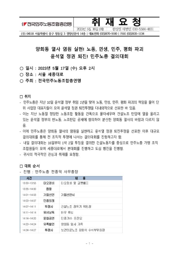 민주노총 조합원과 건설노조 등 3만여 명이 2023년 5월17일 오후 세종대로에 모여 ‘양회동 열사 염원 실현! 노동, 민생, 민주, 평화 파괴 윤석열정권 퇴진! 민주노총 결의대회’를 열었다. 양회동 열사 유족이 무대에 올라 열사의 염원을 지켜달라는 말과 함께 열사에게 보내는 편지를 낭독했다. 이날 대회에서 민주노총은 윤석열정권 퇴진 투쟁에 나서는 것이 열사의 유지이자 열사정신을 계승하는 것이라며 당시 6월 최저임금 투쟁, 7월 총파업까지 함께 돌파해나갈 것을 결의했다. 본대회를 마친 민주노총 조합원들은 삼각지와 혜화동 방면으로 행진한 뒤 대회를 마무리했다.