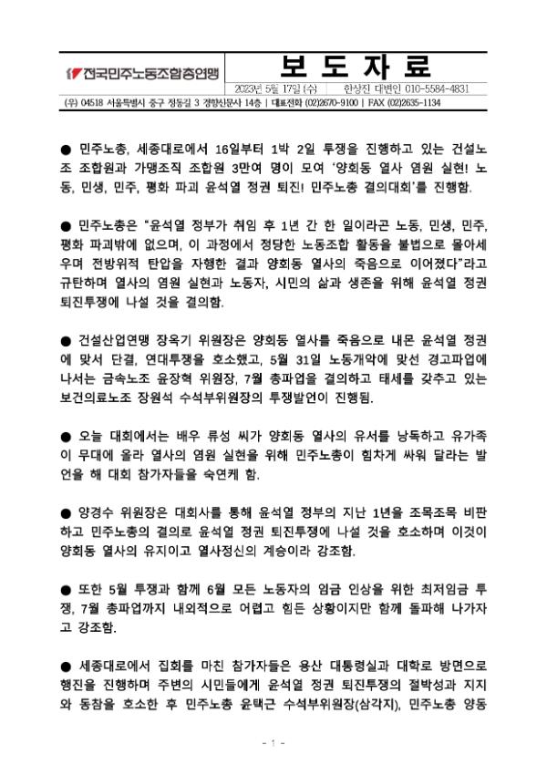 민주노총 조합원과 건설노조 등 3만여 명이 2023년 5월17일 오후 세종대로에 모여 ‘양회동 열사 염원 실현! 노동, 민생, 민주, 평화 파괴 윤석열정권 퇴진! 민주노총 결의대회’를 열었다. 양회동 열사 유족이 무대에 올라 열사의 염원을 지켜달라는 말과 함께 열사에게 보내는 편지를 낭독했다. 이날 대회에서 민주노총은 윤석열정권 퇴진 투쟁에 나서는 것이 열사의 유지이자 열사정신을 계승하는 것이라며 당시 6월 최저임금 투쟁, 7월 총파업까지 함께 돌파해나갈 것을 결의했다. 본대회를 마친 민주노총 조합원들은 삼각지와 혜화동 방면으로 행진한 뒤 대회를 마무리했다.