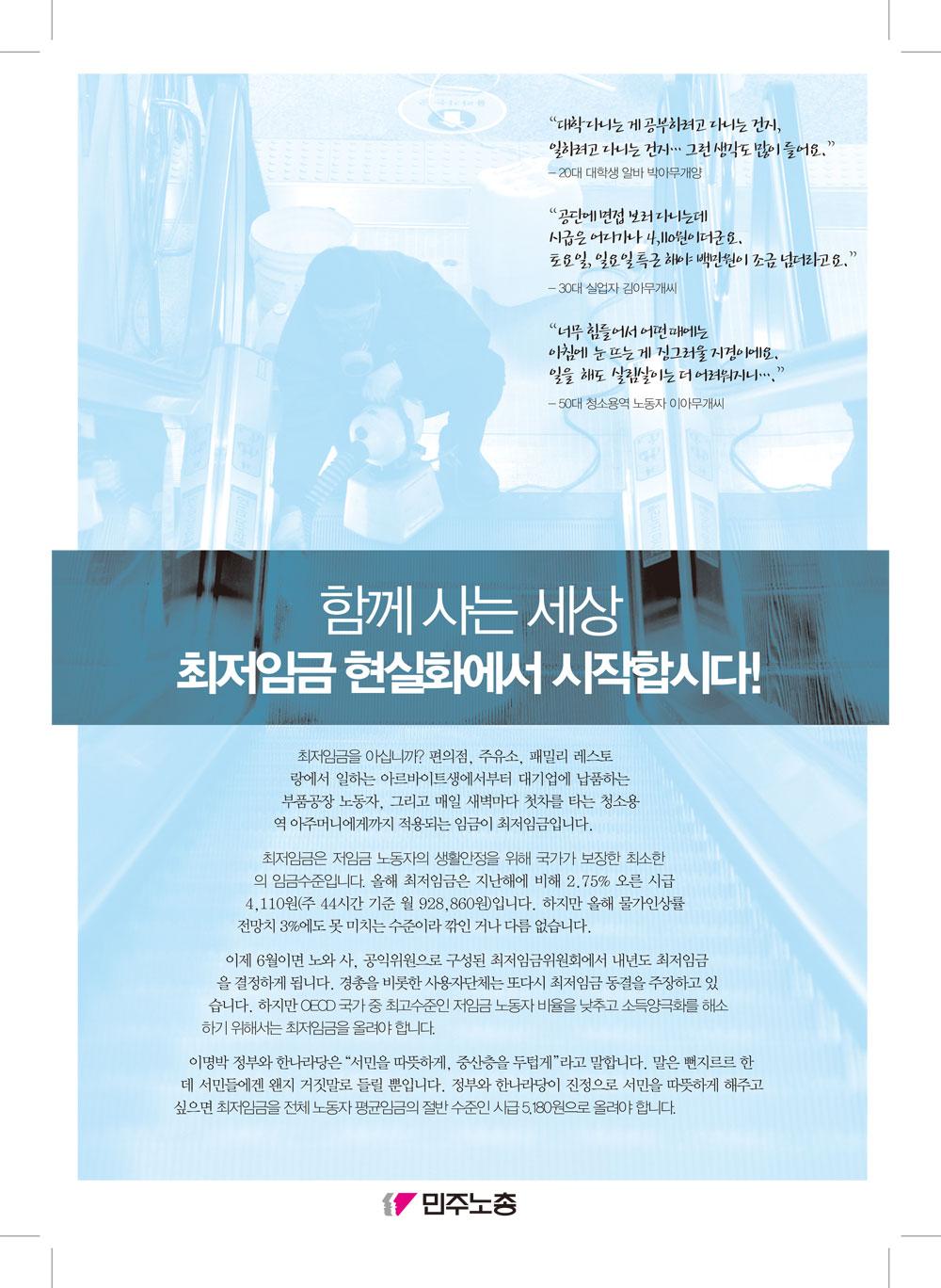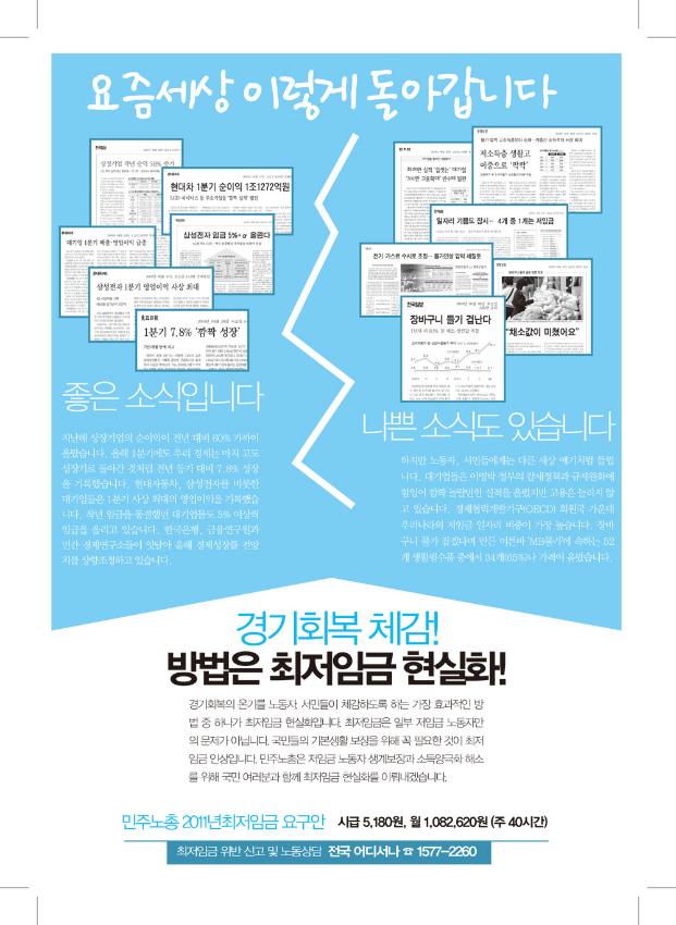 민주노총이 제작한 최저임금 인상 촉구 웹자보이다. 웹자보는 최저임금 현실화를 통해 노동자들의 생활 안정을 도모하고, OECD 국가 중 최저 수준인 자영업자 노동자 비율을 낮추고 소득 양극화를 해소해야 한다고 주장한다. 이명박 정부와 한나라당은 서민을 위한다 말하지만, 실제로는 떡값조차 제대로 받지 못하는 노동자들이 많다고 비판하며 최저임금 인상을 촉구한다. 또한, 경기 회복의 방법으로 최저임금 현실화를 제시하며, 국민들의 기본적인 생활 보장을 위해 최저임금 인상이 필요하다고 강조한다.