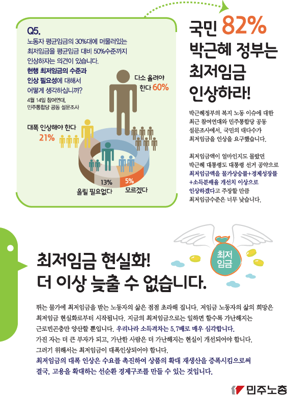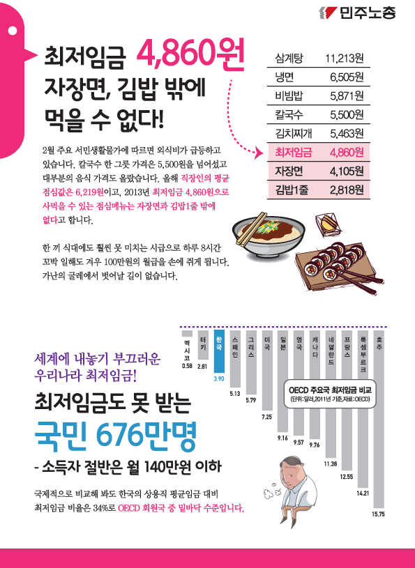 민주노총이 2013년 4월에 제작한 최저임금 관련 웹자보이다. 최저임금 인상 필요성에 대한 여론조사 결과와 함께, 당시 최저임금인 4,860원으로 자장면과 김밥 외에는 먹을 수 없다는 점을 강조한다. 또한, 한국의 최저임금이 OECD 주요 국가에 비해 낮다는 점을 지적하며 최저임금 인상의 필요성을 역설한다. 최저임금 인상을 통해 저소득 노동자들의 생활 안정과 경제 활성화를 도모해야 한다고 주장한다.