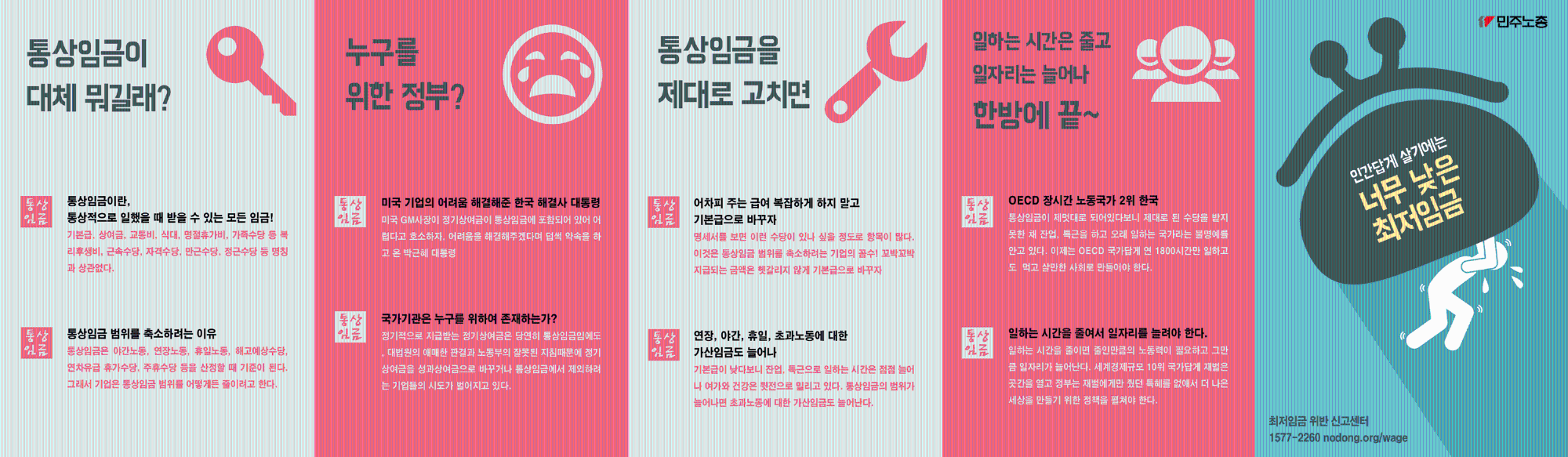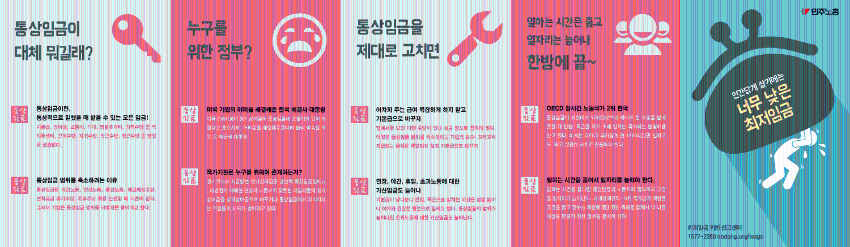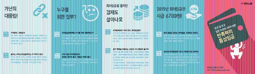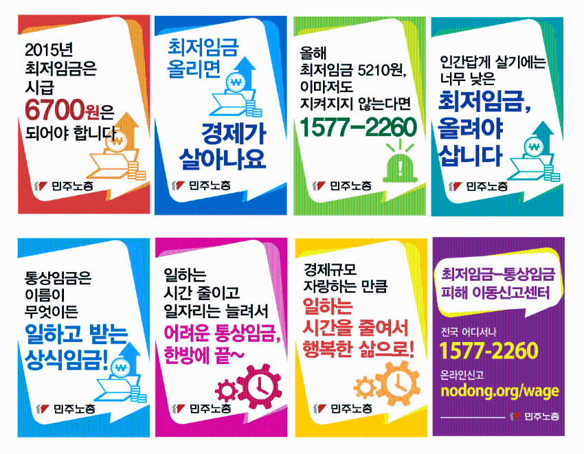 민주노총이 제작한 웹자보들을 모아놓은 자료이다. 2015년 최저임금은 시급 6,700원이 되어야 한다는 내용, 최저임금을 올리면 경제가 살아나는지 묻는 내용, 최저임금 피해 신고센터 안내, 통상임금 관련 내용 등이 포함되어 있다. 노동자들의 권익 보호와 관련된 다양한 주제를 다루고 있다.