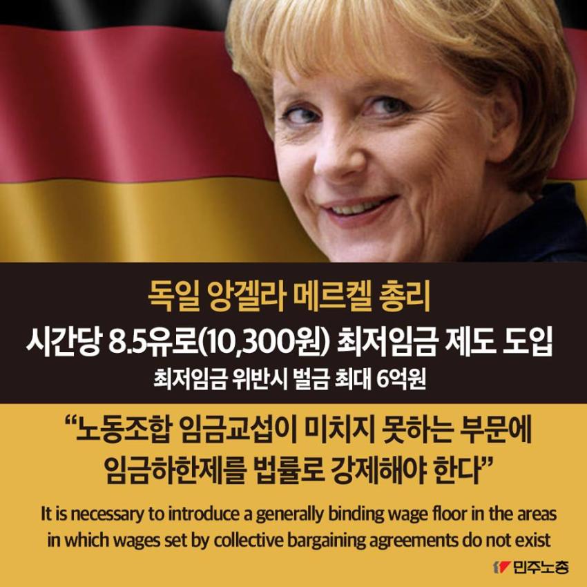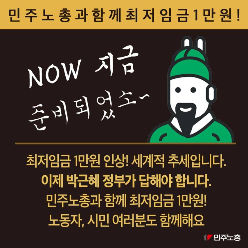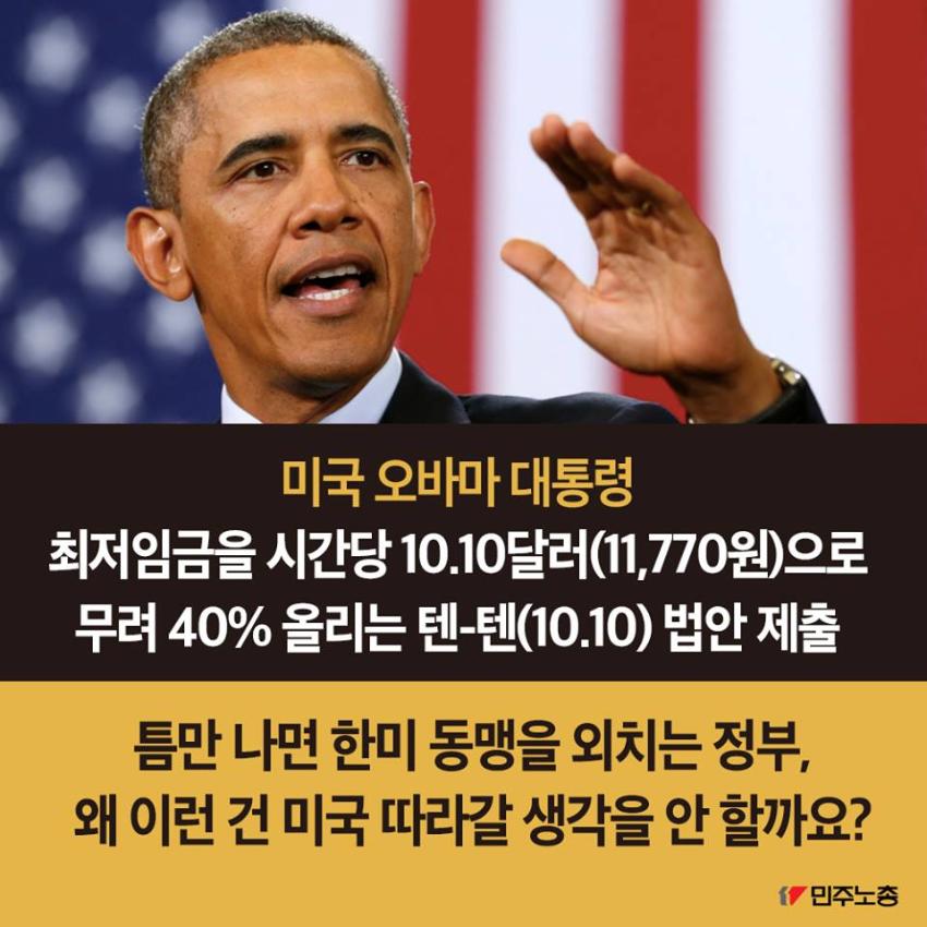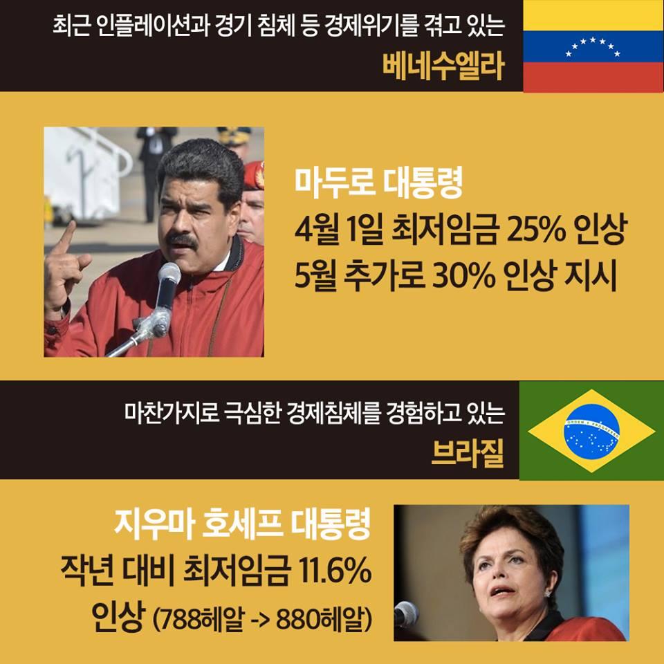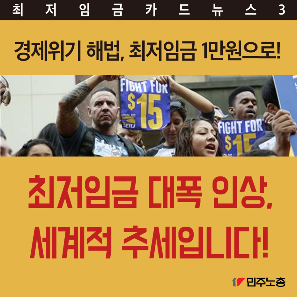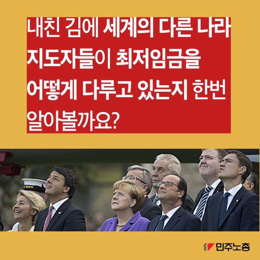민주노총에서 제작한 최저임금 인상 요구 관련 웹자보 자료이다. 국내 최저임금 1만원 인상 필요성을 주장하며, 비정규직 철폐 및 노동시간 단축 등 노동자 권리 보장을 요구하고 있다. 주요 국가 지도자들의 최저임금 정책 사례를 소개하며 한국 정부의 정책 방향에 대한 비판적 시각을 제시한다. 2016년 전국노동자대회 개최를 알리고 있다.