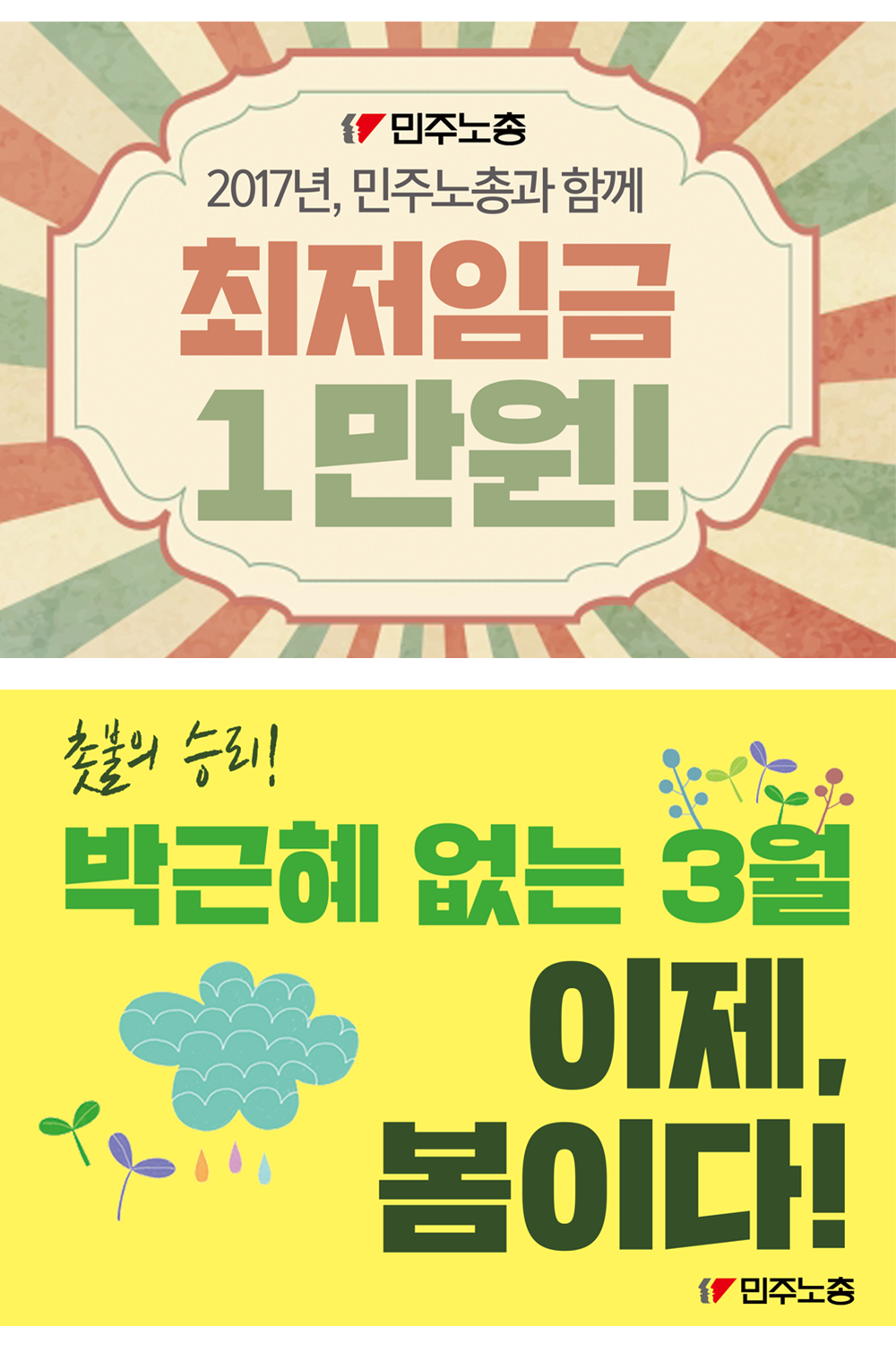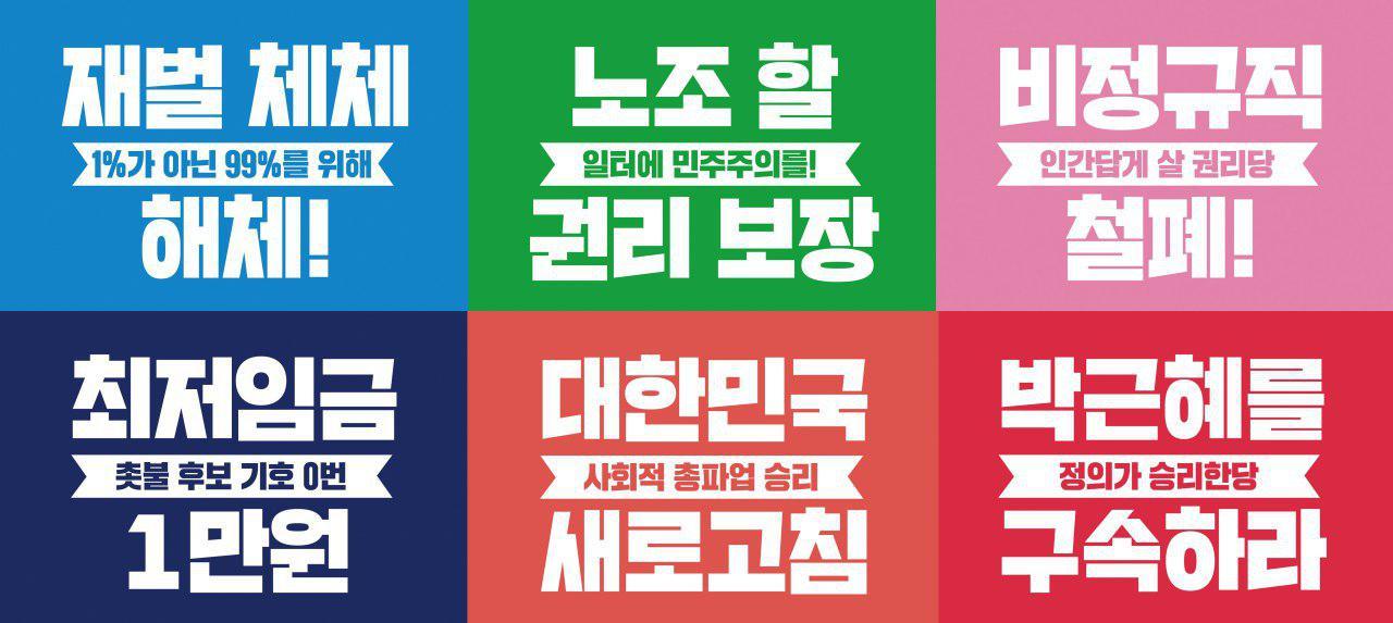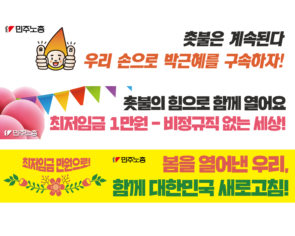 본 아카이브는 민주노총에서 제작한 박근혜 전 대통령 탄핵 관련 웹자보 이미지 및 현수막 시안을 포함한다. 2017년 3월 박근혜 탄핵 이후 새로운 시작과 희망을 표현하고 있으며, 최저임금 1만원 인상 및 비정규직 철폐 등 노동자 권익 향상을 위한 요구를 담고 있다. 촛불집회의 승리를 기념하고 노동자들의 연대를 촉구하는 내용이 주를 이룬다. 다양한 디자인과 문구를 통해 사회적 이슈에 대한 민주노총의 입장을 시각적으로 드러내고 있다.