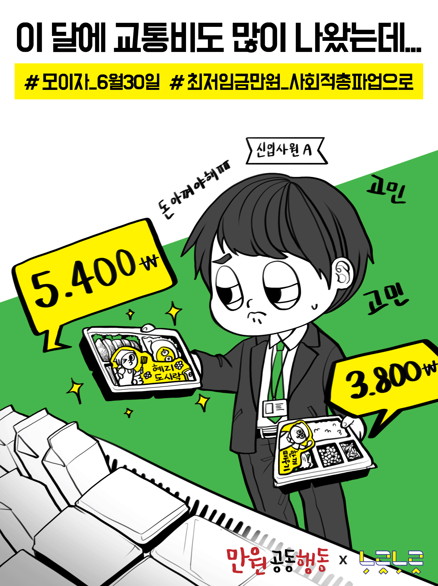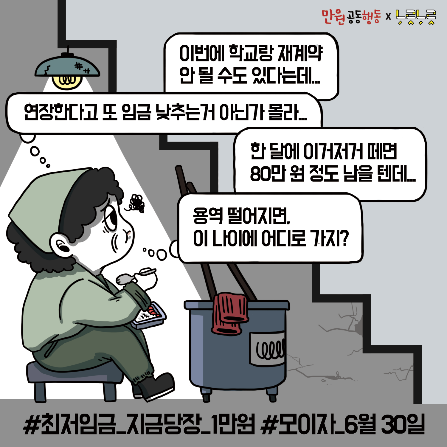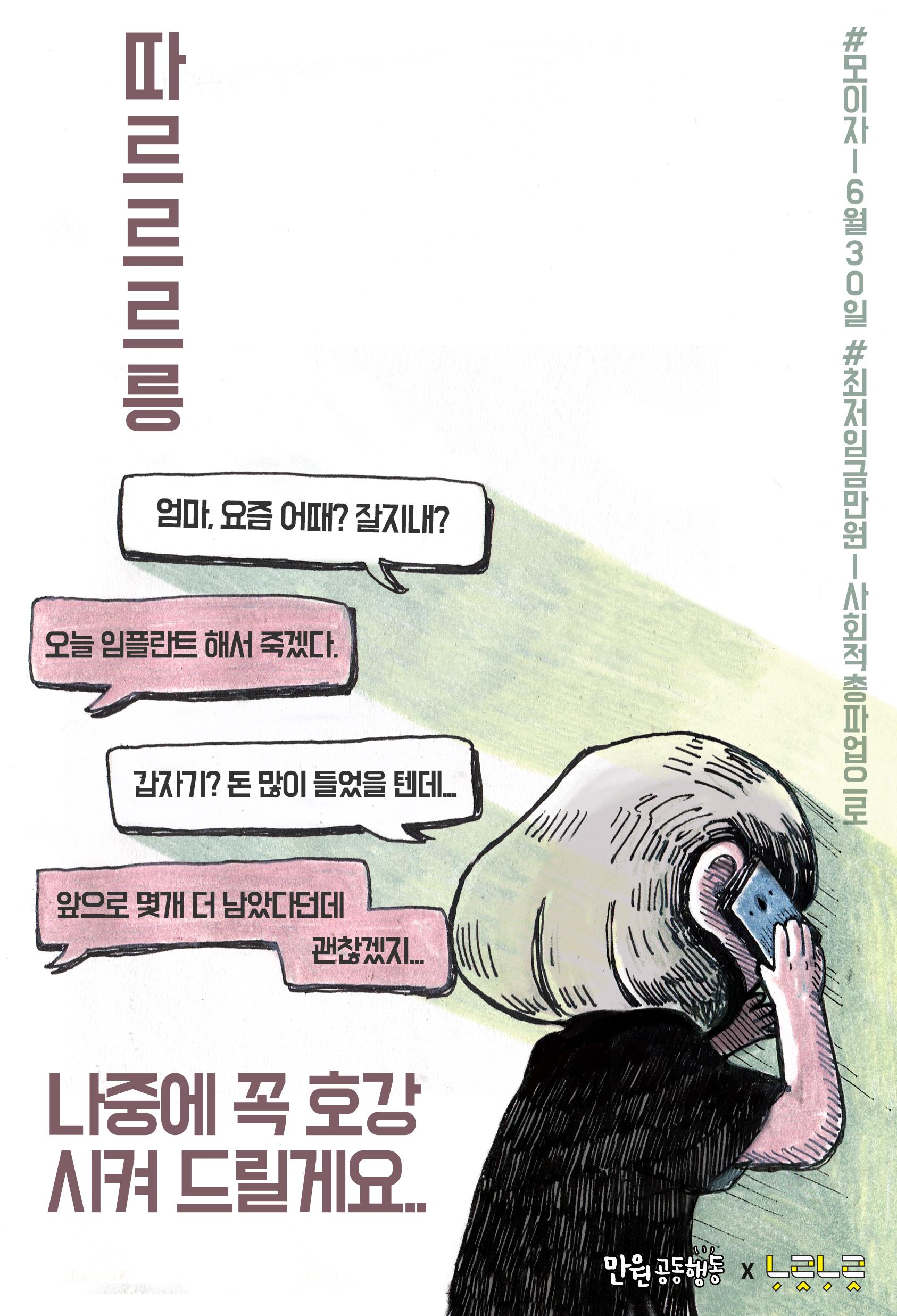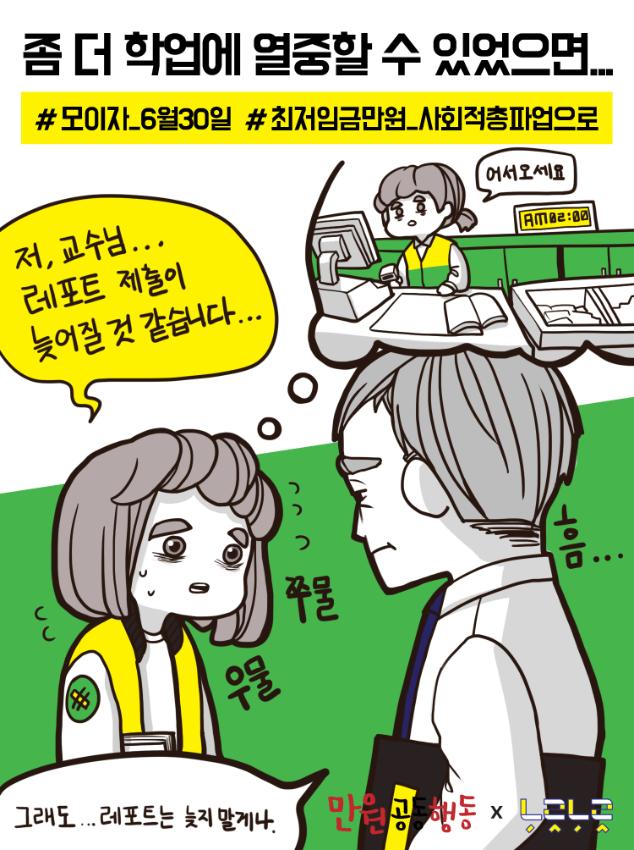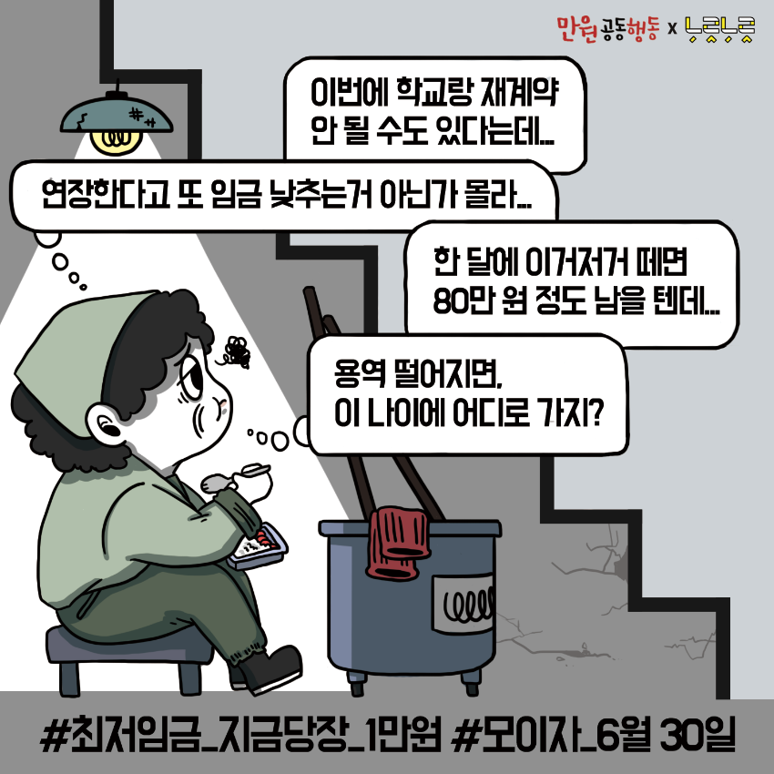 최저임금 인상을 요구하는 웹자보 이미지 자료이다. 대학생, 학교 비정규직 노동자, 중년 여성, 신입사원 등 다양한 계층의 어려움을 묘사하며 최저임금 1만원 인상의 필요성을 강조한다. 등록금 마련에 어려움을 겪는 대학생, 재계약 불안에 시달리는 학교 비정규직 노동자, 임플란트 시술을 받는 어머니, 교통비와 식비에 부담을 느끼는 신입사원의 고충을 보여준다. 6월 30일 최저임금 만원 사회적 총파업에 동참을 호소한다.