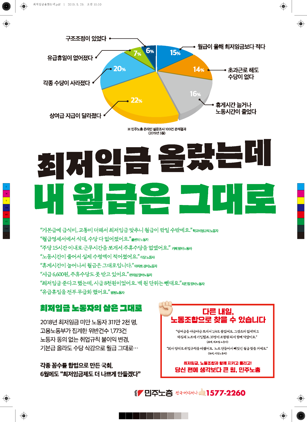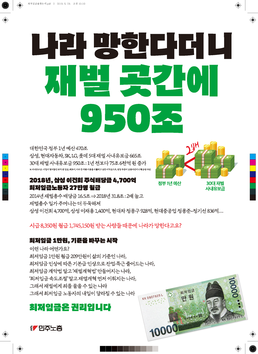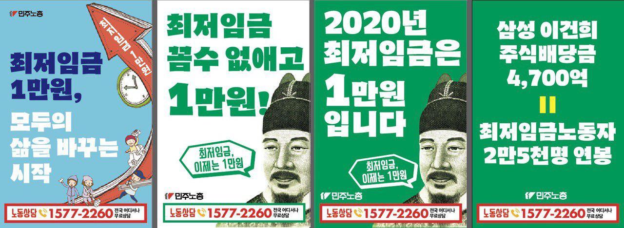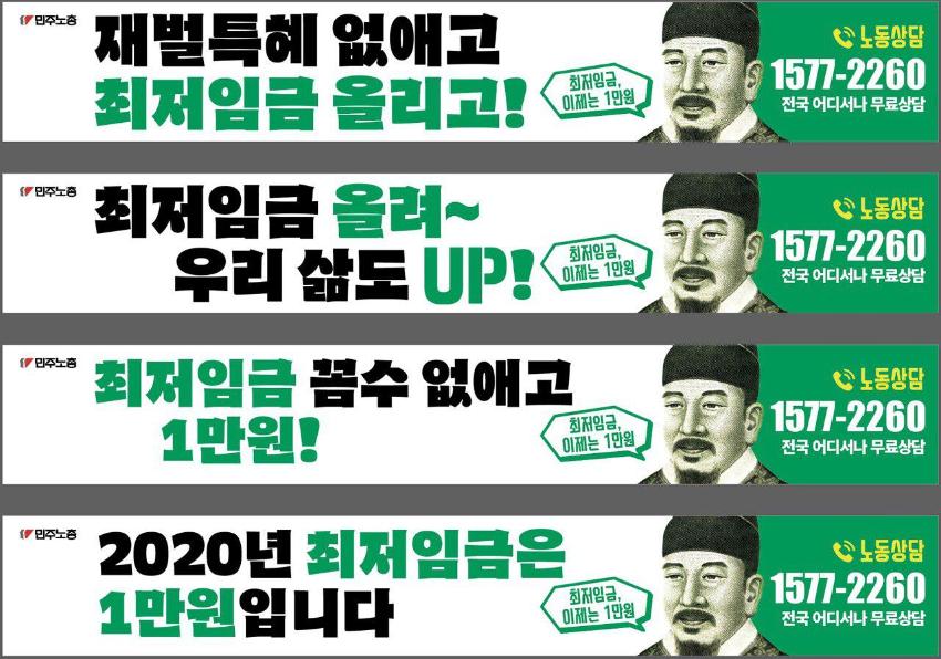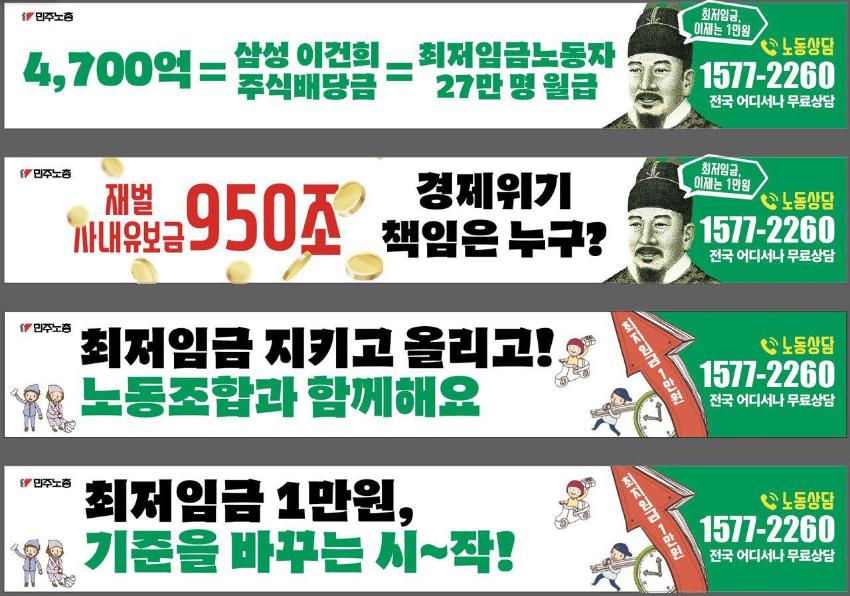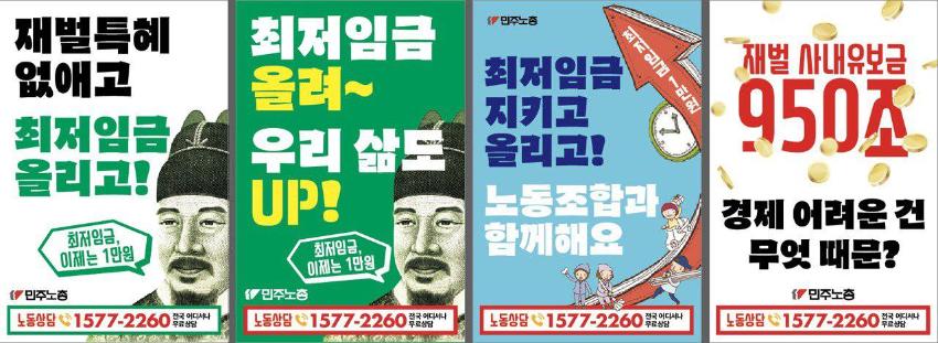민주노총에서 제작한 최저임금 인상 관련 웹자보 모음이다. 웹자보는 최저임금 1만원 인상을 주장하며, 재벌의 사내유보금 문제와 최저임금 노동자의 현실을 지적한다. 또한, 최저임금 인상에도 불구하고 노동자들의 임금 현실이 개선되지 않는 문제점을 비판하고 있다. 노동조합과 함께 최저임금 인상을 위해 노력할 것을 촉구하는 내용도 포함되어 있다.