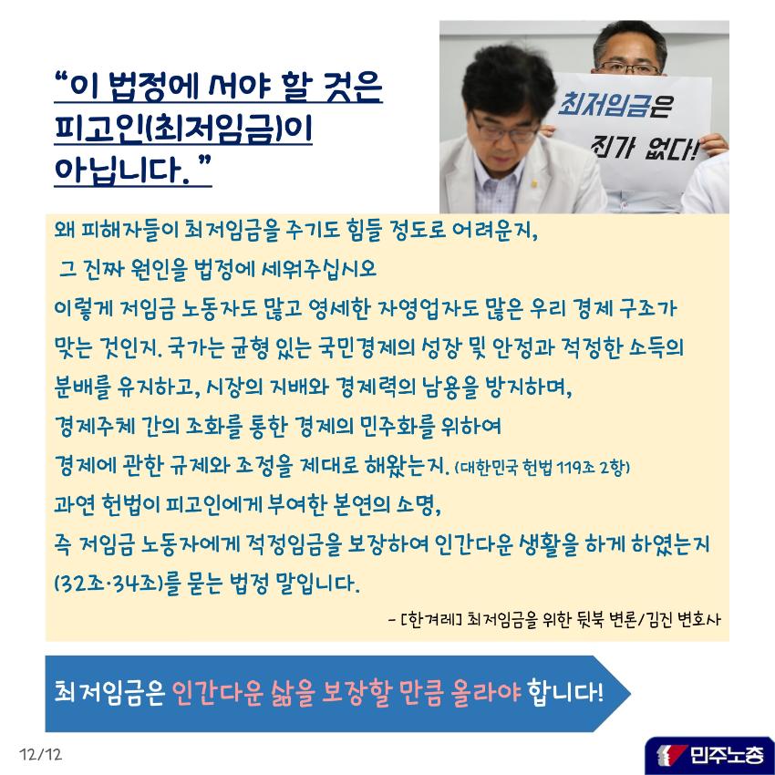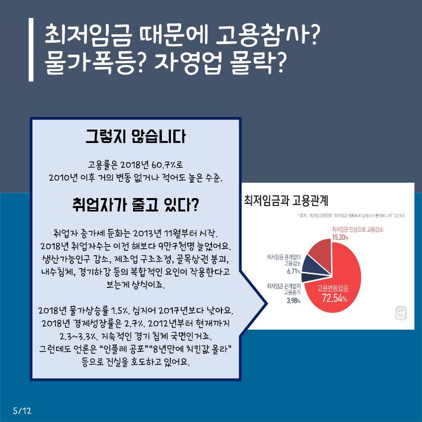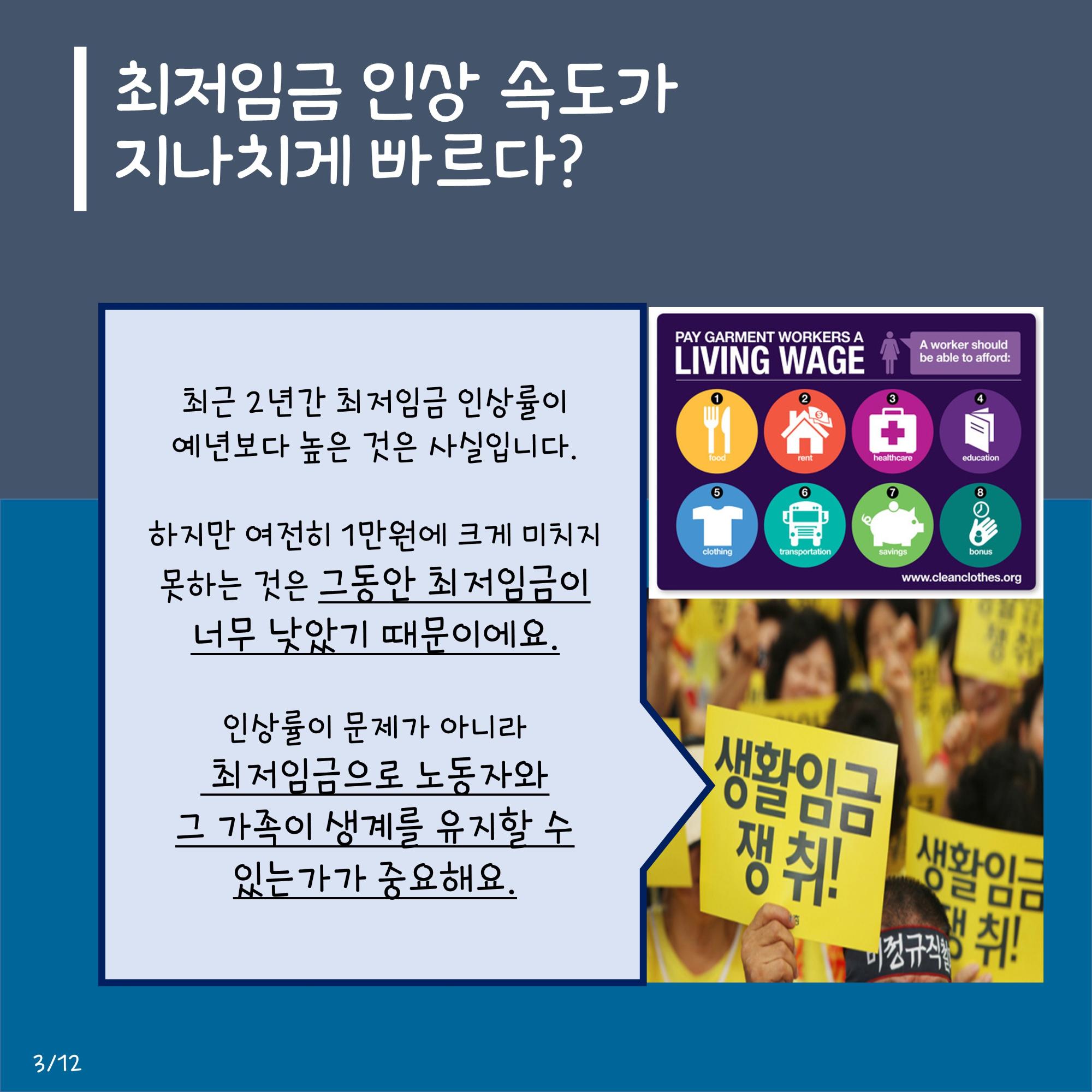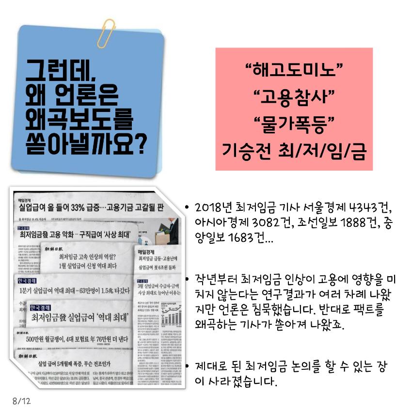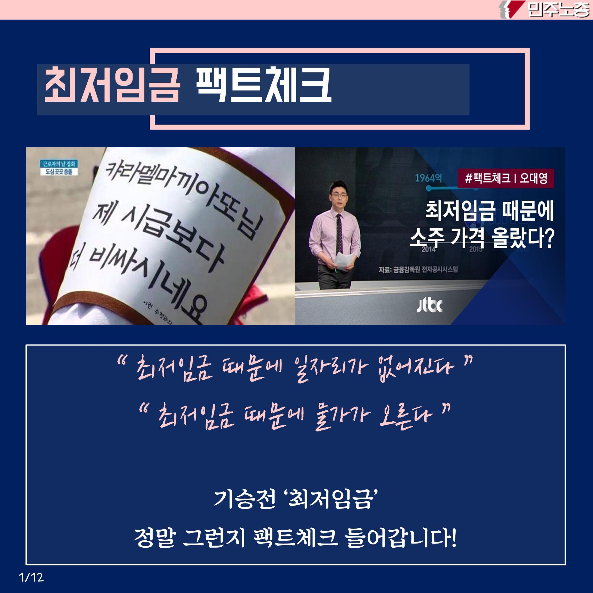 본 자료는 최저임금 인상에 대한 다양한 입장을 담은 웹자보 모음이다. 민주노총은 최저임금 1만원 공약 이행을 촉구하며, 최저임금 인상 범위 축소 및 결정 구조 개악 시도에 반대한다. 또한 최저임금 인상으로 인한 물가 상승 및 일자리 감소 주장에 대한 팩트체크 내용을 제시한다. 일부 자료는 최저임금 인상에 대한 상반된 주장과 언론의 왜곡 보도 문제를 제기하며, 상인들의 어려움도 함께 언급한다.