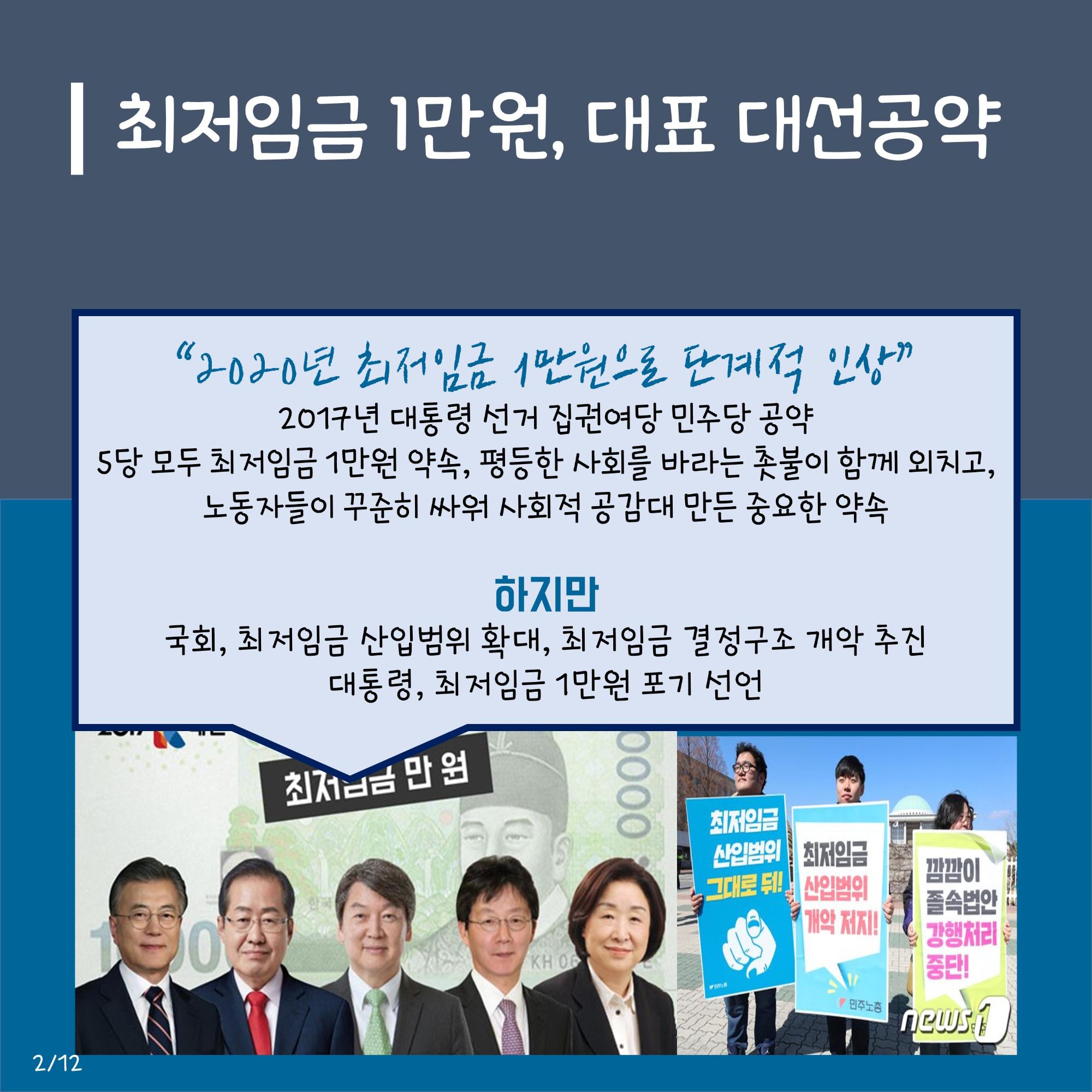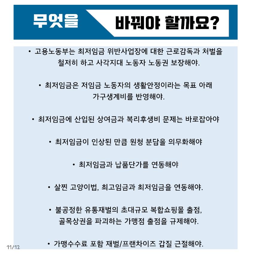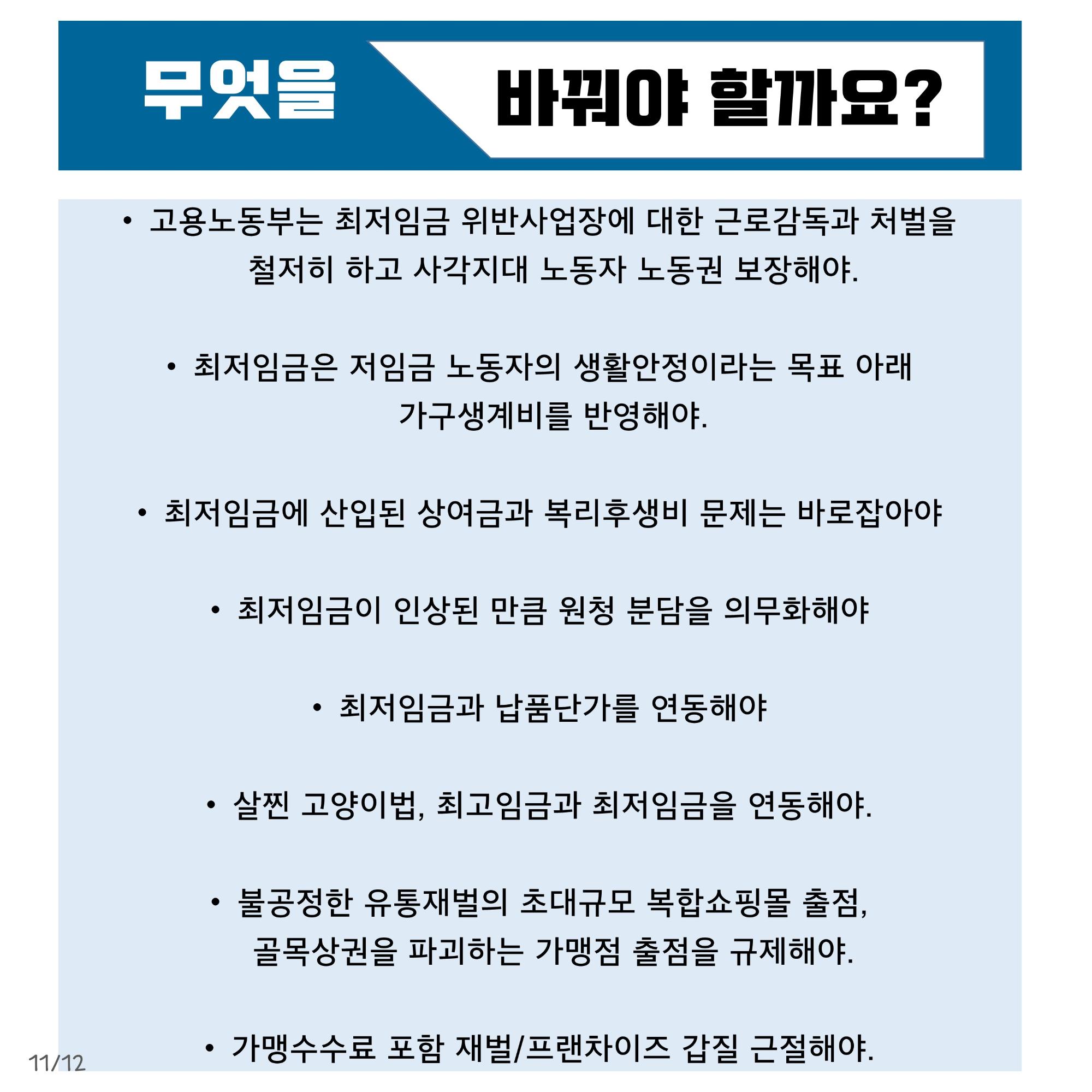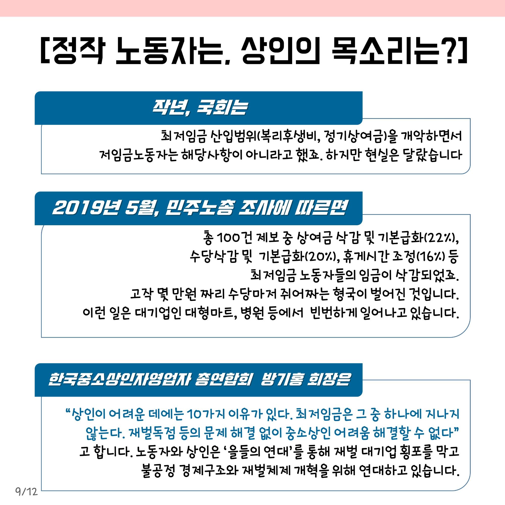 본 자료는 최저임금 인상에 대한 다양한 입장을 담은 웹자보 모음이다. 민주노총은 최저임금 1만원 공약 이행을 촉구하며, 최저임금 인상 범위 축소 및 결정 구조 개악 시도에 반대한다. 또한 최저임금 인상으로 인한 물가 상승 및 일자리 감소 주장에 대한 팩트체크 내용을 제시한다. 일부 자료는 최저임금 인상에 대한 상반된 주장과 언론의 왜곡 보도 문제를 제기하며, 상인들의 어려움도 함께 언급한다.
