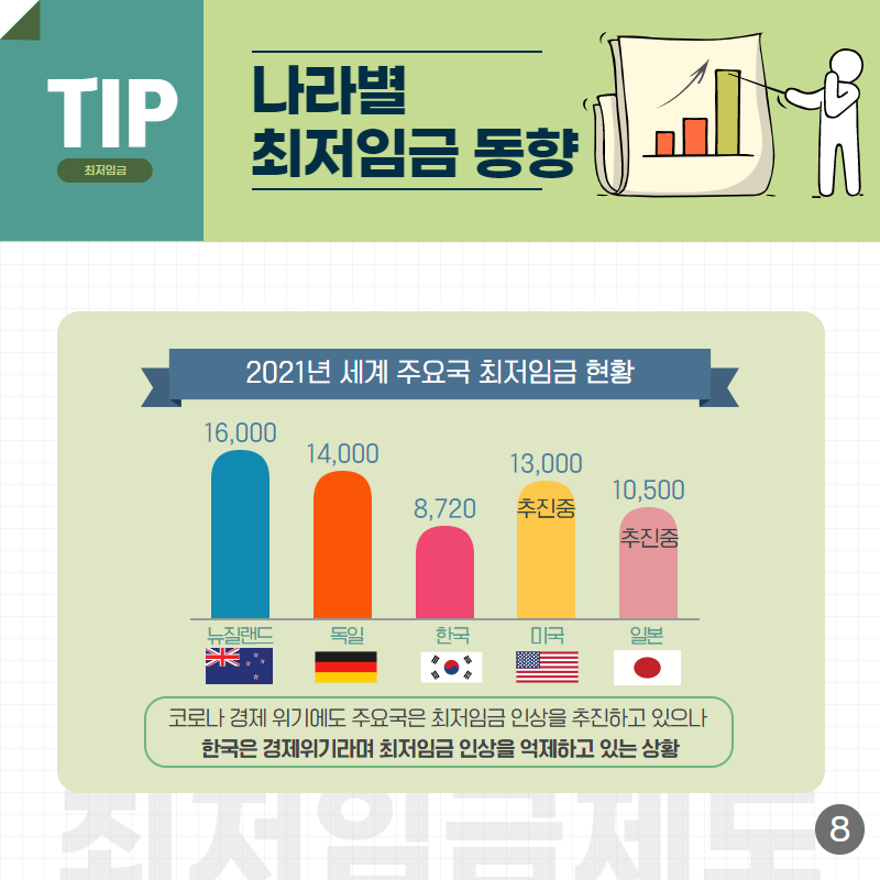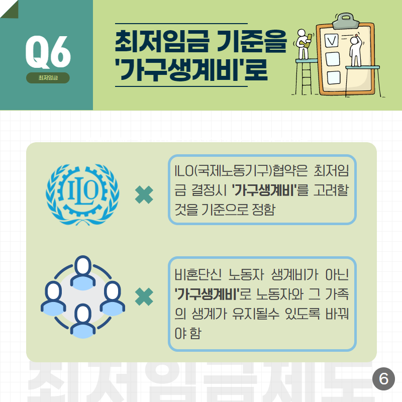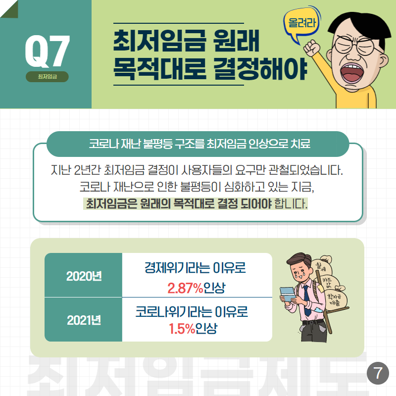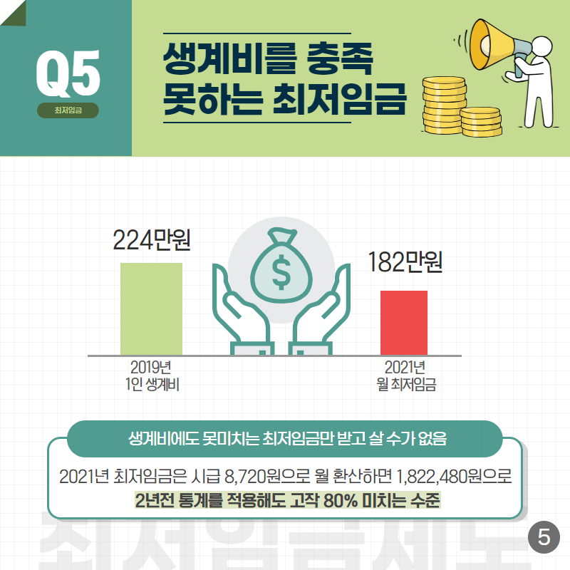민주노총에서 제작한 최저임금 현실화 요구 및 최저임금제도 관련 웹자보 자료이다. 최저임금 제도의 목적과 결정 기준을 설명하고, 최저임금이 노동자의 생계비를 충족하지 못하는 현실을 지적한다. 최저임금 결정 시 가구 생계비를 기준으로 삼아야 한다는 주장과 함께 코로나19 상황에서 최저임금 인상률이 낮았던 점을 비판한다. 또한, 최저임금제도의 정의와 헌법적 근거를 제시하며 노동자의 권익 보호를 강조한다.