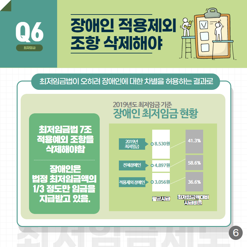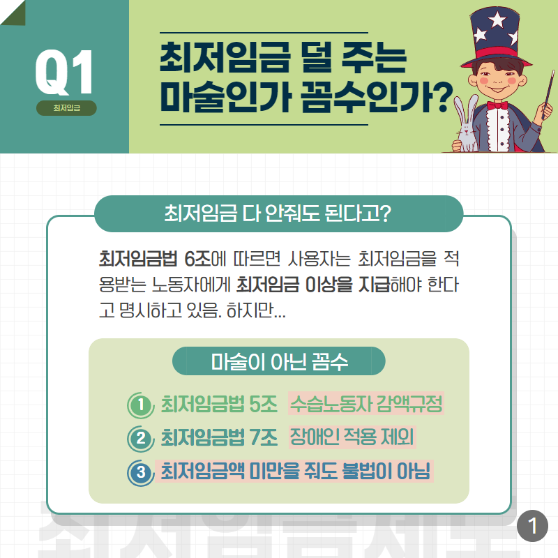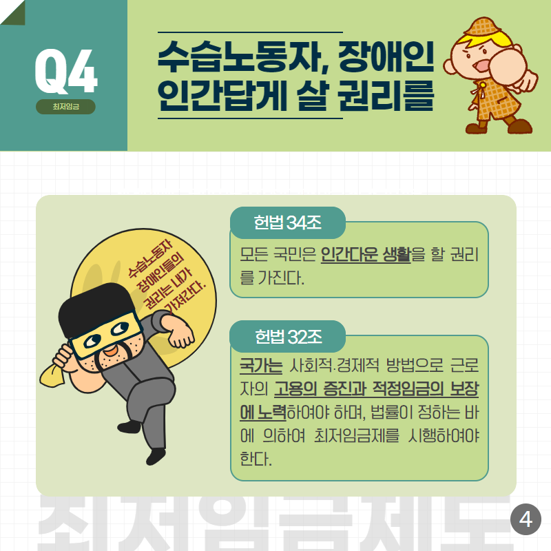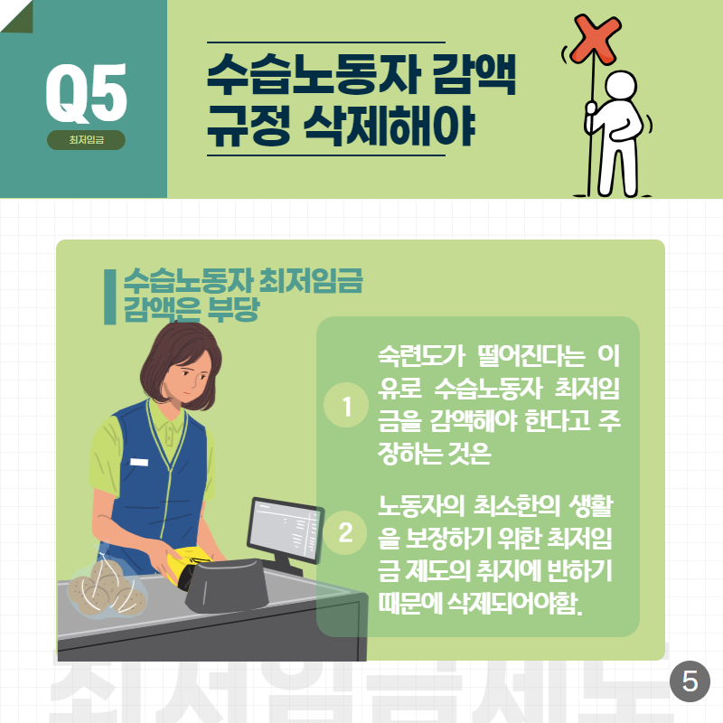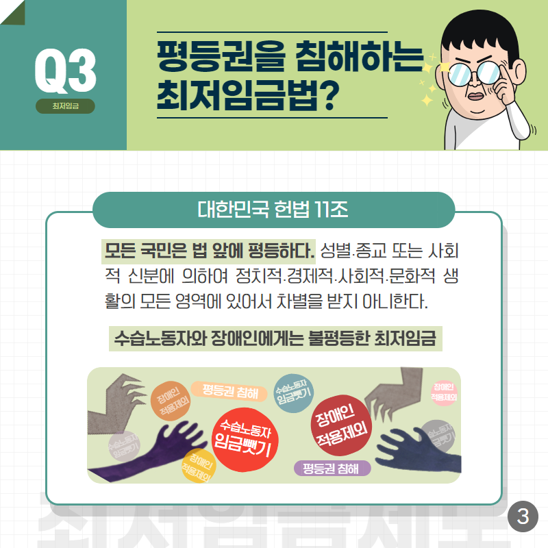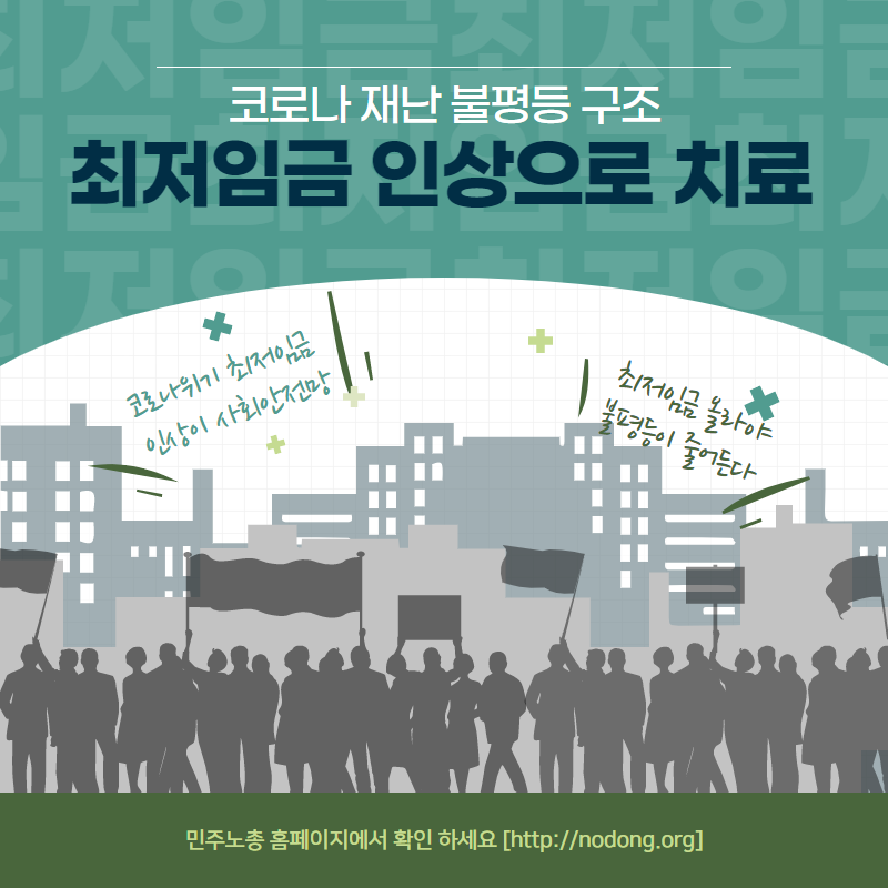 민주노총에서 제작한 최저임금 관련 웹자보 모음이다. 최저임금 현실화의 필요성을 강조하며, 최저임금 미만 노동자들의 현실과 최저임금법의 예외 조항 문제점을 지적한다. 특히 수습 노동자 감액 규정, 장애인 적용 제외 등 차별적 조항의 개선을 요구한다. 최저임금 인상을 통한 노동자 생계 보장과 불평등 해소를 주장하는 내용이 포함되어 있다.