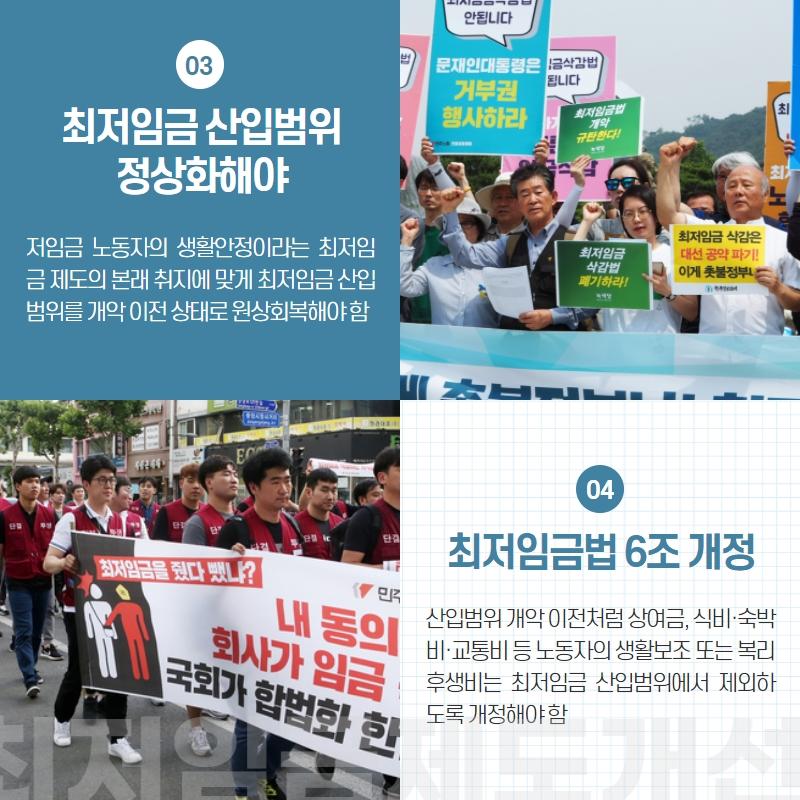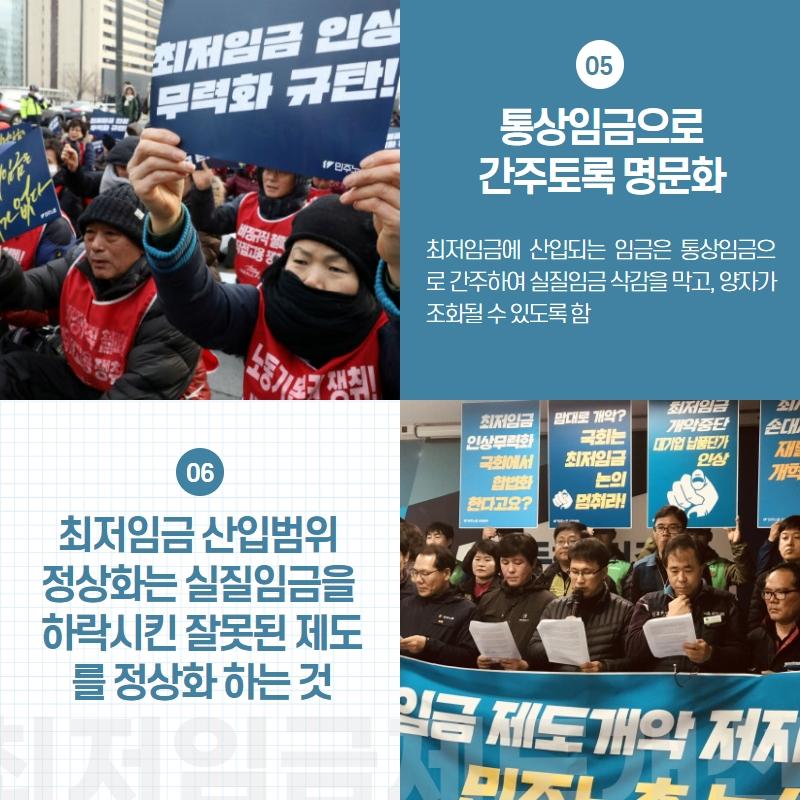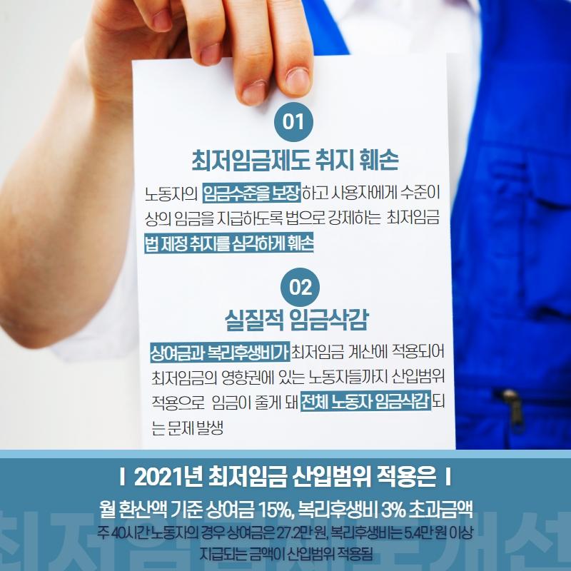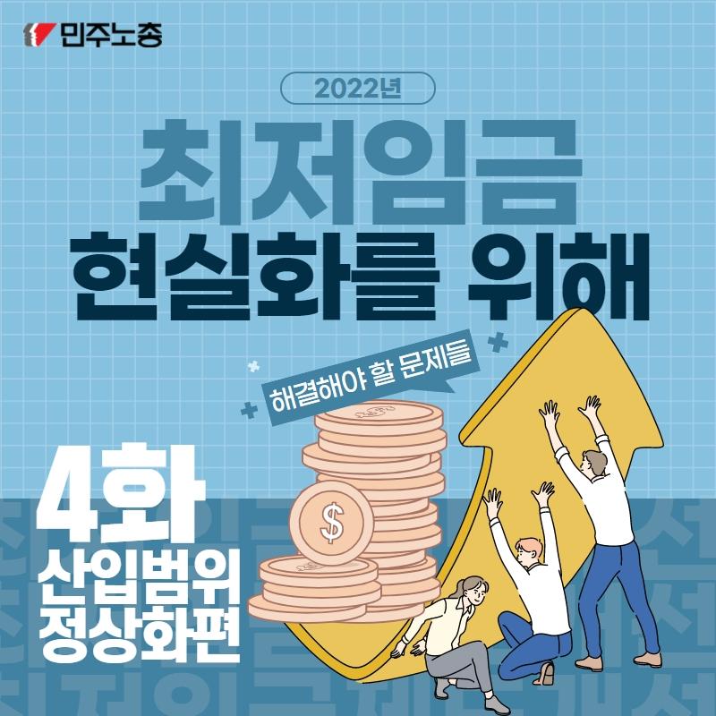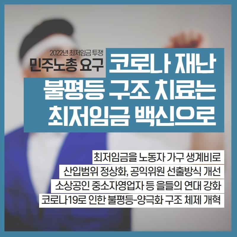 민주노총이 2022년 최저임금 현실화를 위해 해결해야 할 문제들을 제시하는 웹자보이다. 최저임금 제도의 취지 훼손, 실질 임금 삭감, 최저임금 산입 범위 정상화 필요성, 최저임금법 6조 개정, 통상임금으로 간주 명문화 등을 주장한다. 코로나19 재난 속 불평등 구조 치료를 위해 최저임금 백신이 필요하다고 강조한다.