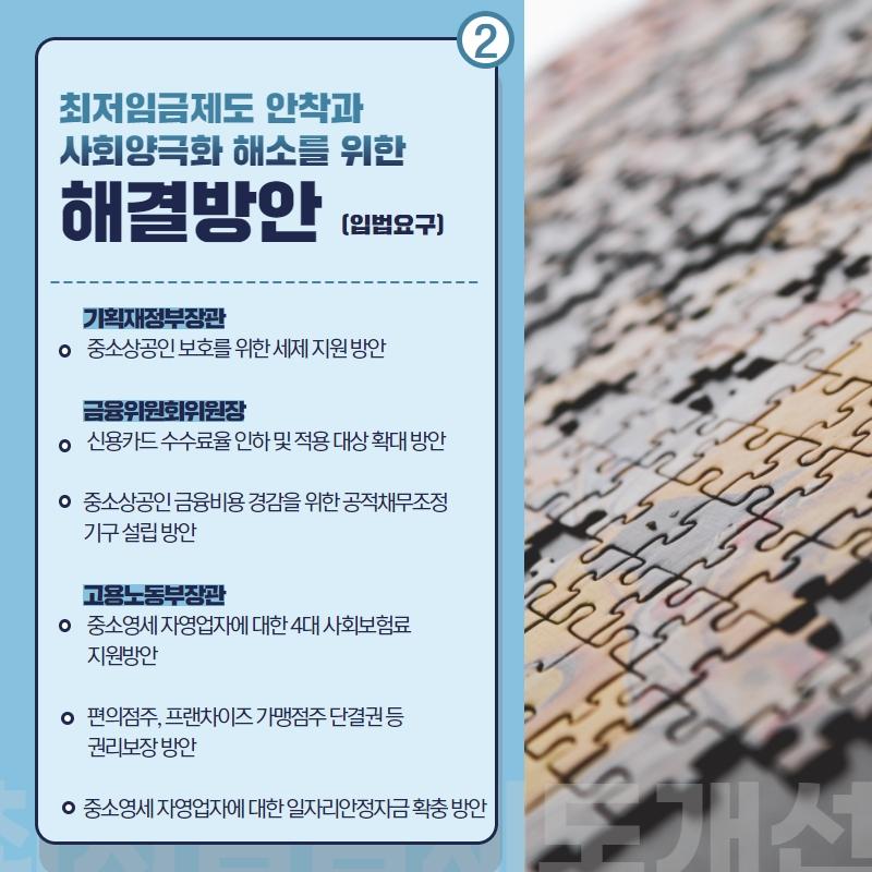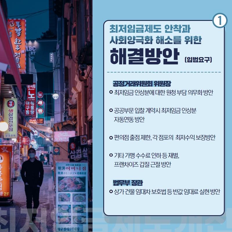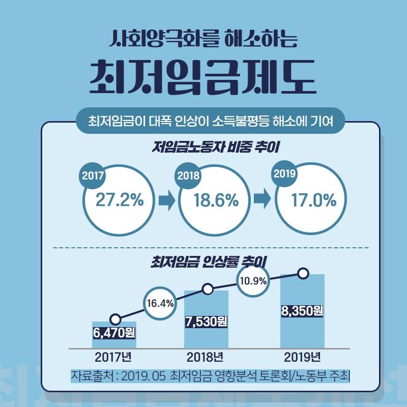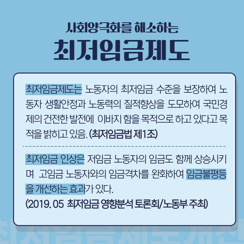 최저임금 제도 안착과 사회 양극화 해소 방안을 모색하는 웹자보 자료이다. 민주노총은 최저임금 인상에 따른 중소상공인 보호 방안과 정부 부처의 역할에 대한 요구사항을 제시한다. 노동부는 최저임금제의 목적과 효과를 설명하며, 임금격차 완화 및 노동자 생활 안정에 기여함을 강조한다. 해당 자료는 최저임금 관련 정책 논의와 노동 현장의 목소리를 담고 있다.