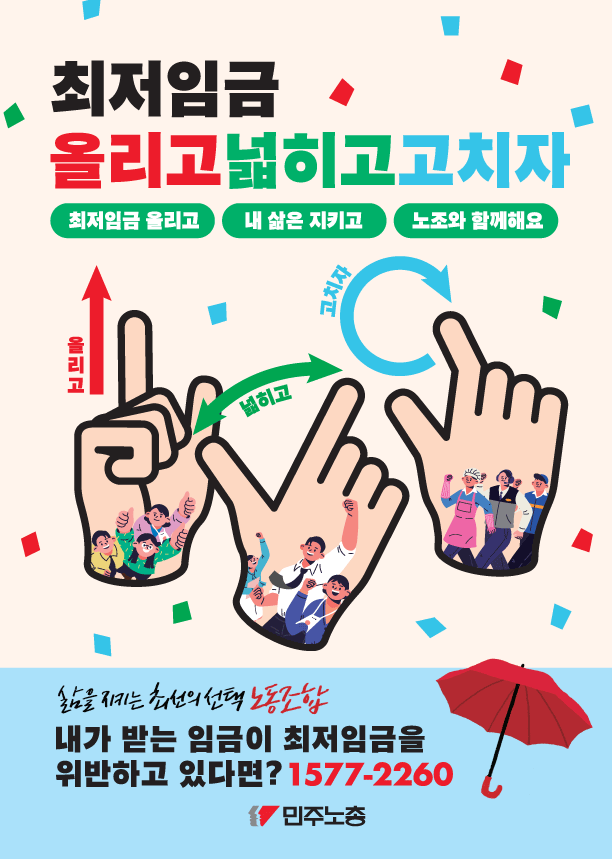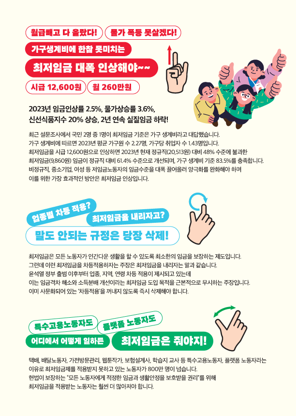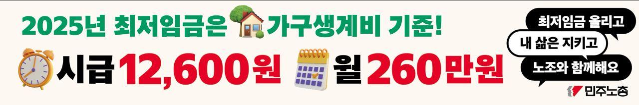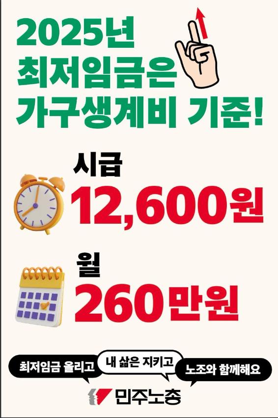 본 기록물은 민주노총에서 제작한 2025년 최저임금 인상 관련 웹자보 및 선전물이다. 가구생계비를 기준으로 시급 12,600원, 월 260만원의 최저임금을 요구하고 있다. 최저임금 인상을 통해 노동자들의 삶을 지키고 노조와 함께하자는 내용을 담고 있다. 또한 최저임금 인상 필요성과 차등 적용 문제점, 특수고용노동자 및 플랫폼 노동자에게도 최저임금 적용이 필요함을 주장한다.