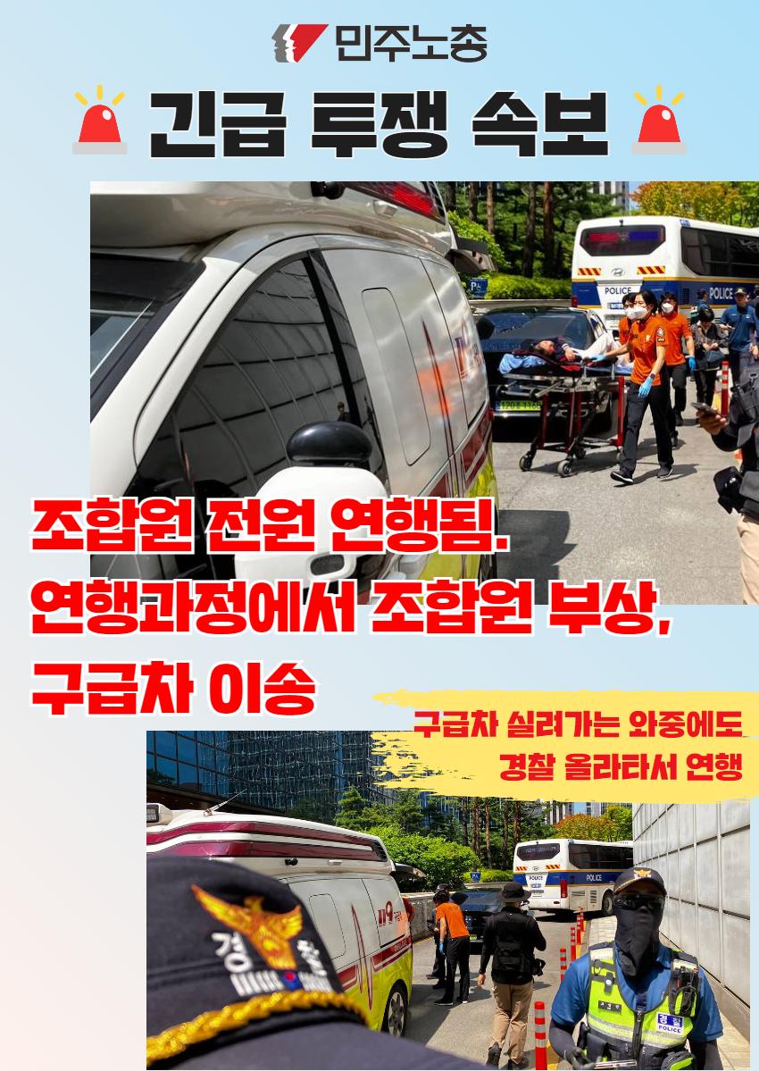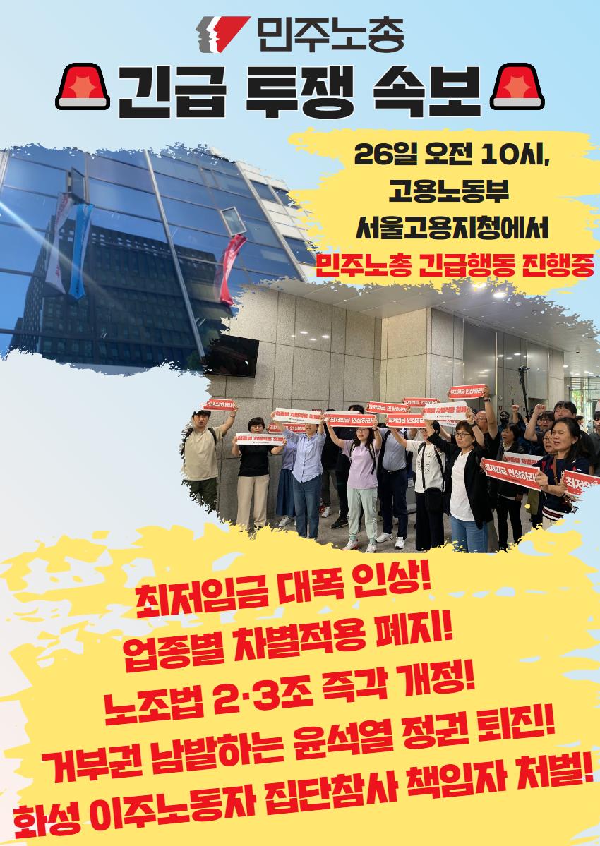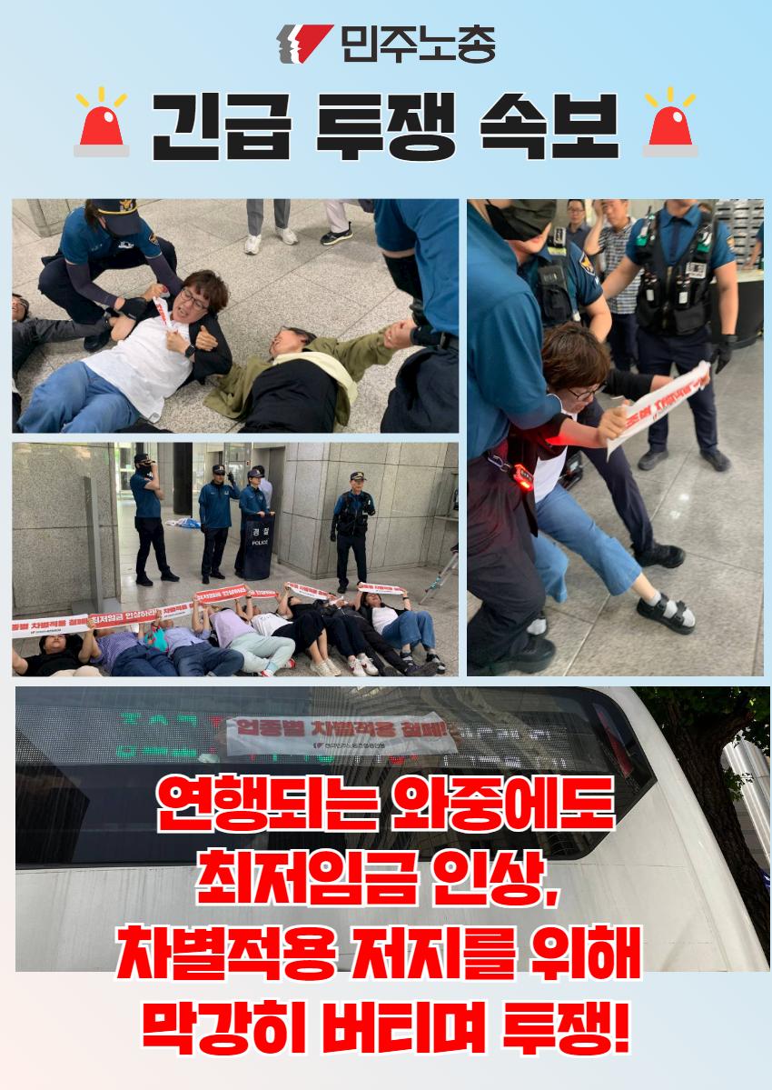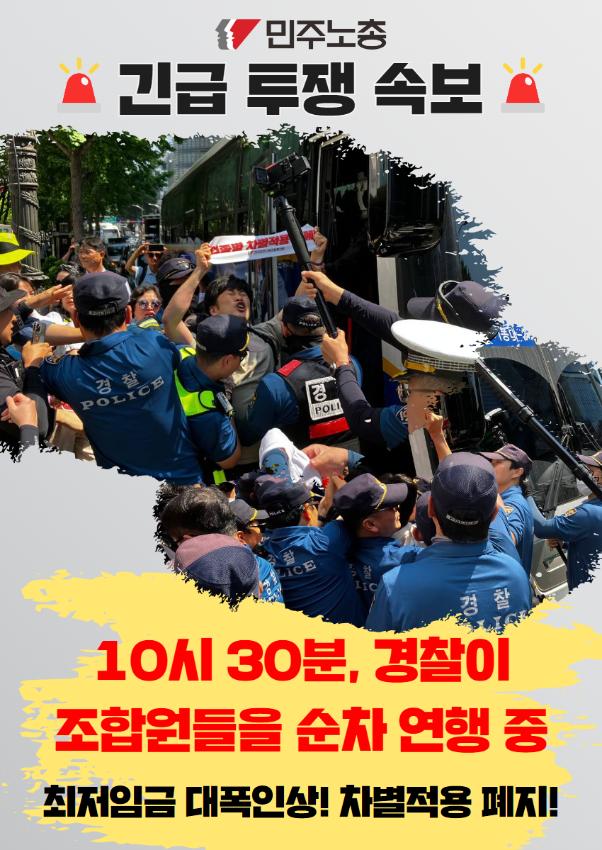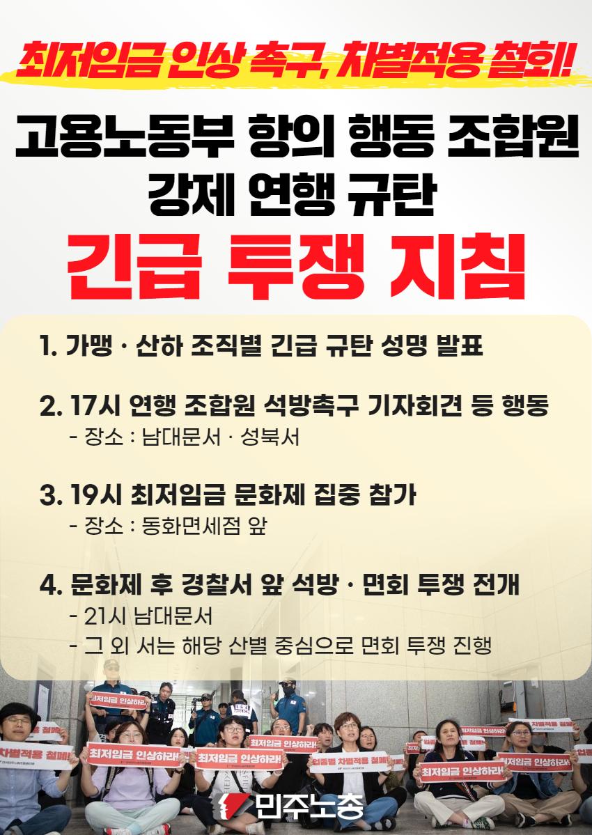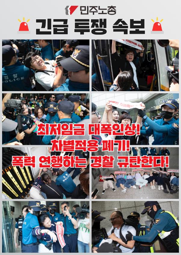민주노총이 최저임금 인상과 차별 적용 철회를 촉구하며 고용노동부 항의 행동 조합원 강제 연행을 규탄하는 긴급 투쟁 지침을 발표했다. 지침에는 산하 조직의 긴급 규탄 성명 발표, 연행 조합원 석방 촉구 기자회견, 최저임금 문화제 집중 참가 등의 내용이 담겨 있다. 또한 문화제 후 경찰서 앞 석방 및 면회 투쟁을 전개하고, 그 외에는 해당 산별 중심으로 면회 투쟁을 진행할 것을 지시했다. 게시물에는 경찰에 의해 연행되는 사람들의 모습과 시위 현장 사진이 담겨 있다.