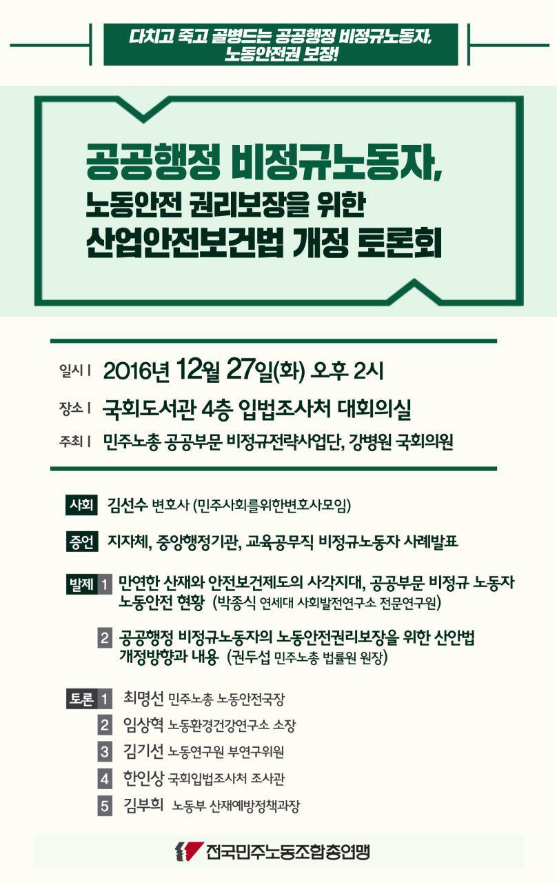본 문서는 공공행정 비정규노동자의 노동안전 권리보장을 위한 산업안전보건법 개정 토론회 웹자보이다. 토론회는 2016년 12월 27일 국회도서관에서 개최되었다. 토론회에서는 만연한 산재와 안전보건제도의 사각지대, 공공부문 비정규 노동자 노동안전 현황과 공공행정 비정규노동자의 노동안전권리보장을 위한 산안법 개정방향과 내용이 논의되었다. 최명선 민주노총 노동안전국장, 임상혁 노동환경건강연구소 소장, 김기선 노동연구원 부연구위원, 한인상 국회입법조사처 조사관, 김부희 노동부 산재예방정책과장이 토론자로 참여했다.