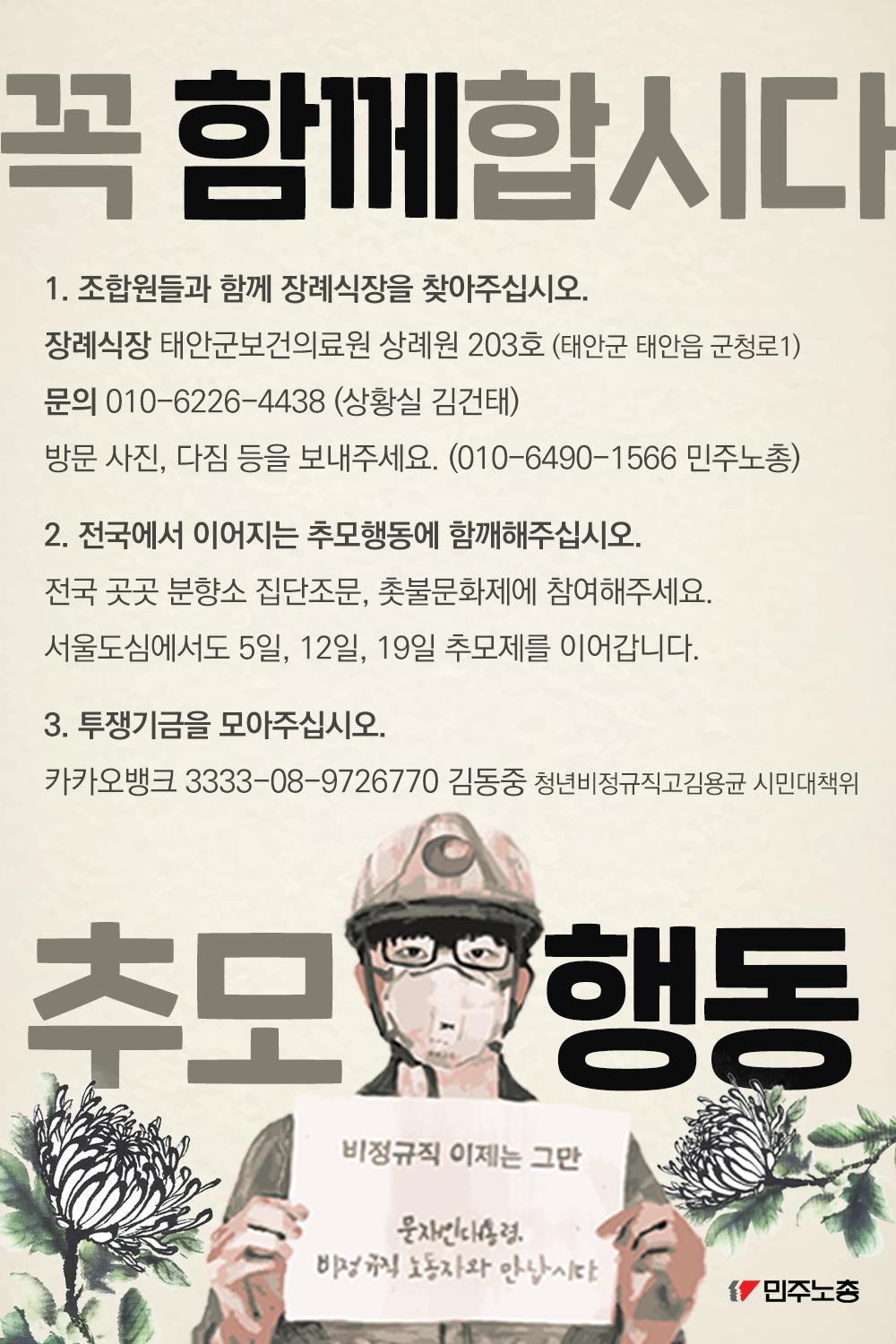 본 웹자보는 비정규직 노동자의 죽음에 대한 추모와 연대를 촉구하는 내용을 담고 있다. 조합원들에게 장례식장 방문을 요청하고, 전국 각지에서 진행되는 추모 행동에 동참을 호소한다. 또한, 투쟁 기금 모금을 통해 비정규직 문제 해결을 위한 지속적인 활동을 지원하고자 한다. 비정규직 문제 해결을 촉구하는 메시지를 담고 있다.