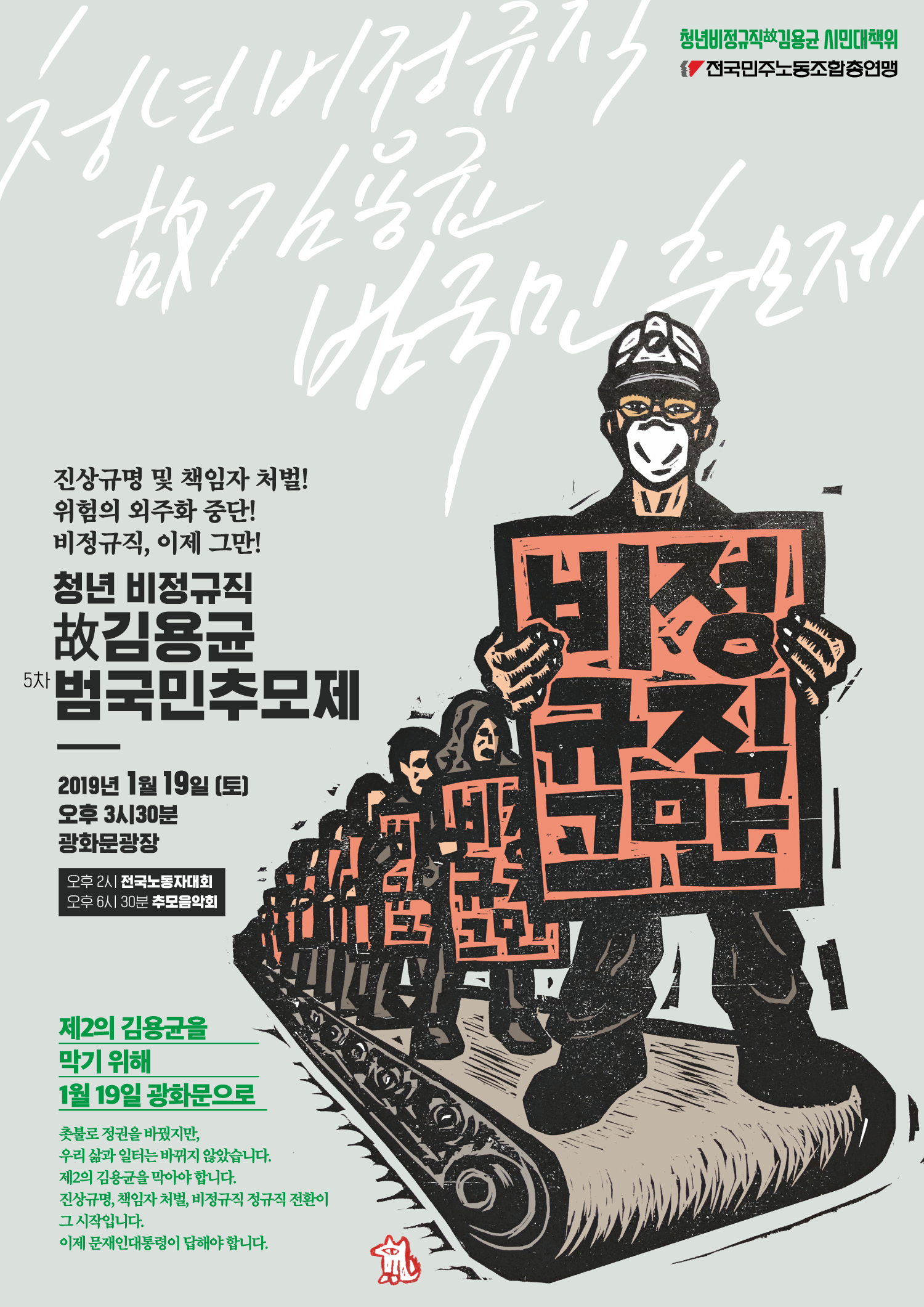 본 웹자보는 청년 비정규직 노동자 김용균의 죽음을 추모하고, 비정규직 문제 해결을 촉구하기 위해 제작되었다. 2019년 1월 19일 광화문 광장에서 추모제가 개최될 예정이며, 전국 노동자 대회와 추모 음악회도 함께 진행된다. 웹자보는 위험의 외주화 중단과 비정규직 철폐를 요구하며, 제2의 김용균이 발생하는 것을 막기 위해 문재인 대통령의 답변을 촉구하고 있다. 촛불로 정권은 바뀌었지만 노동자들의 삶과 일터는 바뀌지 않았다는 점을 강조한다.