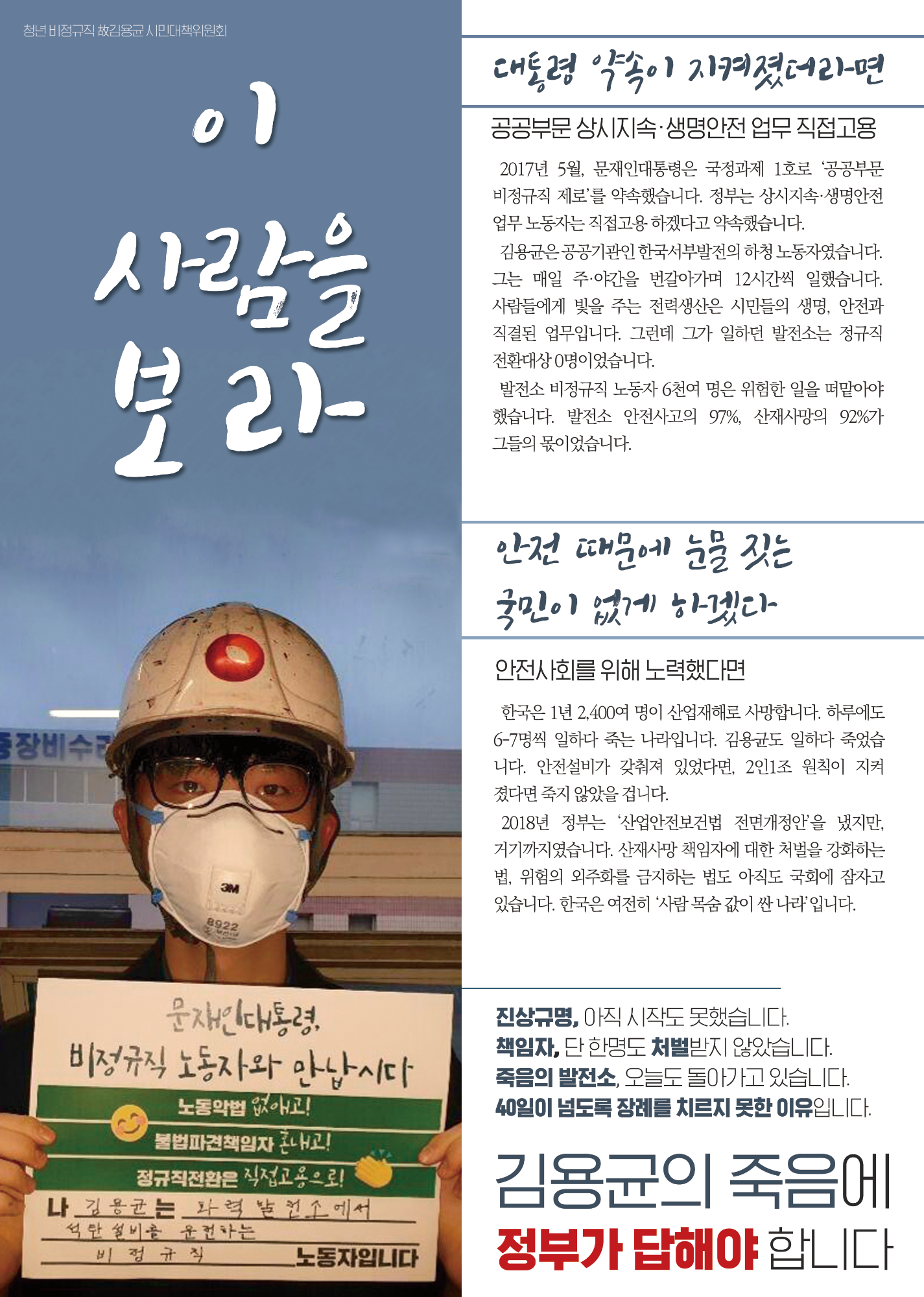 해당 유인물은 2018년 12월 태안화력발전소에서 발생한 김용균 노동자 사망사고와 관련하여 제작되었다. 민주노총은 사고의 진상 규명과 책임자 처벌, 재발 방지 대책 마련을 정부에 촉구했다. 특히 위험의 외주화 문제 해결과 안전한 노동 환경 보장을 요구하며, 정부의 적극적인 대응을 촉구하는 내용이 담겨 있다. 당시 민주노총은 김용균 노동자 사망사고를 계기로 산업재해 예방을 위한 사회적 논의를 활발히 전개했다.