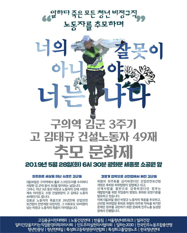 구의역 김군 사망 3주기와 고 김태규 건설노동자 49재를 맞아 추모 문화제를 개최한다. 비정규 노동자의 산재 사망이 계속되는 현실을 지적하며, 김용균 노동자 사망 이후 산업안전보건법이 개정되었음에도 불구하고 여전히 많은 비정규 노동자들이 죽음에 내몰리고 있음을 비판한다. 위험의 외주화 금지 약속이 지켜지지 않고, 산재 사망을 줄이겠다는 정부의 약속 또한 후퇴하고 있다고 주장한다. 이에 청년 비정규 노동자의 죽음을 추모하고, 산안법 하위법령 후퇴를 규탄하기 위한 문화제를 민주노총 농성장 앞에서 진행한다.