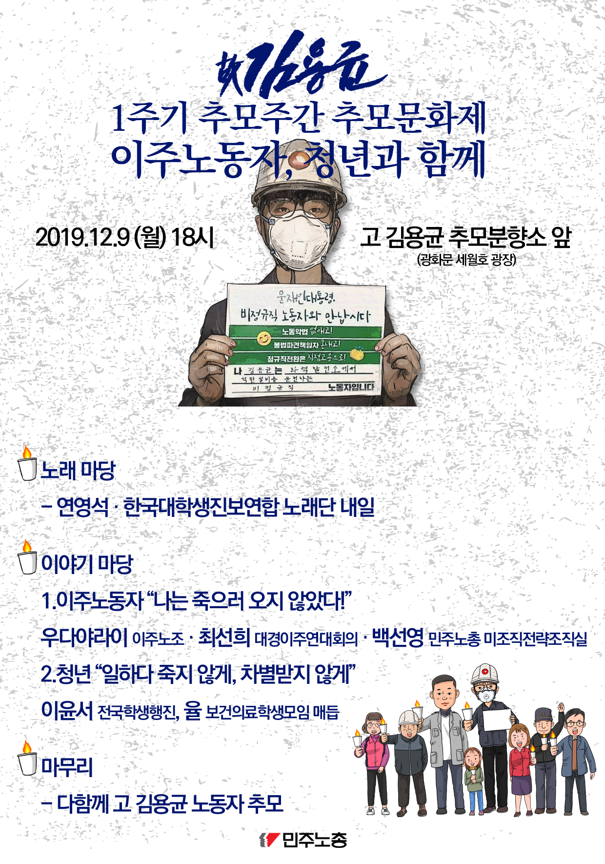 고 김용균 노동자 1주기 추모주간 추모문화제 웹자보이다. 2019년 12월 9일 광화문 세월호 광장에서 이주노동자, 청년과 함께 진행된다. 노래 마당, 이야기 마당, 마무리 순서로 구성되어 있다. 이야기 마당에서는 이주노동자의 발언과 청년의 발언이 예정되어 있다.
