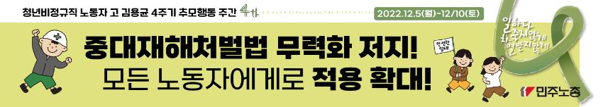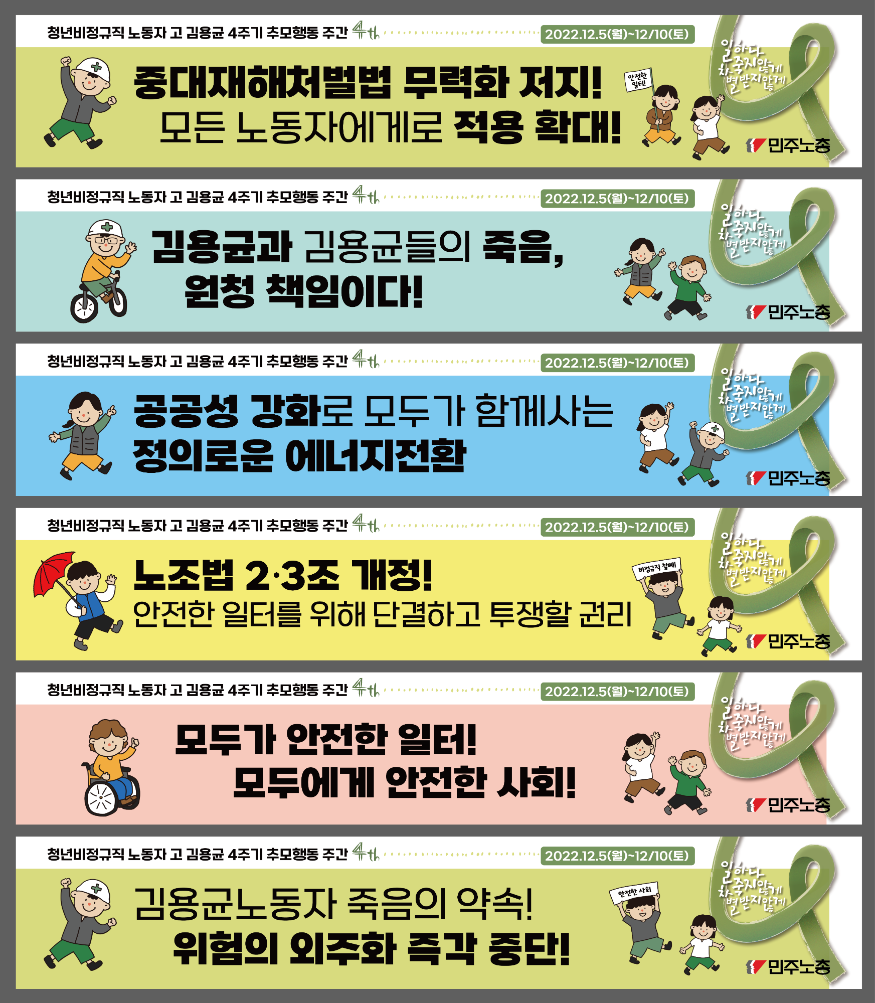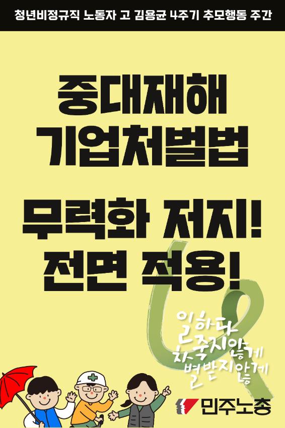 해당 자료는 청년비정규직 노동자 고 김용균 4주기 추모행동과 관련하여 민주노총에서 제작한 웹자보이다. 웹자보는 총 3가지 파일로 구성되어 있으며, 각 파일은 6~8개의 이미지로 이루어져 있다. 이미지에는 '중대재해 기업처벌법 무력화 저지', '원청 경영책임자 책임져라', '불안전노동 무권리 차별' 등의 문구가 담겨 있다. 자료를 통해 민주노총은 김용균 노동자의 죽음을 추모하고, 노동 환경 개선을 위한 사회적 관심을 촉구하고자 한다.