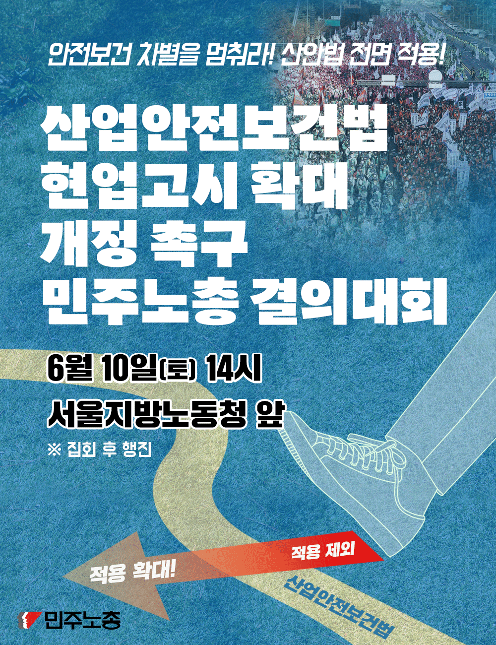 본 웹자보는 민주노총에서 산업안전보건법의 현업고시 확대를 요구하며 개정을 촉구하는 결의대회를 알리는 내용을 담고 있다. 결의대회는 6월 10일 토요일 14시에 서울지방노동청 앞에서 개최될 예정이다. 웹자보는 안전보건 차별을 멈추고 산업안전보건법을 전면 적용할 것을 강조하고 있다. 또한, 집회 후 행진이 예정되어 있음을 알리고 있다.