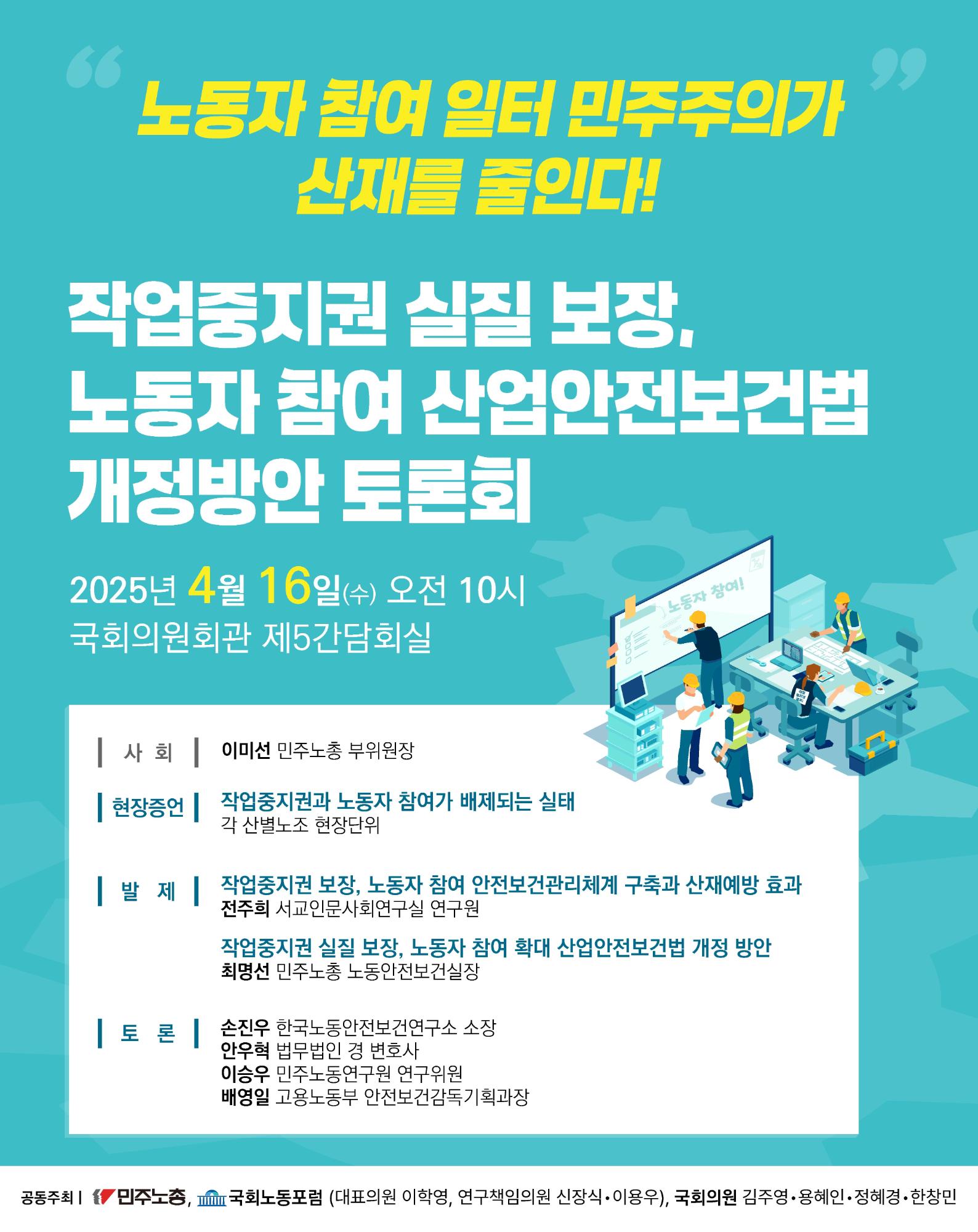 본 웹자보는 작업중지권 실질 보장과 노동자 참여를 위한 산업안전보건법 개정 방안 토론회 개최를 알리고 있다. 토론회는 2025년 4월 16일 국회의원회관에서 열릴 예정이다. 토론회에서는 작업중지권 보장과 노동자 참여 안전보건관리체계 구축, 산재예방 효과 등에 대한 논의가 이루어진다. 또한, 작업중지권 실질 보장과 노동자 참여 확대를 위한 산업안전보건법 개정 방안이 제시될 예정이다.