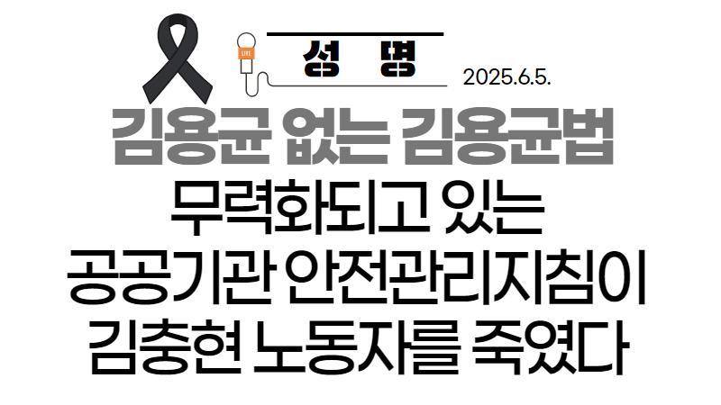 이 성명은 김용균법이 제대로 시행되지 않아 노동자의 안전이 위협받고 있음을 비판한다. 공공기관 안전관리지침이 무력화되어 김충현 노동자가 사망한 사건을 계기로 작성되었다. 김용균법의 실질적인 적용과 노동 현장의 안전 강화 필요성을 강조한다. 노동자의 생명과 안전을 보호하기 위한 제도 개선을 촉구하는 내용이다.