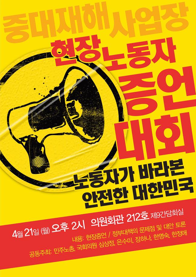 본 웹자보는 중대재해사업장 현장노동자 증언대회 개최를 알리고 있다. 노동자들이 바라는 안전한 대한민국을 주제로 증언대회가 열린다. 현장증언과 정부대책의 문제점 및 대안 토론이 진행될 예정이다. 민주노총과 국회의원 심상정, 은수미, 장하나, 한명숙, 한정애가 공동 주최한다.