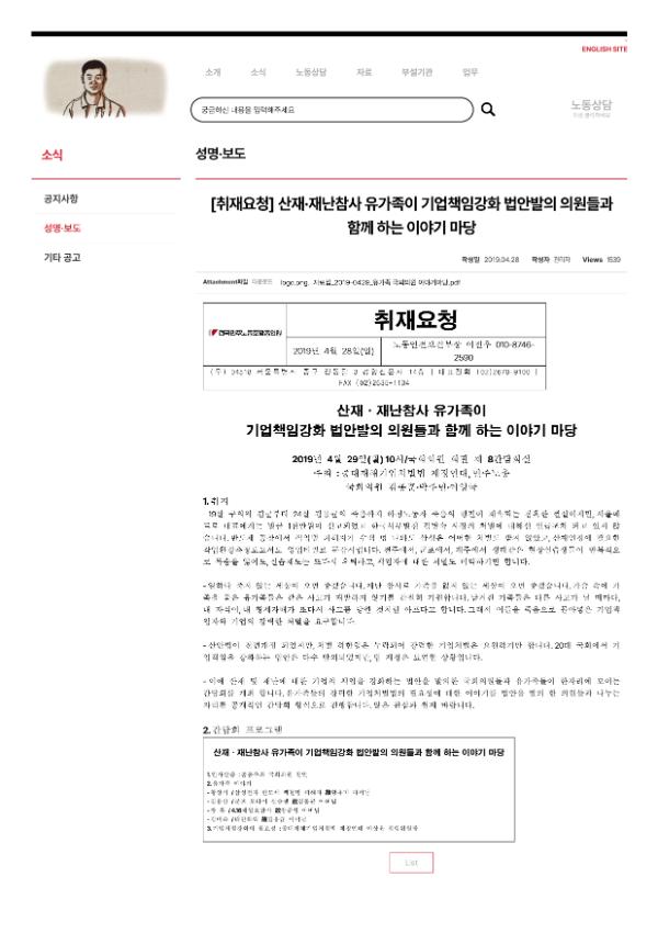민주노총은 산재·재난참사 유가족이 기업책임강화 법안발의 의원들과 함께 하는 이야기 마당을 개최한다고 밝혔다. 2019년 4월 29일 국회의원회관에서 열리는 이번 행사에서는 중대재해기업처벌법 제정연대, 민주노총, 국회의원 김종훈·박주민·여영국이 공동으로 주최한다. 구의역 김군, 김용균 노동자의 죽음 등 하청노동자 죽음의 행진이 계속되는 현실을 지적하며, 기업의 미약한 처벌과 책임 회피 문제를 제기했다. 산재 및 재난에 대한 기업의 책임을 강화하는 법안을 발의한 국회의원들과 유가족들이 모여 간담회를 진행하고, 기업처벌법의 필요성에 대한 이야기를 나눌 예정이다.