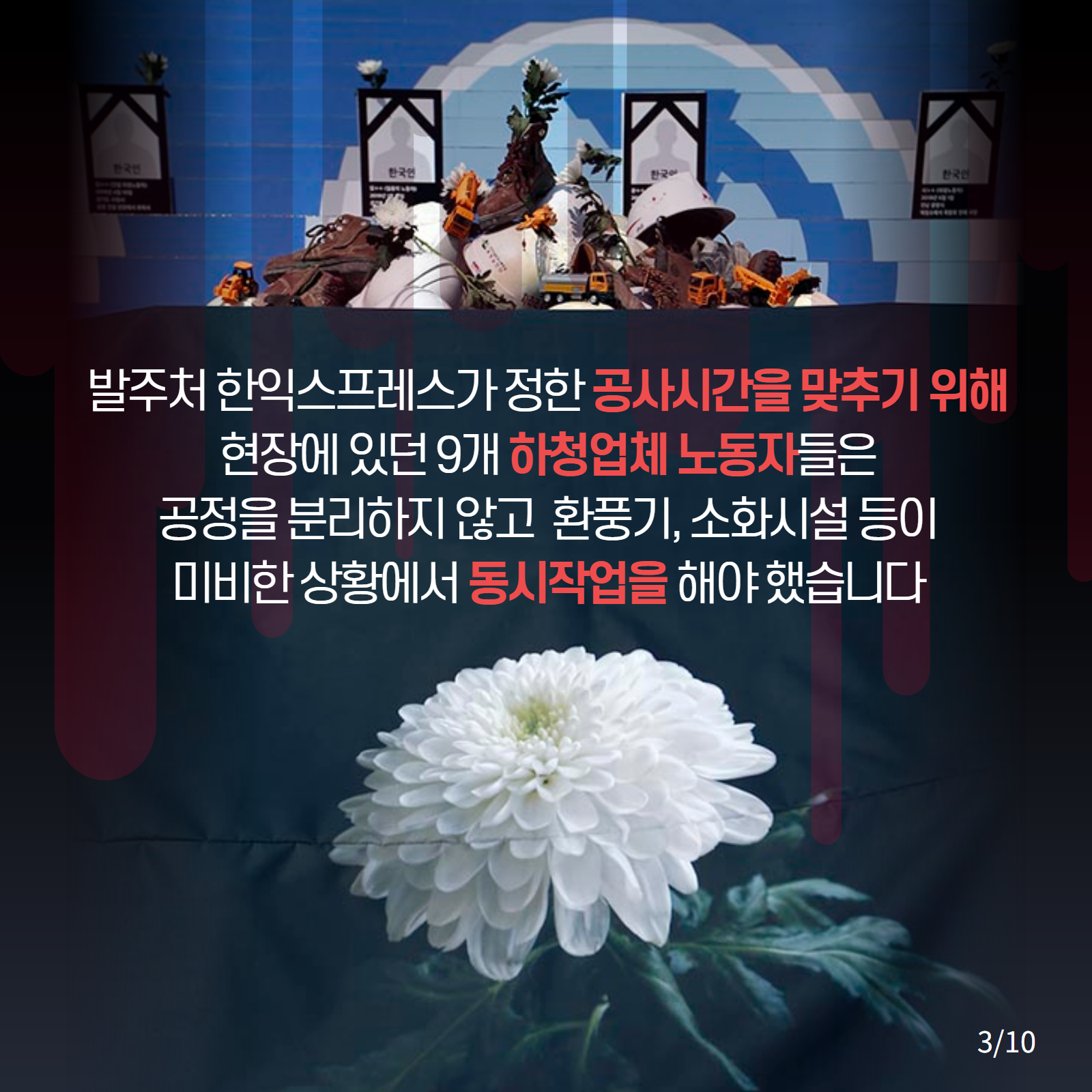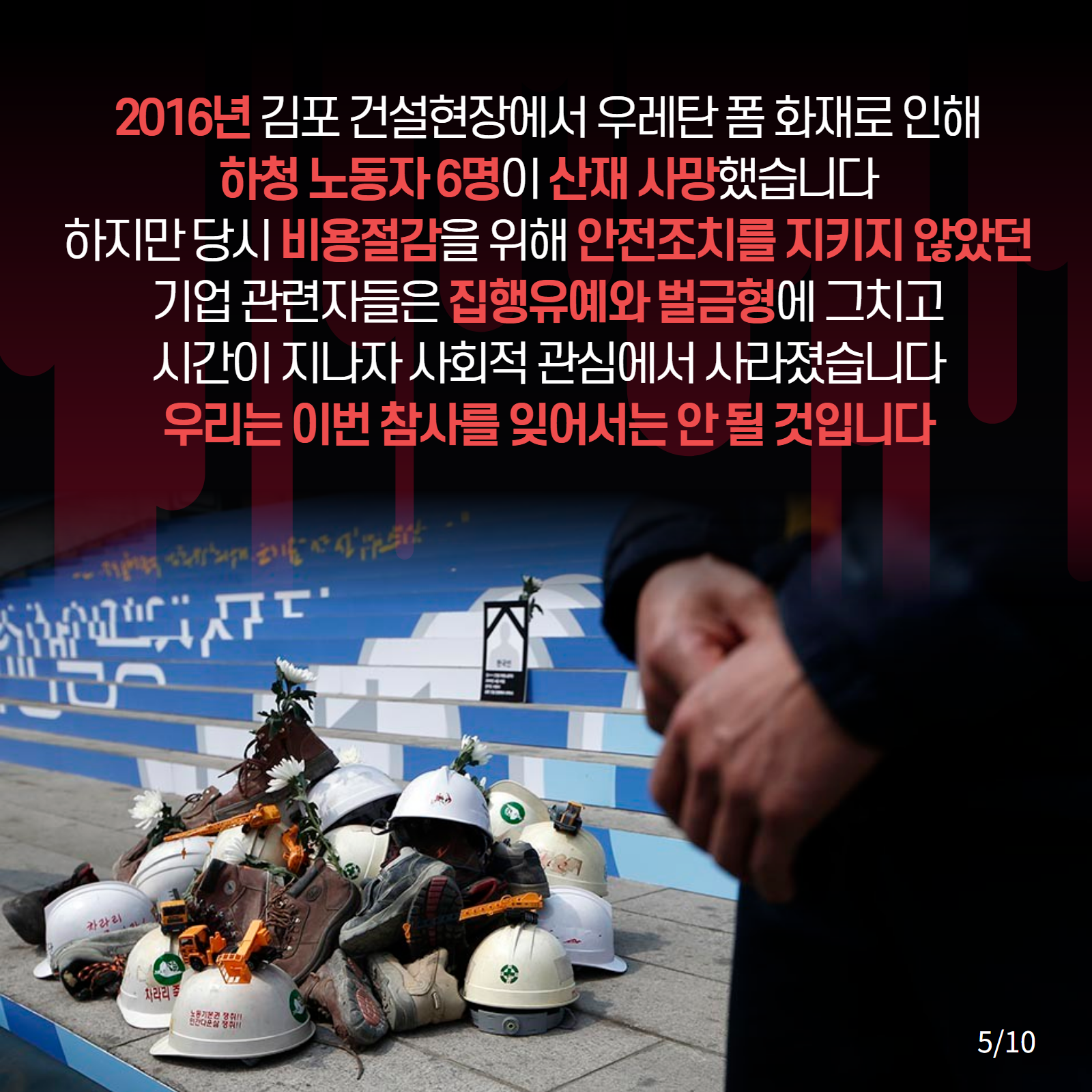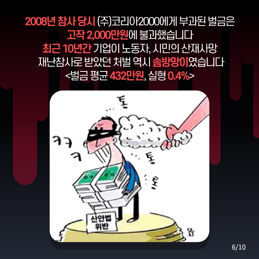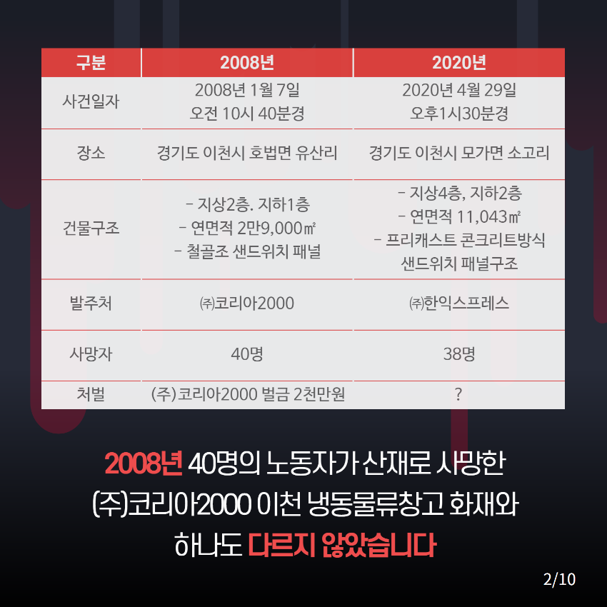 중대재해기업처벌법 제정을 촉구하는 웹자보들을 모았다. 해당 자료들은 산재 사망 사고의 원인으로 지목되는 기업의 안전 불감증과 미흡한 처벌 실태를 비판하고 있다. 김포 건설현장 우레탄폼 화재 사고와 한익스프레스 남이천 물류창고 화재 참사 등 구체적인 사례를 제시하며 법 제정의 필요성을 강조한다. 2008년 코리아2000 냉동물류창고 화재와의 비교를 통해 유사한 사고의 반복을 지적하고, 건설 현장의 안전 확보와 책임자 처벌을 요구한다.