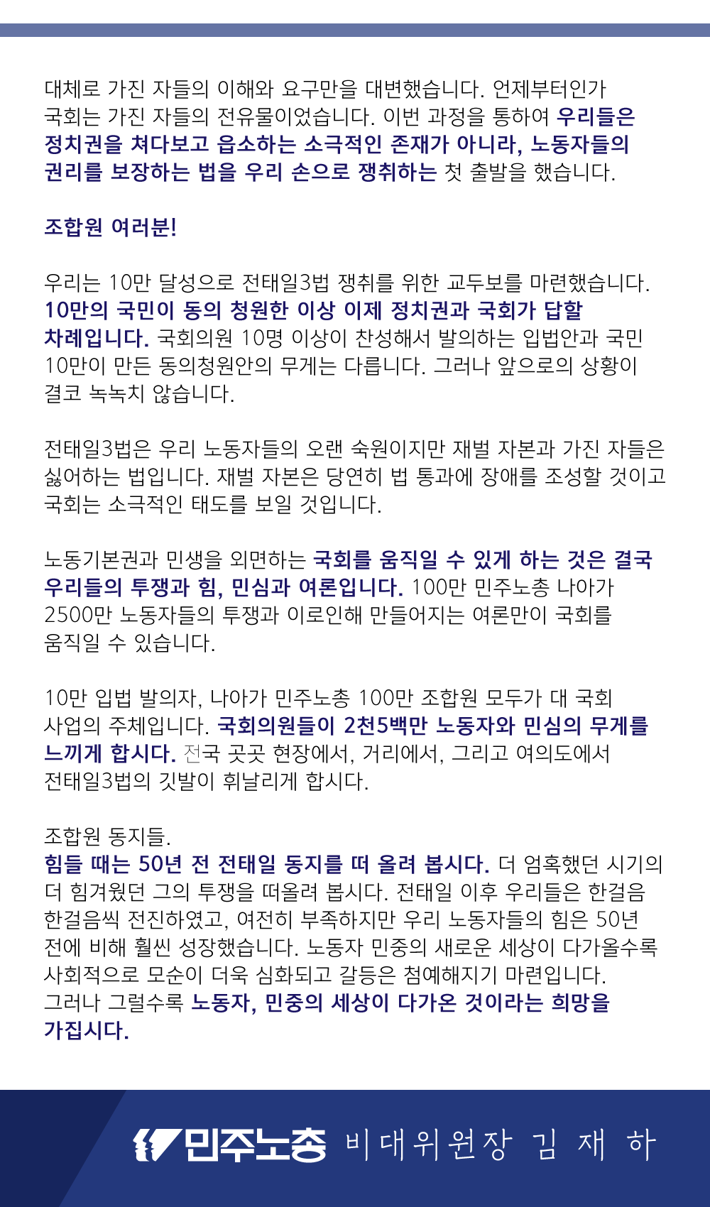 본 성명은 노동자 권리 보장을 위한 투쟁의 시작을 알리고 있다. 10만 명의 국민 청원을 통해 전태일3법 쟁취를 위한 교두보를 마련했음을 강조한다. 재벌 자본의 방해와 국회의 소극적인 태도에 맞서 노동자들의 투쟁과 민심으로 국회를 움직여야 한다고 주장한다. 전태일 정신을 되새기며 노동자, 민중의 세상이 다가온다는 희망을 가지고 투쟁할 것을 촉구한다.