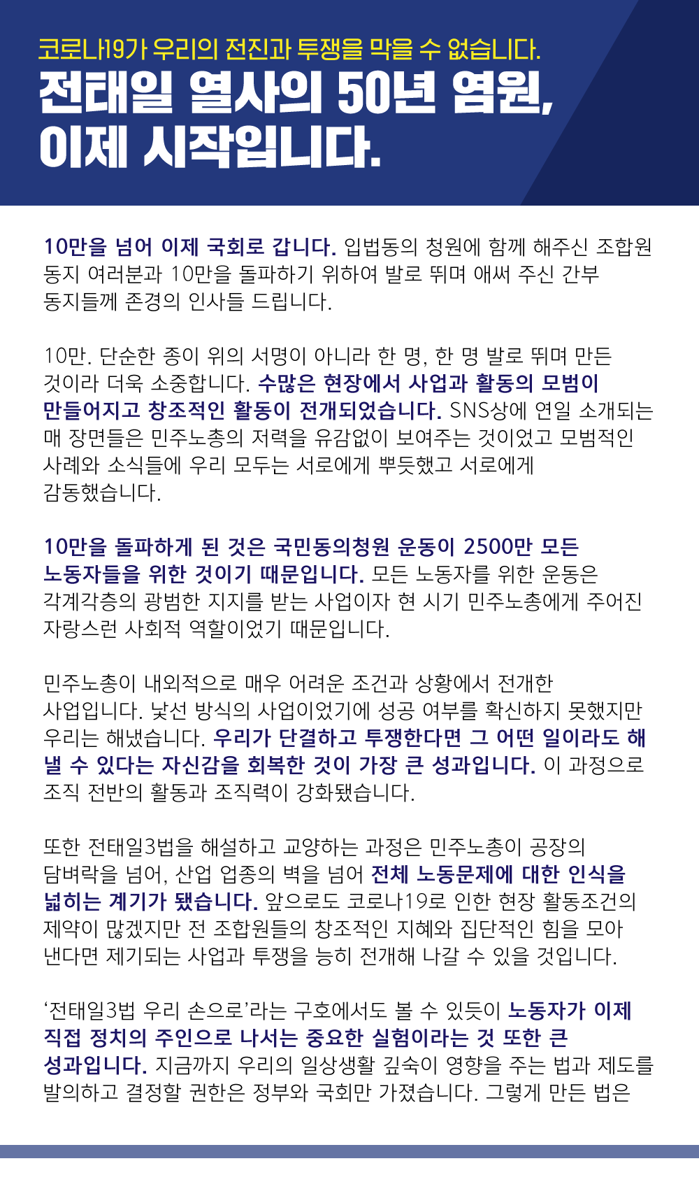 해당 웹자보는 전태일 열사 50주기를 맞아 노동자들의 투쟁을 독려하는 내용을 담고 있다. 10만 명 이상의 국민동의청원 운동을 통해 노동자 권익 향상을 위한 입법 활동을 추진하고 있다. 민주노총은 어려운 여건 속에서도 노동자들의 단결과 투쟁을 통해 자신감을 회복하고 조직력을 강화했다. 전태일 3법을 해설하고 교양하는 과정을 통해 전체 노동문제에 대한 인식을 높이는 계기가 되었다.