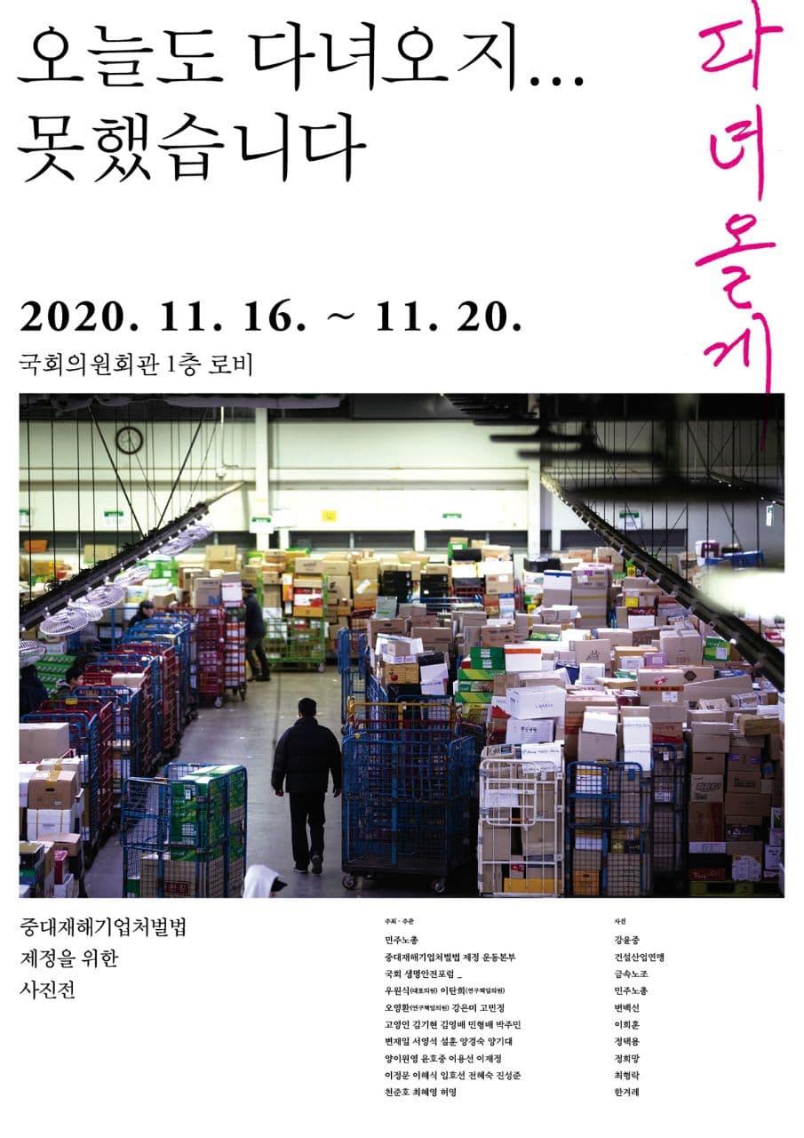 본 사진은 중대재해기업처벌법 제정 촉구를 위한 사진전의 홍보물이다. 사진전은 2020년 11월 16일부터 20일까지 국회의원회관 1층 로비에서 개최되었다. 사진전은 중대재해로 인해 사망한 노동자들을 기리고, 중대재해기업처벌법 제정의 필요성을 알리기 위해 기획되었다. 민주노총, 중대재해기업처벌법 제정 운동본부, 국회 생명안전포럼이 주최 및 주관했다. 강윤중 외 여러 사진작가가 참여했다.